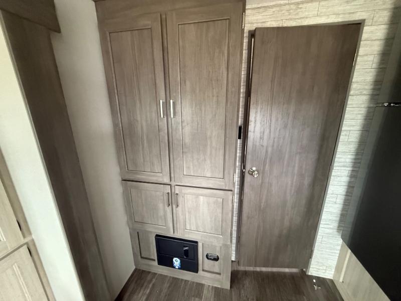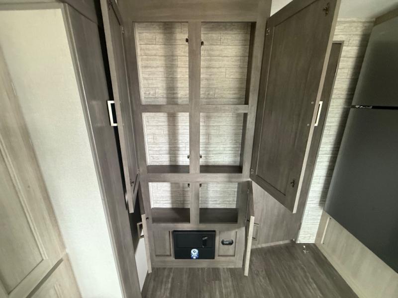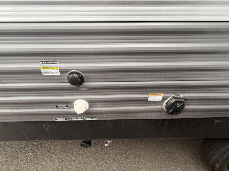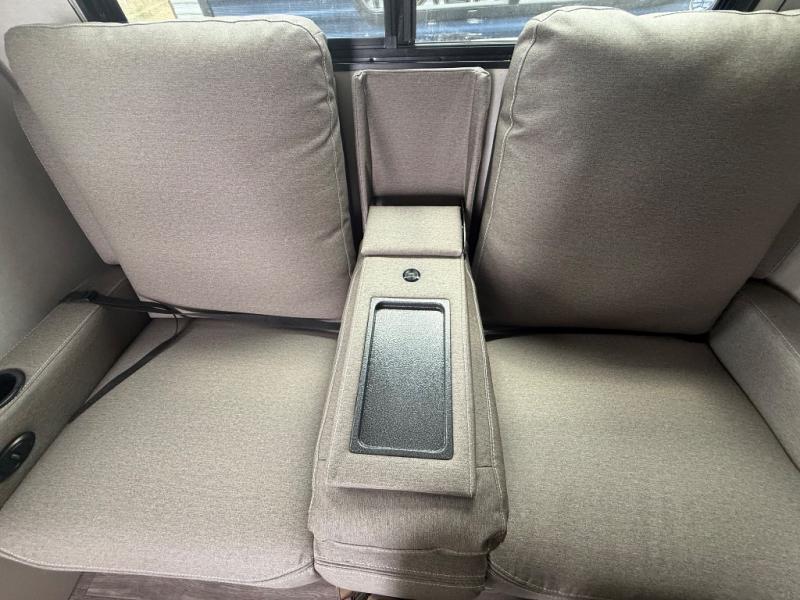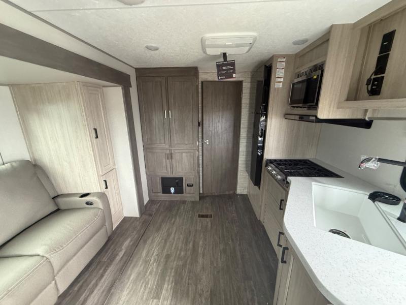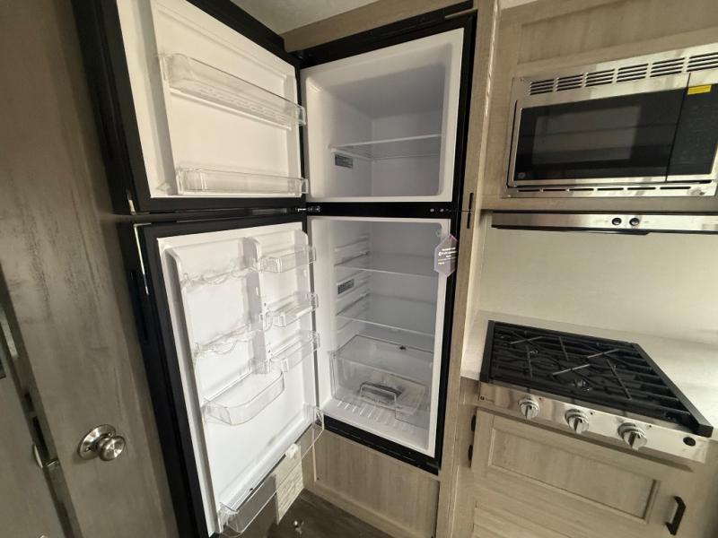 Pack your bags and head to your favorite camping spot with this travel trailer in tow! You can relax on the theater seating slide, dine around the rear U-shaped dinette, or visit outdoors under the 18' power awning. There is also a pass-thru storage outside to bring along fishing poles, camp chairs, and yard games. A full kitchen includes a three burner gas range and microwave oven, along with a 10.7 cu. ft. 12V refrigerator and pantry for food storage. The walk-thru bath will create a front master bedroom you are sure to love, especially with its queen bed, dual bedside wardrobes and an overhead shelf for storage!