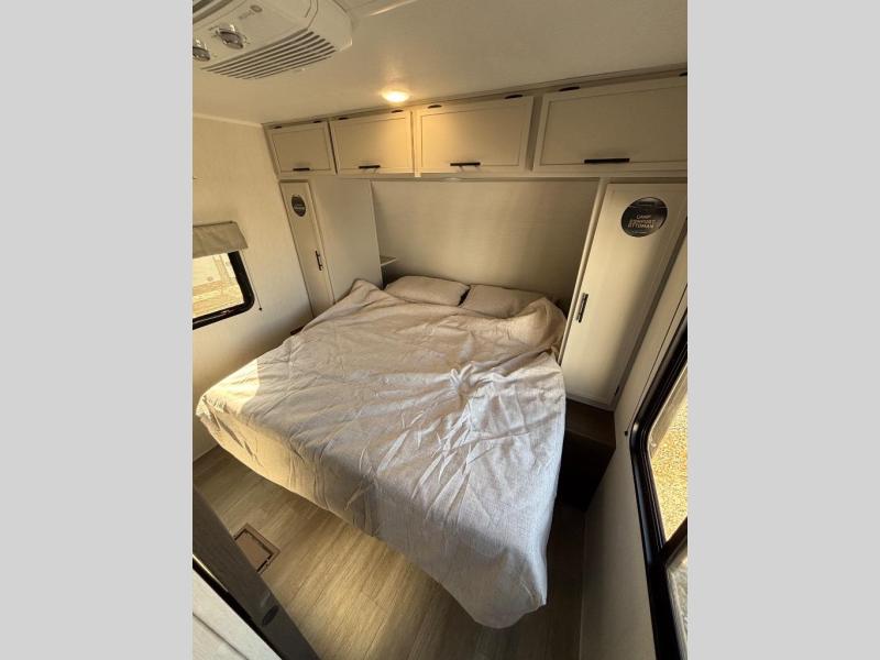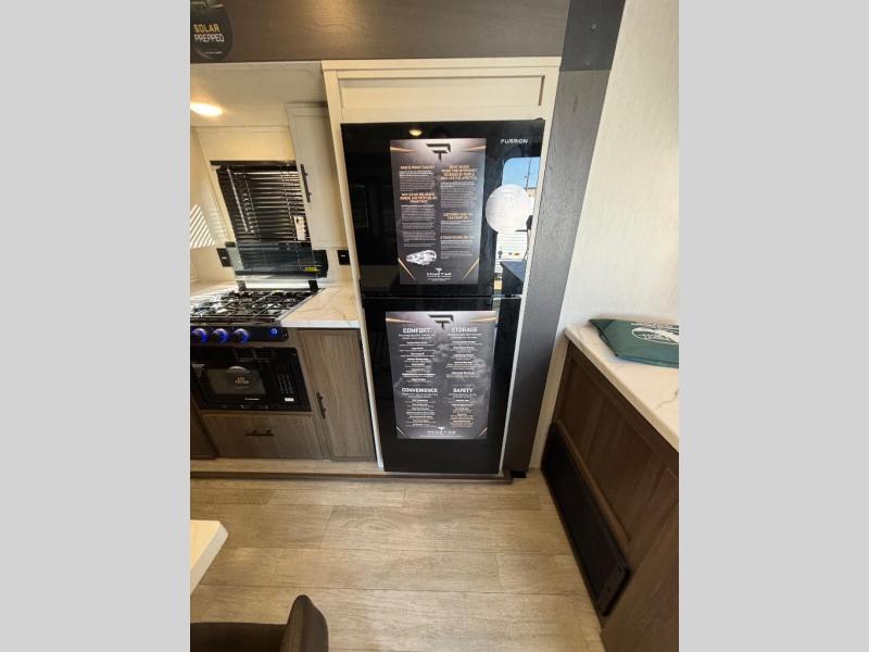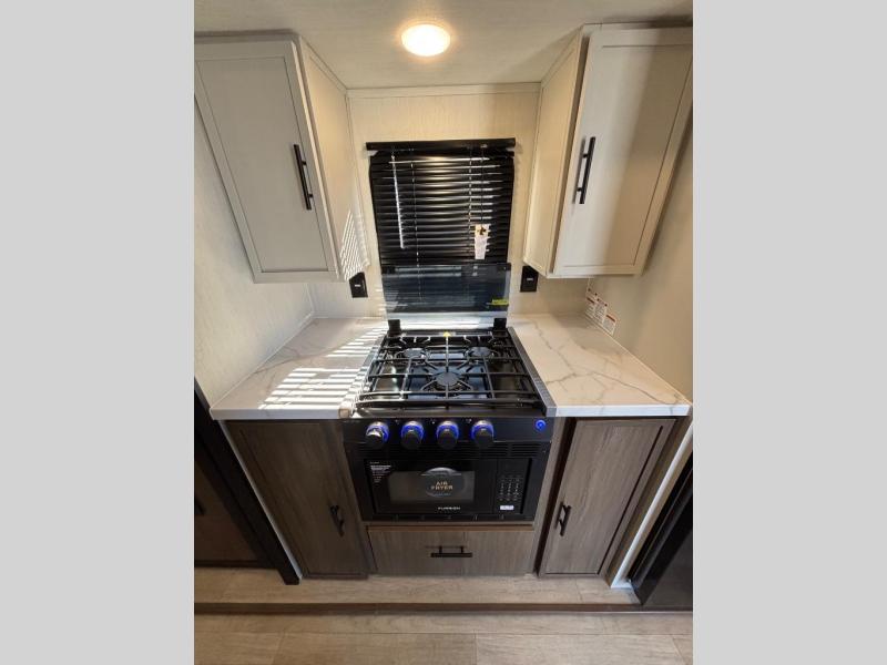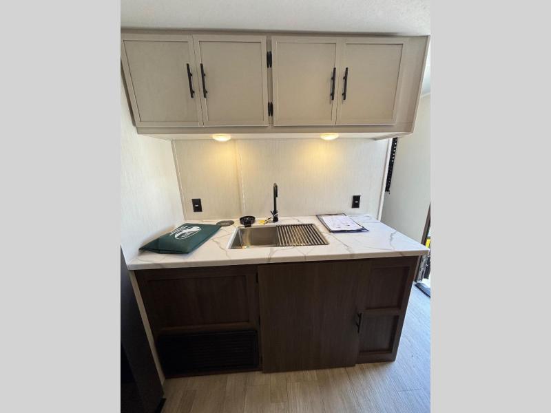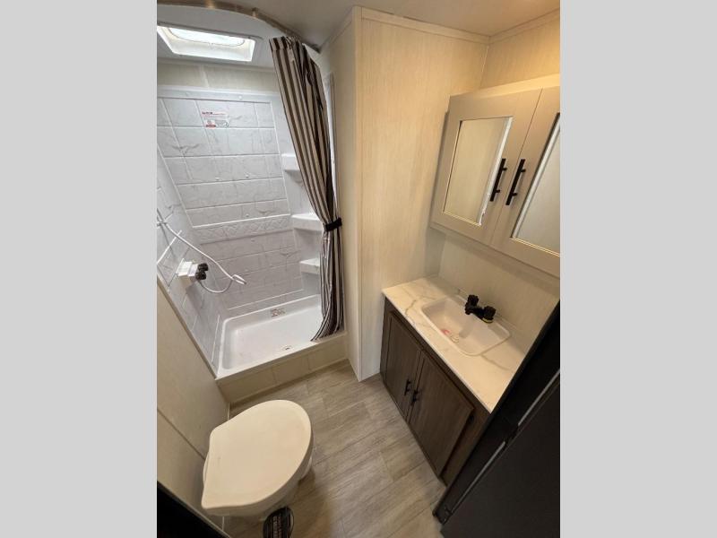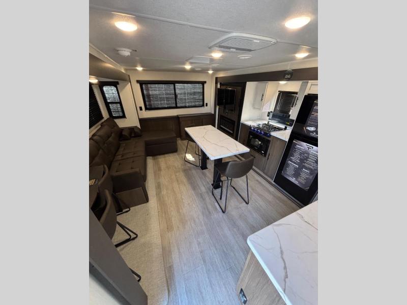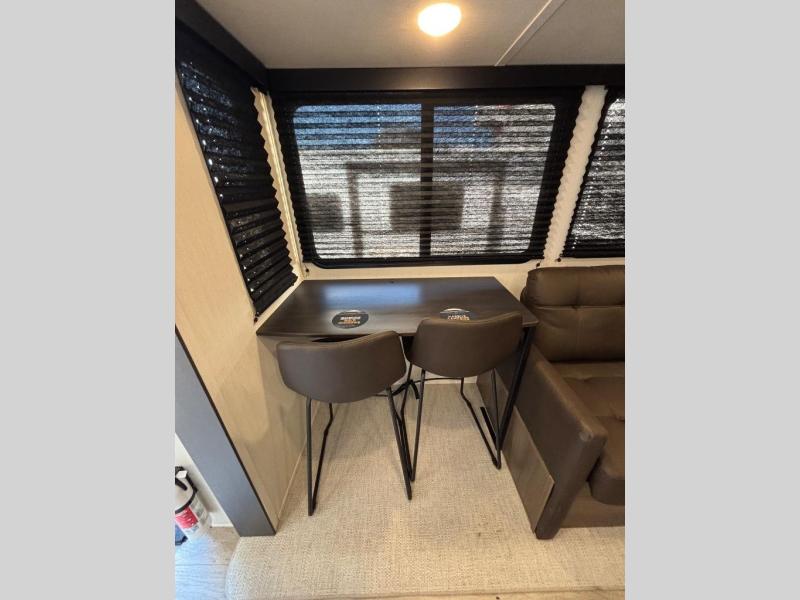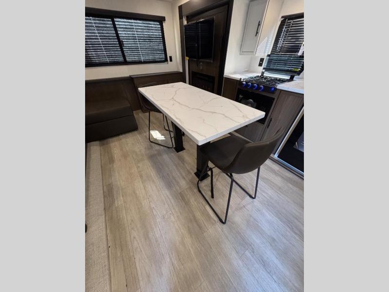 There is ample space to move about in this travel trailer thanks to the dual opposing slides! Here, you'll find an L-shaped sofa with a chaise lounge in direct view of TV and fireplace. There is also a hidden pantry behind the TV for snacks and movies! The center farm table includes four stools so you can gather around for meal times, and the desk with a chair will provide a place for you to get some work done if needed. This unit features a full bath towards the front private bedroom for easy access at night, and you're sure to get a great night's rest on the camp king bed!