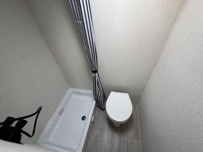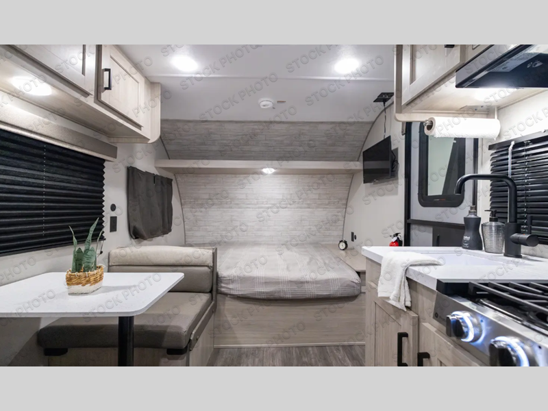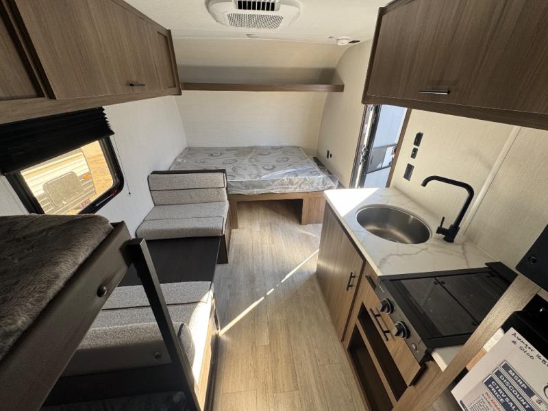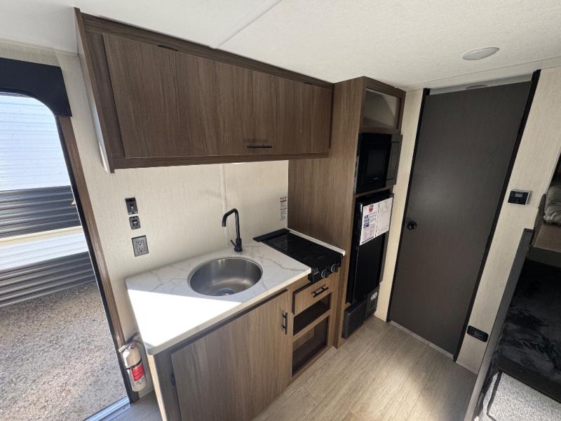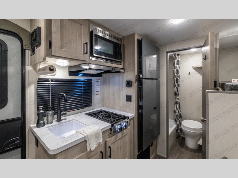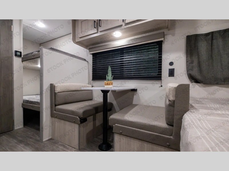 This cozy travel trailer can sleep five, so pack up and head out! You will have a queen bed up front to sleep on each night instead of an air mattress, and the little ones can take the 28" x 70" bunk beds! There is also a booth dinette here that can sleep an additional guest and is perfect for sharing meals during the day. The two burner cooktop and microwave oven means you won't have to cook over a campfire, and the private toilet and shower lets you clean up after a day outdoors. This model includes plenty of storage space, including bedroom storage, an exterior pass-through, plus additional outside storage beneath the bunks for hiking gear!