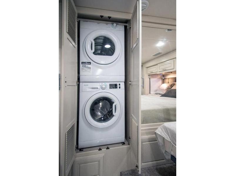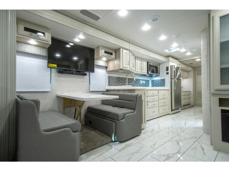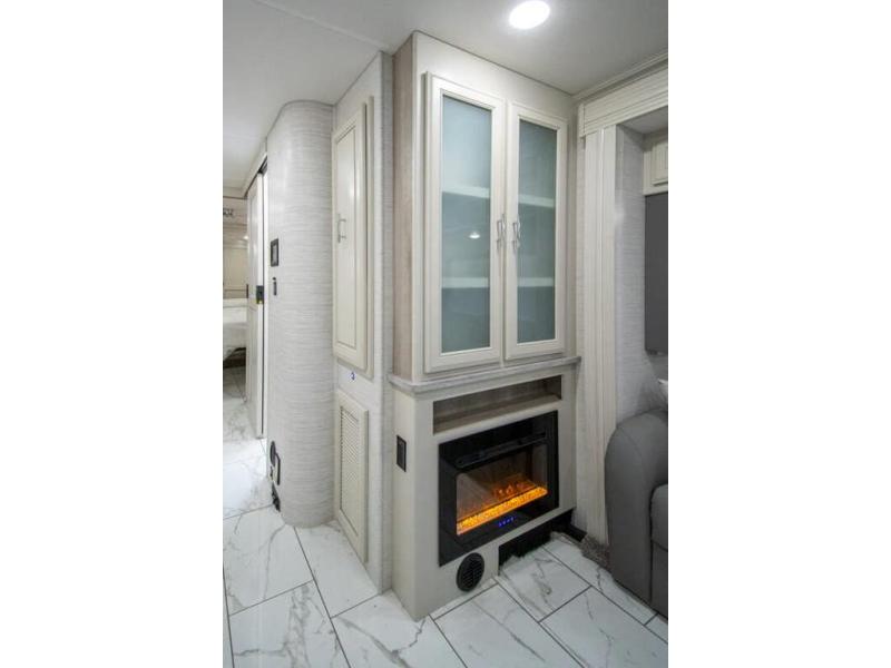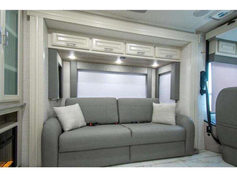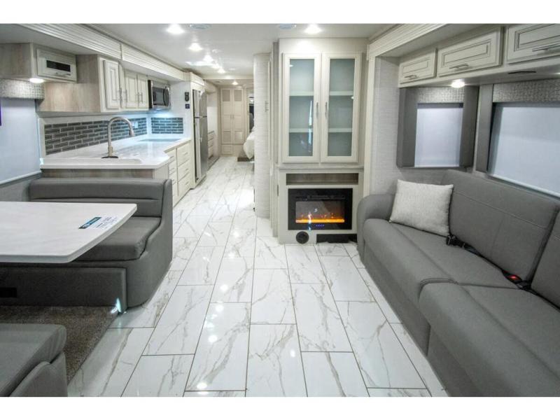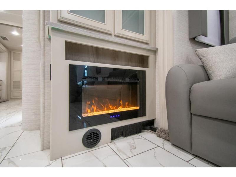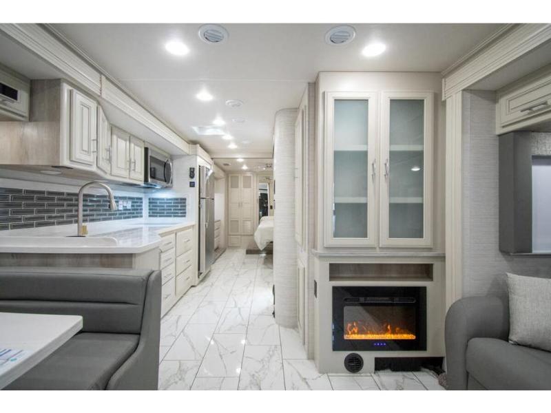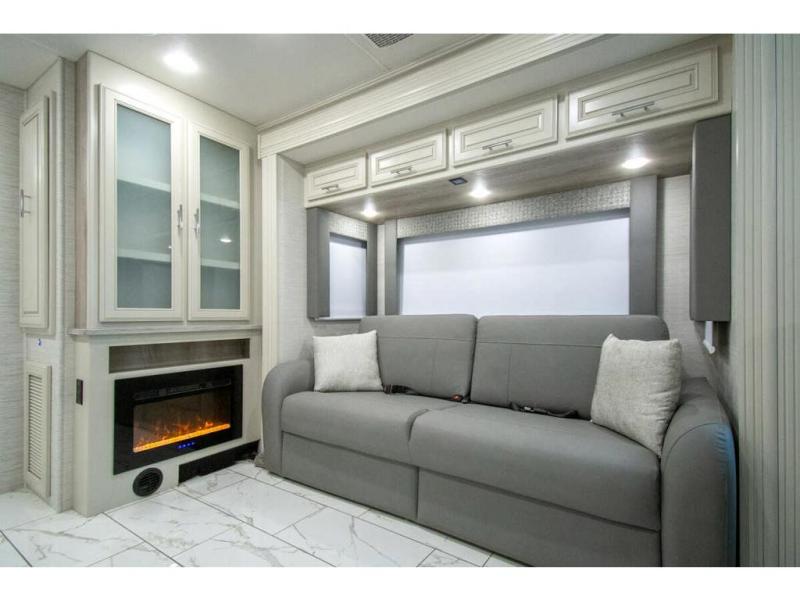 Fall in love with adventure when you travel in this triple slide out coach. Your crew can relax on the sofa slide out, or at the soft touch Dream booth dinette that includes storage underneath. You will enjoy the 43" LED TV across from the sofa, plus there is a 32" overhead TV as well. The fireplace makes this area feel even more like home! The kitchen includes everything you would find at home, including a 30" over-the-range convection microwave, a two burner electric induction cooktop, plus a double door residential refrigerator. You and your spouse will have the rear private bedroom all to yourselves with a slide out Tilt-A-View king bed, a large wardrobe, plus a dresser and a 32" LED TV. And a stackable washer and dryer makes wash day easy as 1-2-3!