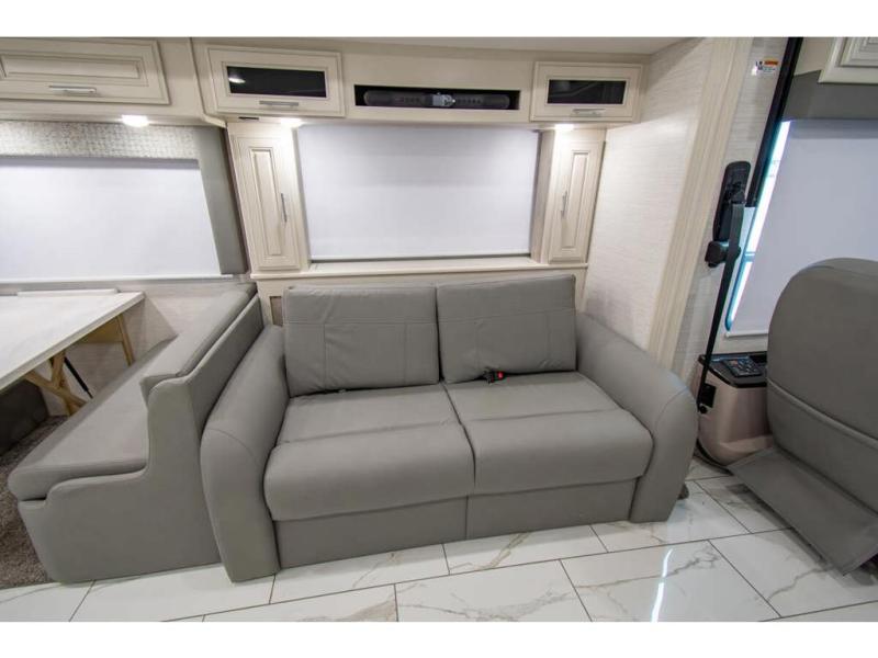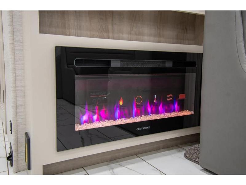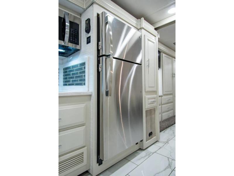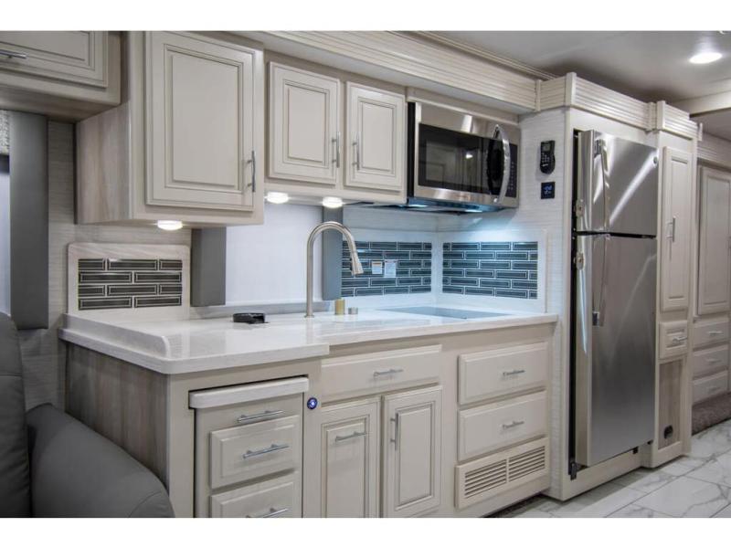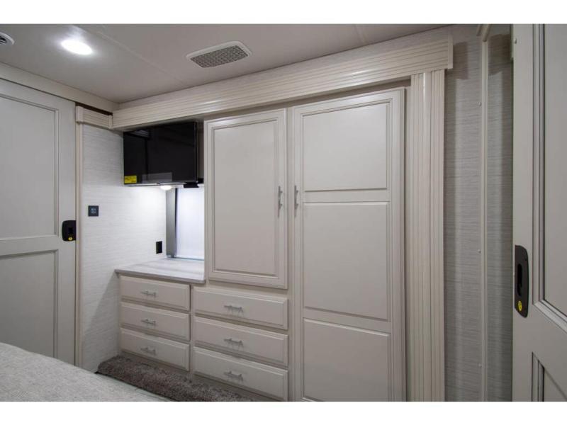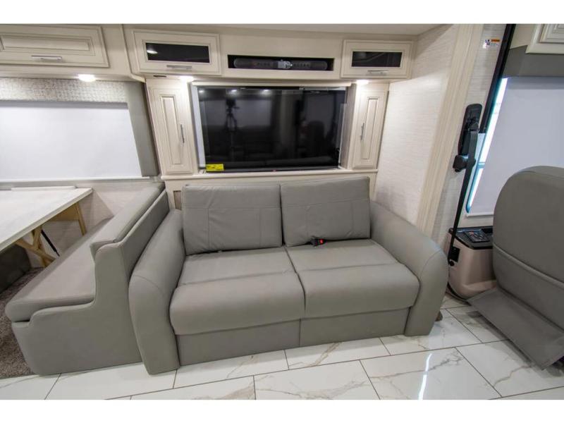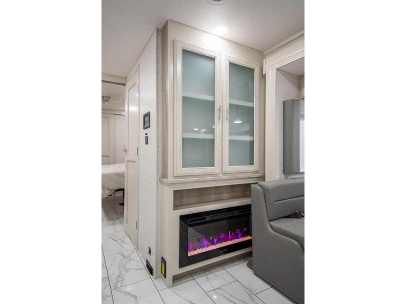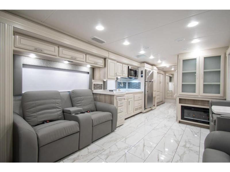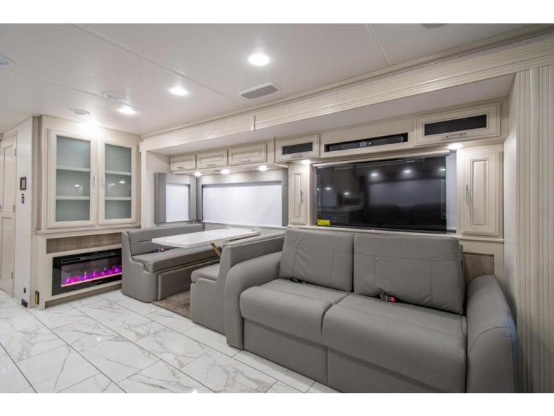 Triple slides plus a bath and a half means more guests can tag along in this comfortable coach. The master bedroom features a dresser base and a wardrobe, plus a 32" bedroom TV to watch your favorite shows at night. You will love the full rear bath that includes a spacious shower, cabinet storage, and a stackable washer and dryer. The main living area will feel more like home with a fireplace, two sofas, a booth dinette, and a 50" LED TV. This coach also includes a double door residential refrigerator, an over-the-range convection microwave, plus a large pantry to store snacks and paper goods.