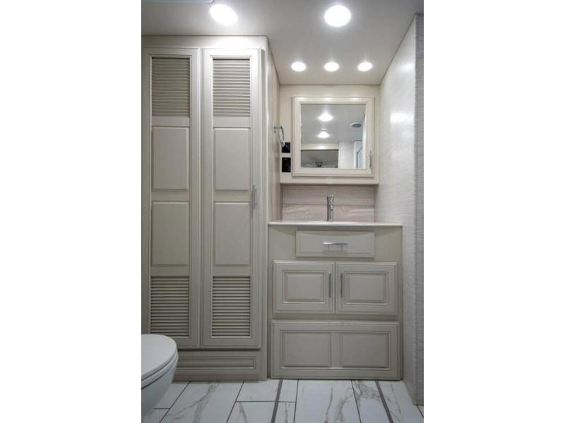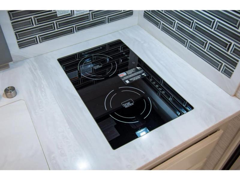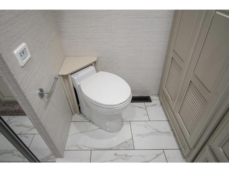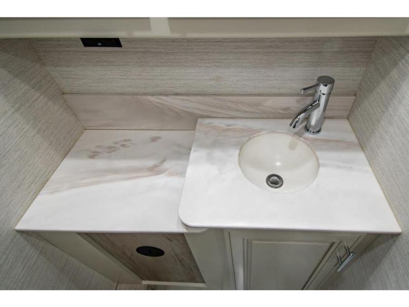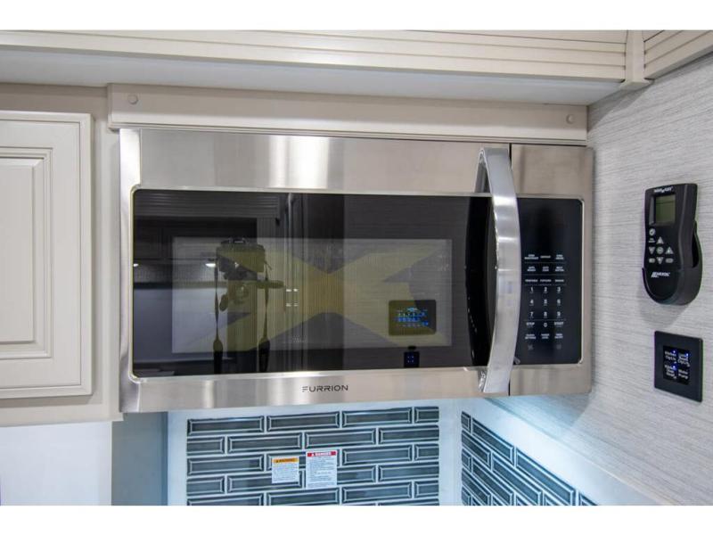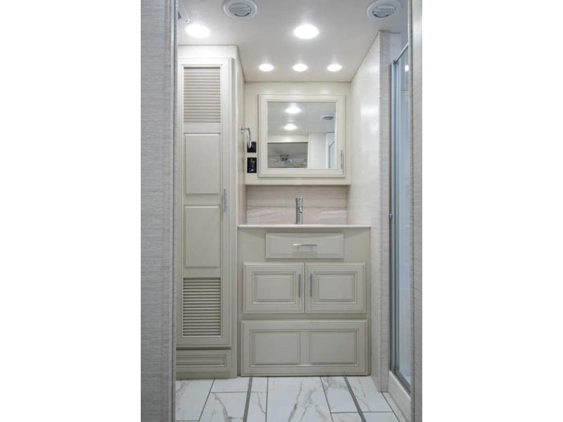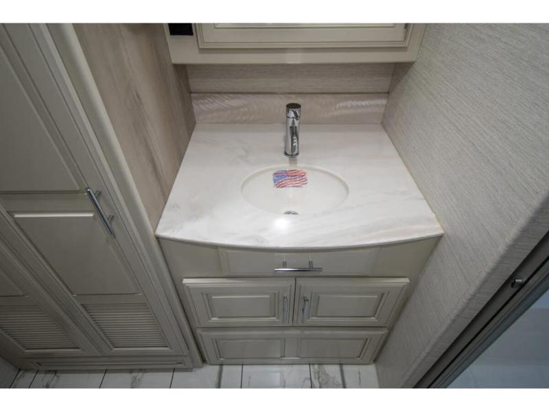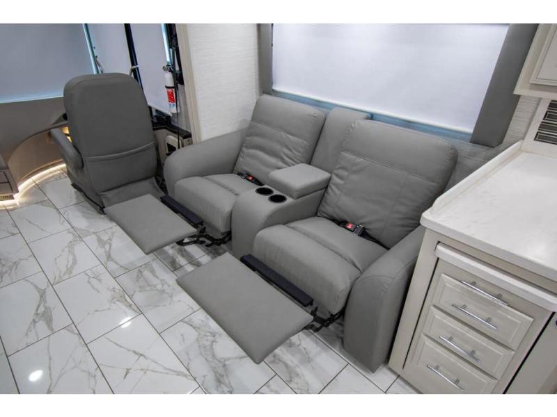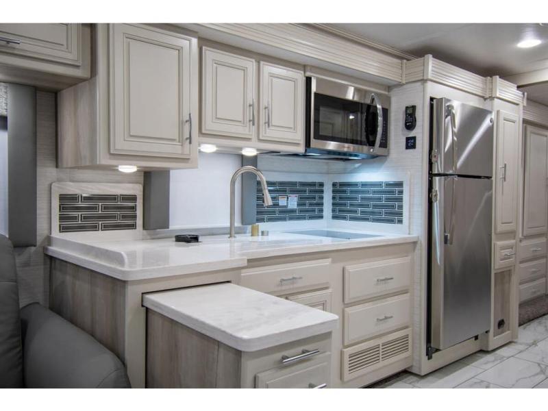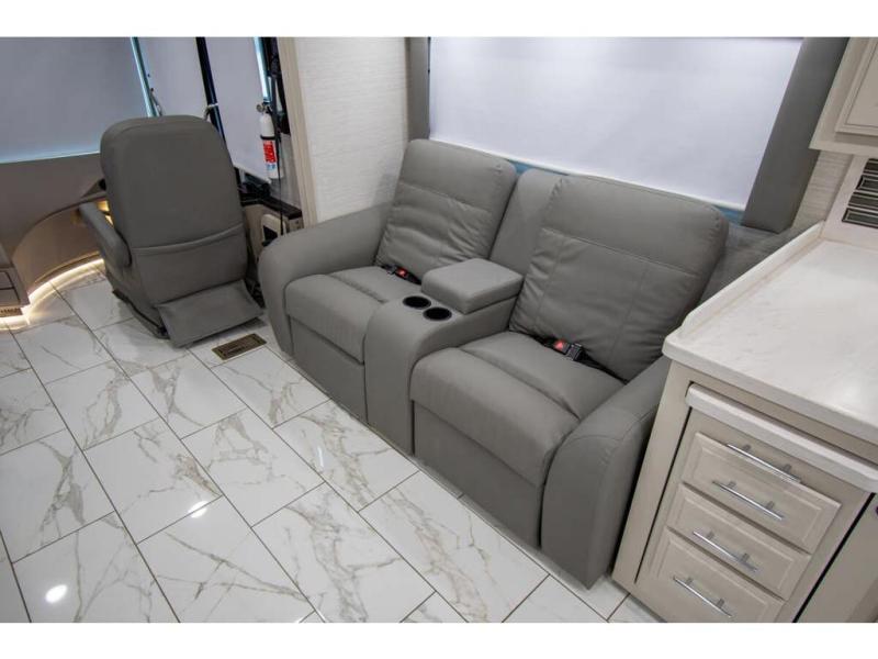 Triple slides plus a bath and a half means more guests can tag along in this comfortable coach. The master bedroom features a dresser base and a wardrobe, plus a 32" bedroom TV to watch your favorite shows at night. You will love the full rear bath that includes a spacious shower, cabinet storage, and a stackable washer and dryer. The main living area will feel more like home with a fireplace, two sofas, a booth dinette, and a 50" LED TV. This coach also includes a double door residential refrigerator, an over-the-range convection microwave, plus a large pantry to store snacks and paper goods.