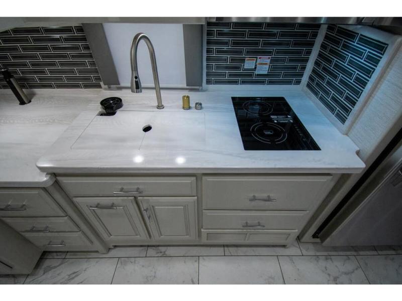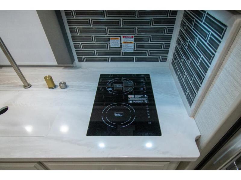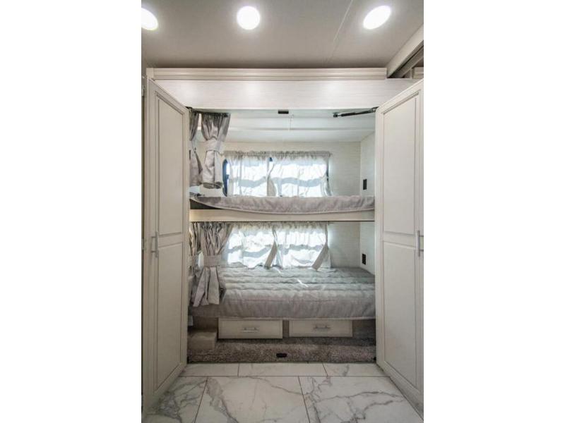 Nothing says comfort like triple slides, two full baths, plus bunk beds! You'll enjoy all that and more in this cozy coach. The large wardrobe/bunk beds are right across from one of the full baths for convenience, and the other full bath is tucked away in the back for privacy. There is a king bed slide out in the master bedroom, as well as a 32'' LED TV and a bedroom ceiling fan to keep the air flowing. The little ones will love the overhead bunk lift, and any other guests can sleep on the hide-a-bed sofa or the booth dinette. When it comes time to cook meals, the two burner electric induction cooktop and convection microwave will get the job done, and the residential refrigerator can store all the perishables.