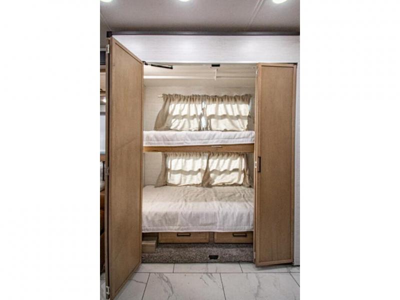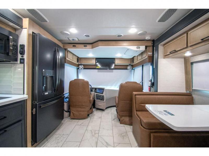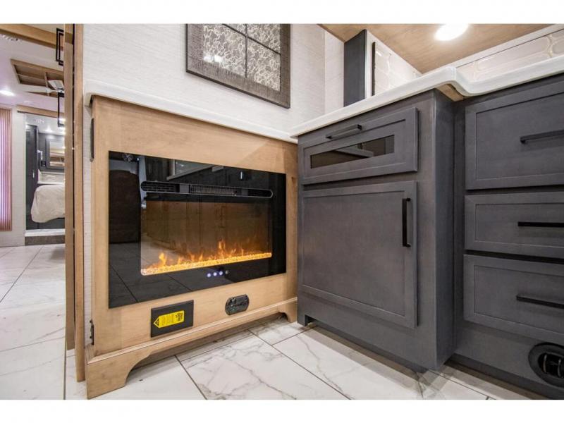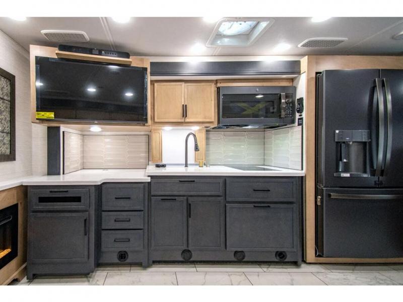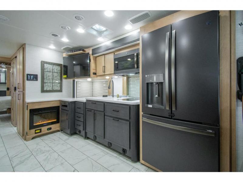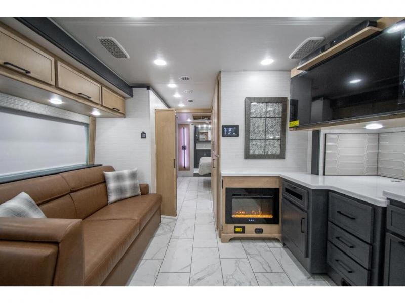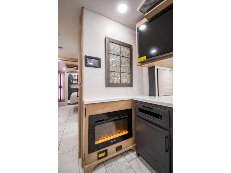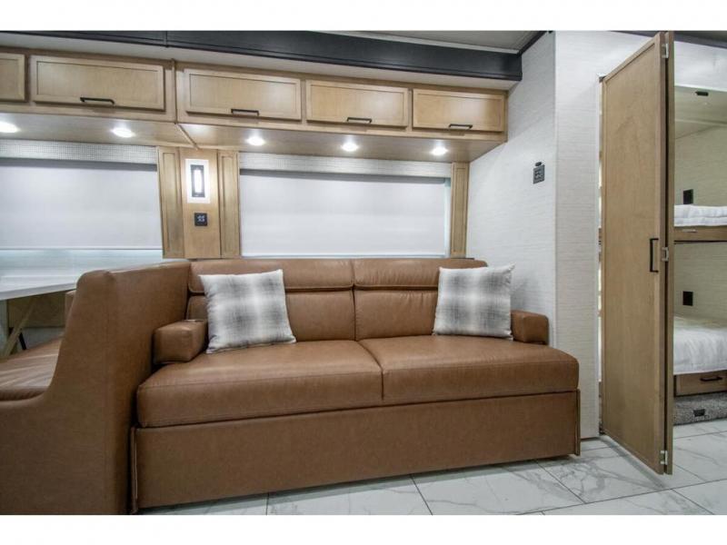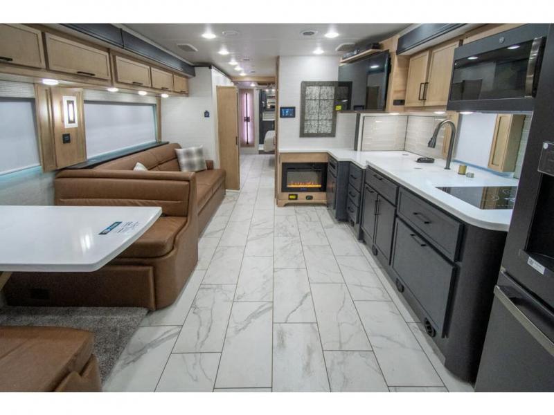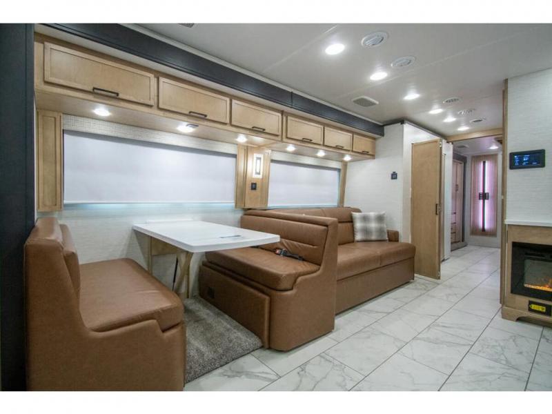 Experience a home away from home with this motorhome! The whole family will have a comfortable place to sleep between the bunk lift above the cab, the 72" x 80" king bed, the set of 30" x 73" bunk beds, the jackknife sofa, and even the booth dinette once converted. Storage space isn't lacking with overhead cabinets throughout, kitchen pantry, and bedroom wardrobe. The full rear bathroom has a shower and a washer and dryer, and the second full bathroom also has a shower so everyone can get ready two times faster. The porcelain tile flooring throughout will be easy to clean and the fireplace creates the perfect relaxing evening indoors. Watch the big game at the exterior entertainment center while staying protected by the 18' Carefree latitude awning with LED lights and wind sensor!