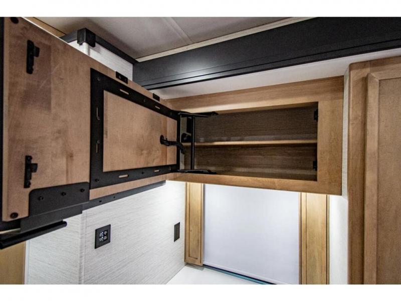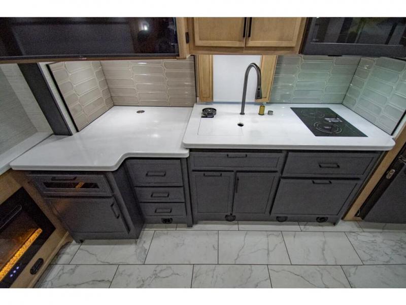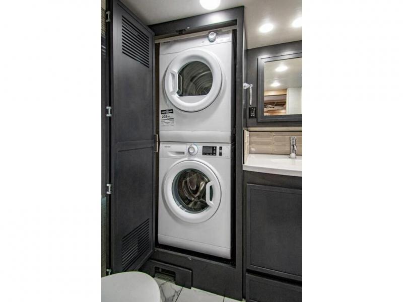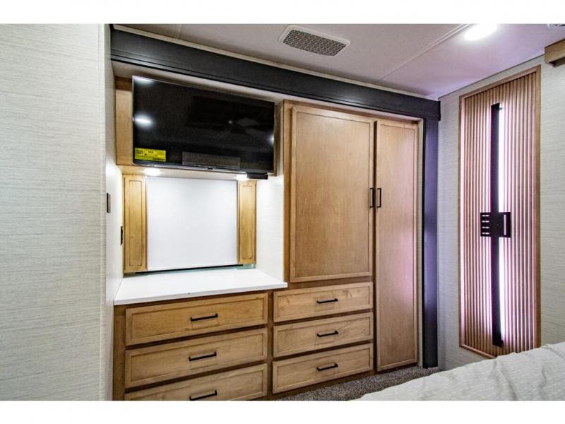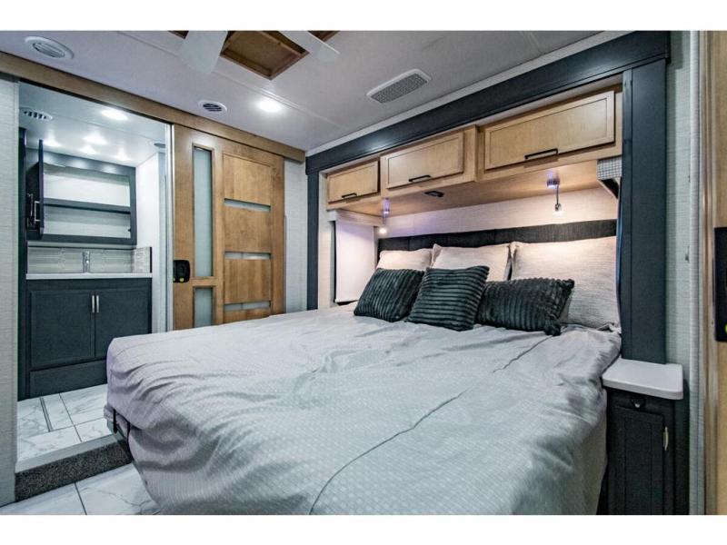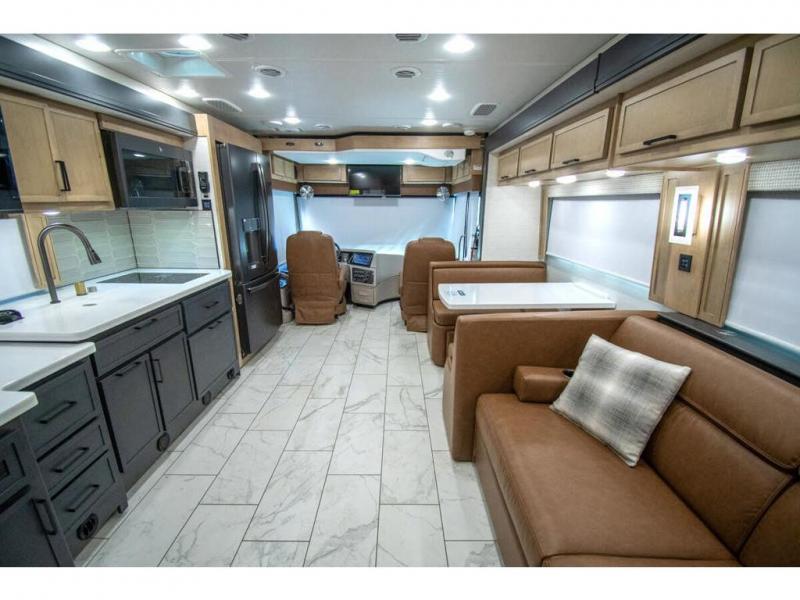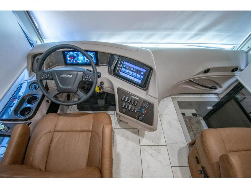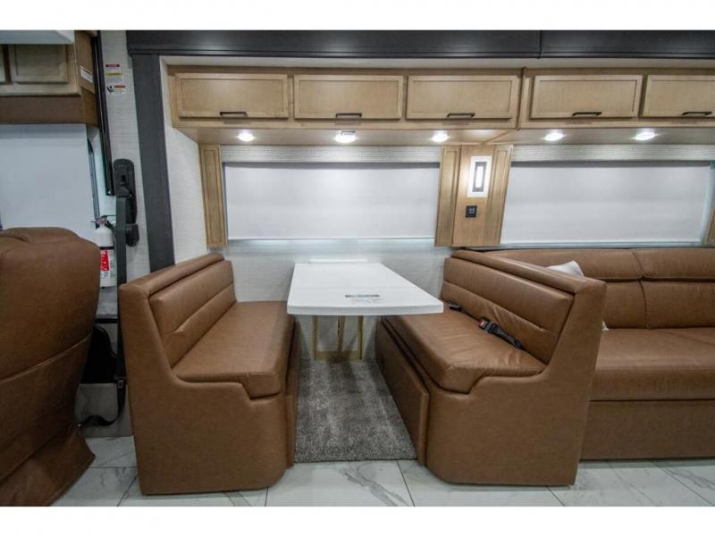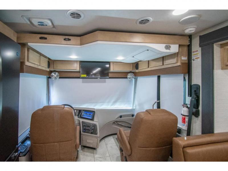 Experience a home away from home with this motorhome! The whole family will have a comfortable place to sleep between the bunk lift above the cab, the 72" x 80" king bed, the set of 30" x 73" bunk beds, the jackknife sofa, and even the booth dinette once converted. Storage space isn't lacking with overhead cabinets throughout, kitchen pantry, and bedroom wardrobe. The full rear bathroom has a shower and a washer and dryer, and the second full bathroom also has a shower so everyone can get ready two times faster. The porcelain tile flooring throughout will be easy to clean and the fireplace creates the perfect relaxing evening indoors. Watch the big game at the exterior entertainment center while staying protected by the 18' Carefree latitude awning with LED lights and wind sensor!