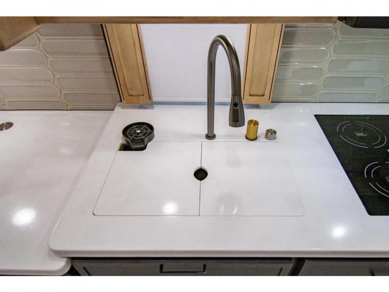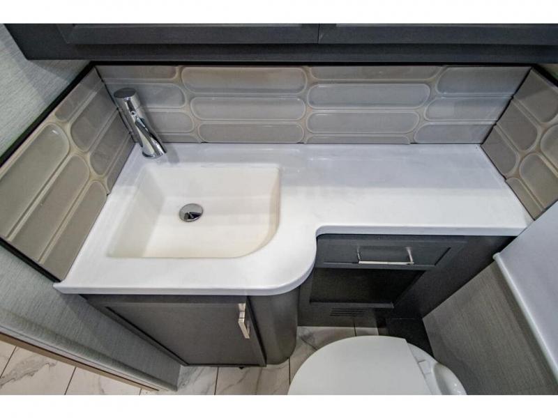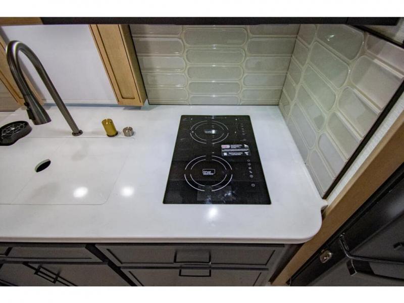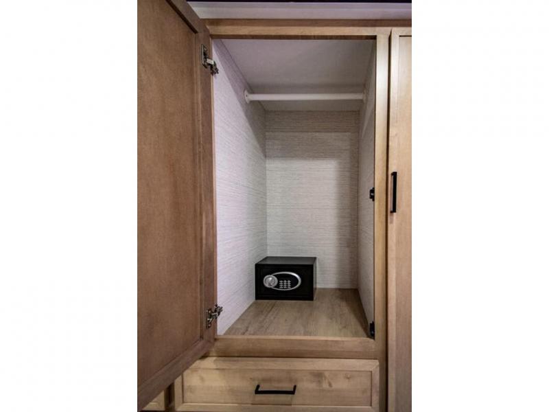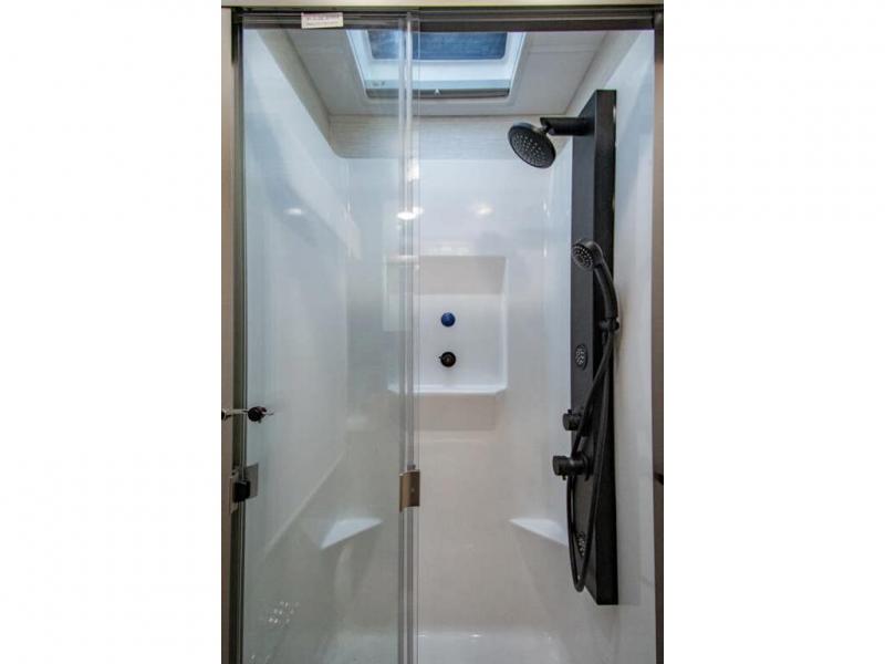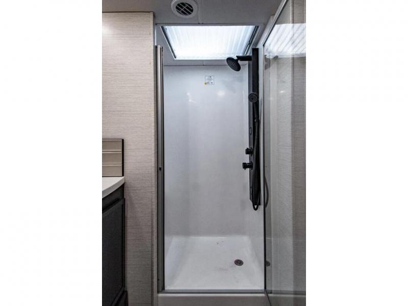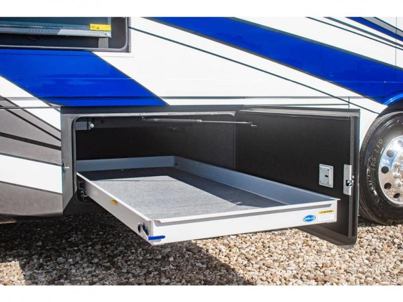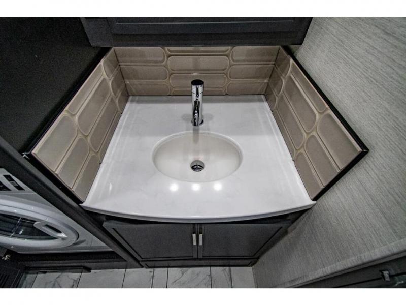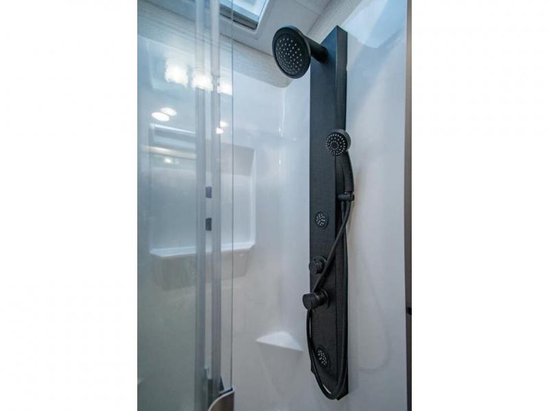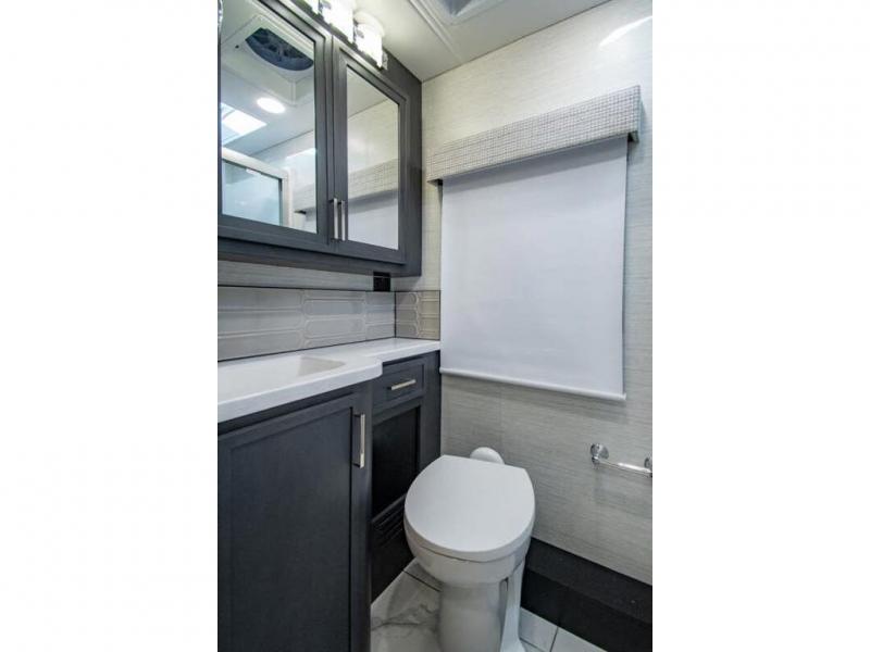 Experience a home away from home with this motorhome! The whole family will have a comfortable place to sleep between the bunk lift above the cab, the 72" x 80" king bed, the set of 30" x 73" bunk beds, the jackknife sofa, and even the booth dinette once converted. Storage space isn't lacking with overhead cabinets throughout, kitchen pantry, and bedroom wardrobe. The full rear bathroom has a shower and a washer and dryer, and the second full bathroom also has a shower so everyone can get ready two times faster. The porcelain tile flooring throughout will be easy to clean and the fireplace creates the perfect relaxing evening indoors. Watch the big game at the exterior entertainment center while staying protected by the 18' Carefree latitude awning with LED lights and wind sensor!
