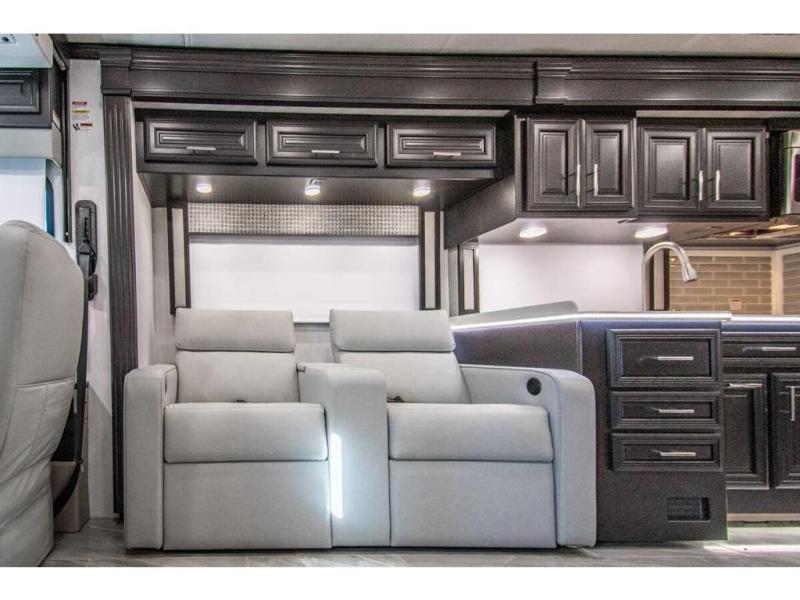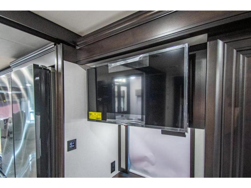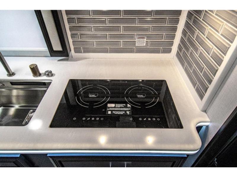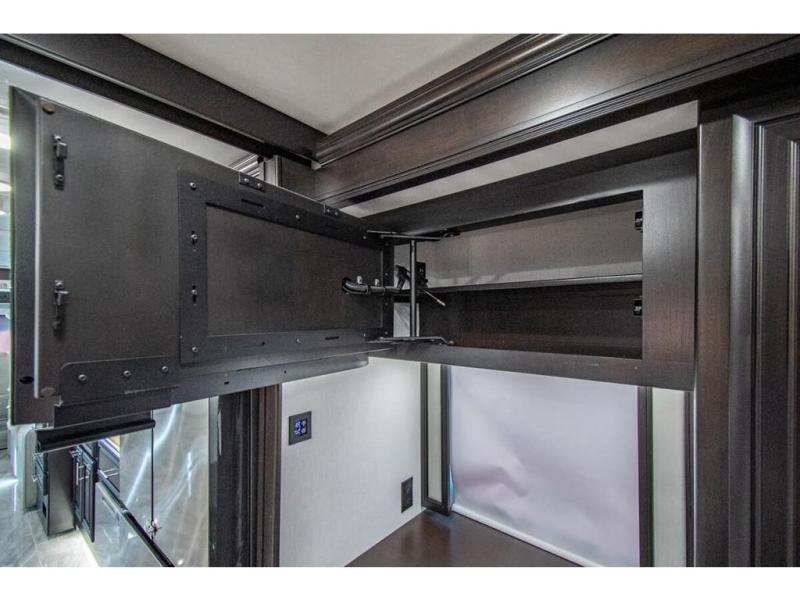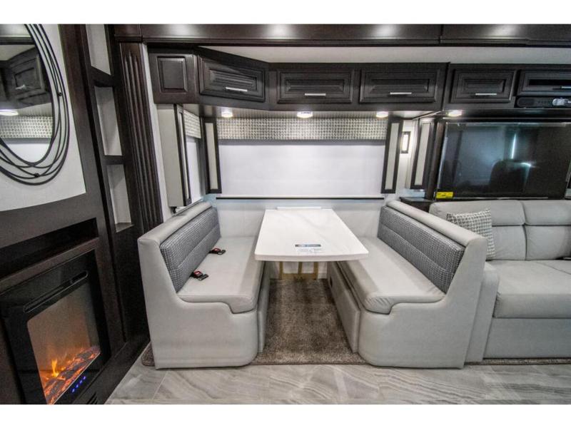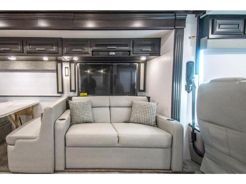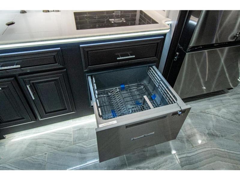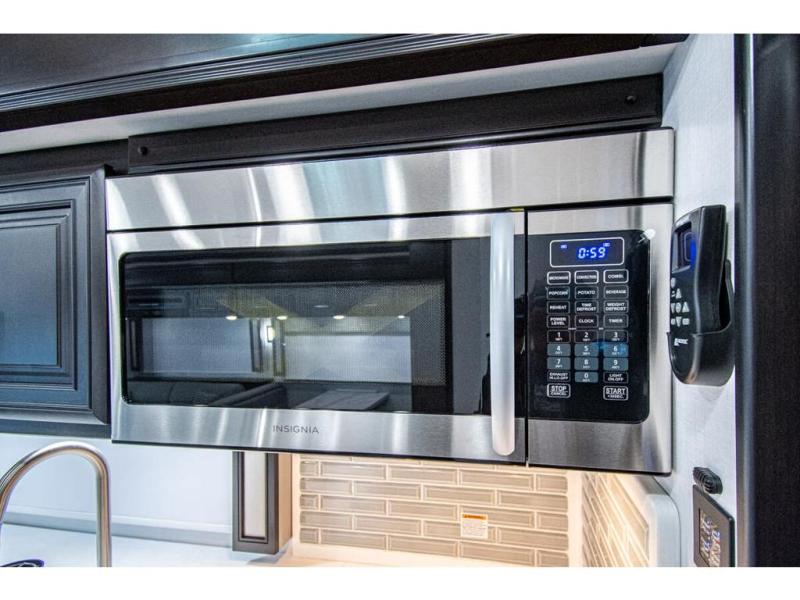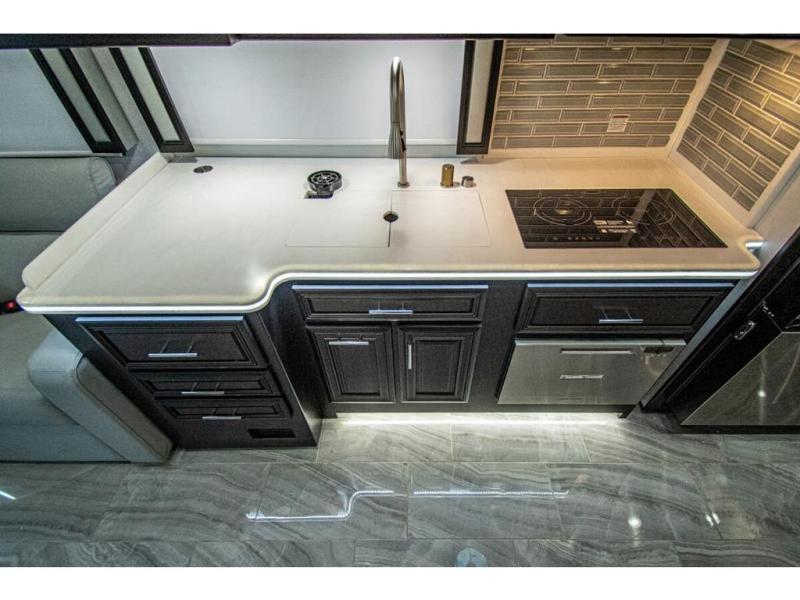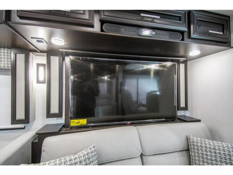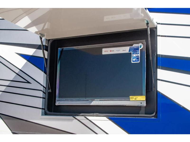 You will find comfort all throughout this motorhome, from the bunk lift over the cab with a 32" LED TV to the full rear bathroom with a stackable washer and dryer and dual bath sinks. There is plenty of entertainment throughout the inside with LED TVs and the outside with an exterior entertainment center with a 40" LED TV, Bluetooth radio, and speakers to crank up the tunes. The chef will have an easy time preparing their meals with the two burner induction cooktop and can keep their ingredients fresh with the 23 cu. ft. French door residential refrigerator, plus there is a 30" over the range convection microwave for those nights when you don't feel like cooking. The booth dinette is a great place to enjoy your meals, play card games, and even transform into an extra sleeping space. The hide-a-bed sofa and second sofa also offer comfortable sleeping spaces if needed!