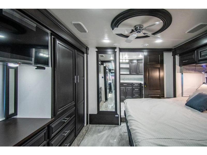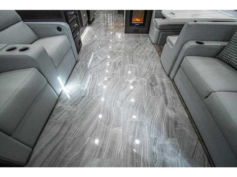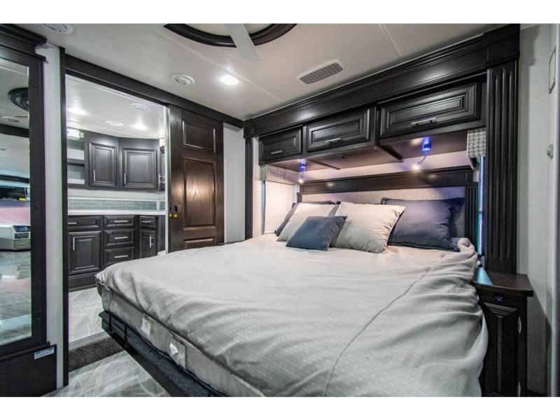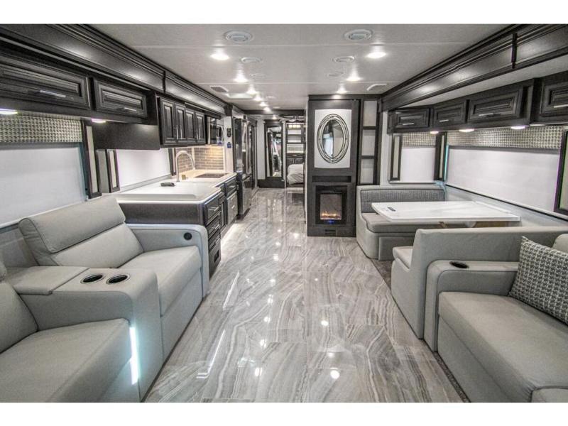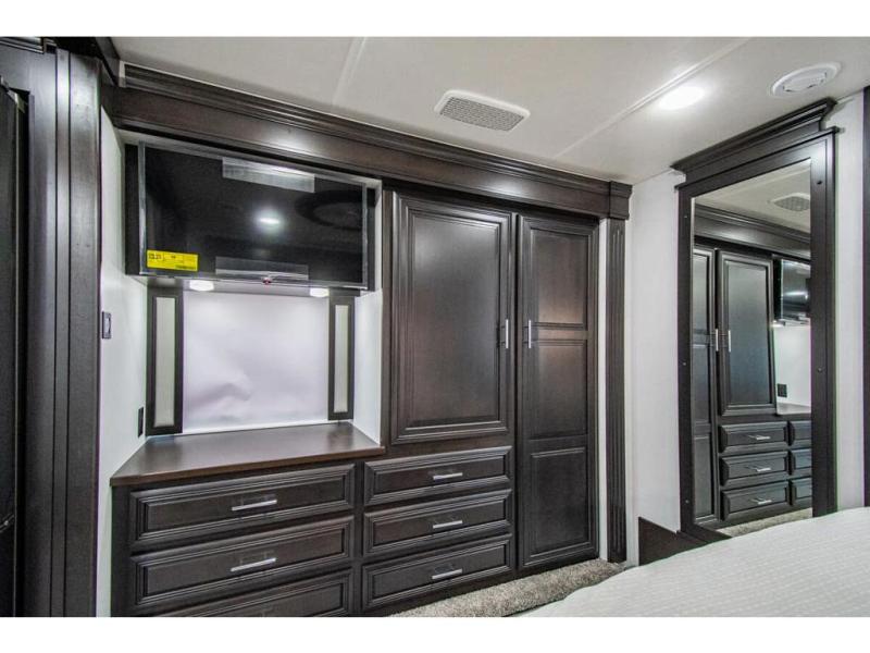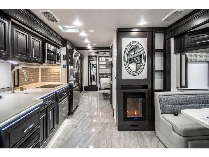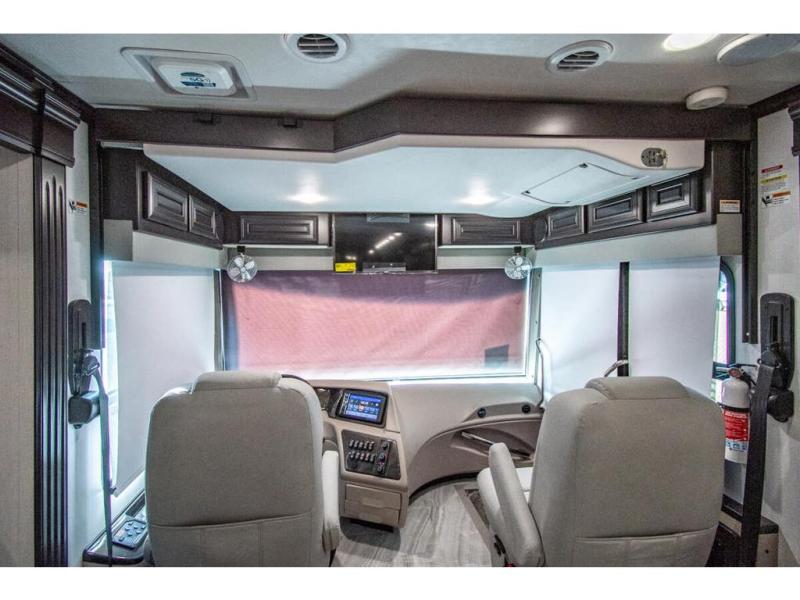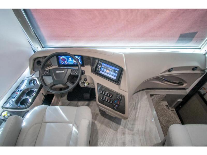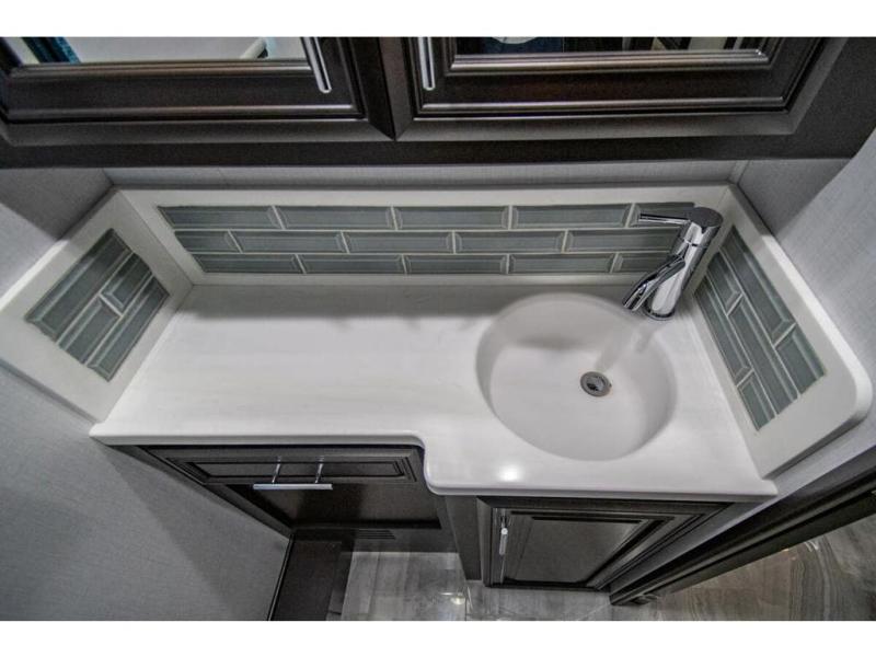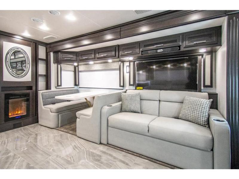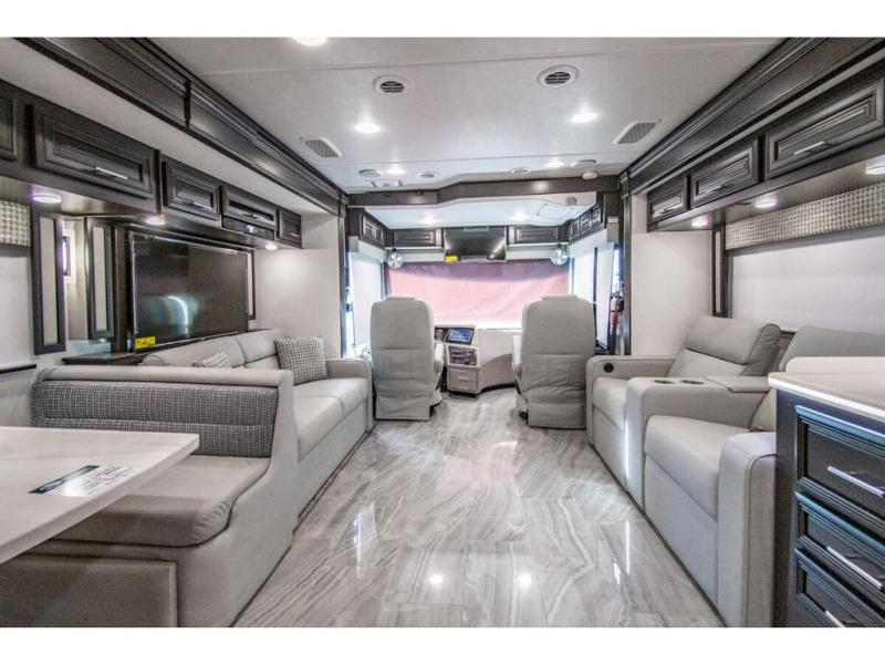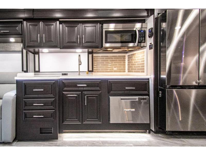 You will find comfort all throughout this motorhome, from the bunk lift over the cab with a 32" LED TV to the full rear bathroom with a stackable washer and dryer and dual bath sinks. There is plenty of entertainment throughout the inside with LED TVs and the outside with an exterior entertainment center with a 40" LED TV, Bluetooth radio, and speakers to crank up the tunes. The chef will have an easy time preparing their meals with the two burner induction cooktop and can keep their ingredients fresh with the 23 cu. ft. French door residential refrigerator, plus there is a 30" over the range convection microwave for those nights when you don't feel like cooking. The booth dinette is a great place to enjoy your meals, play card games, and even transform into an extra sleeping space. The hide-a-bed sofa and second sofa also offer comfortable sleeping spaces if needed!