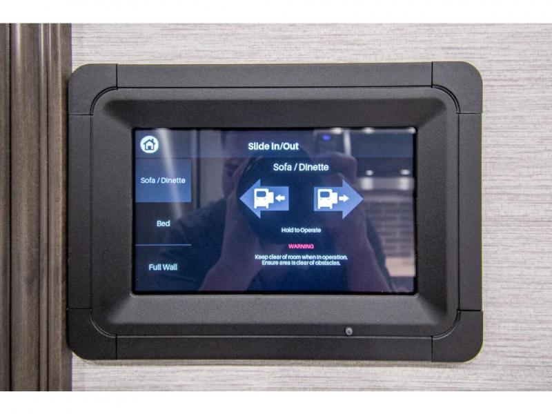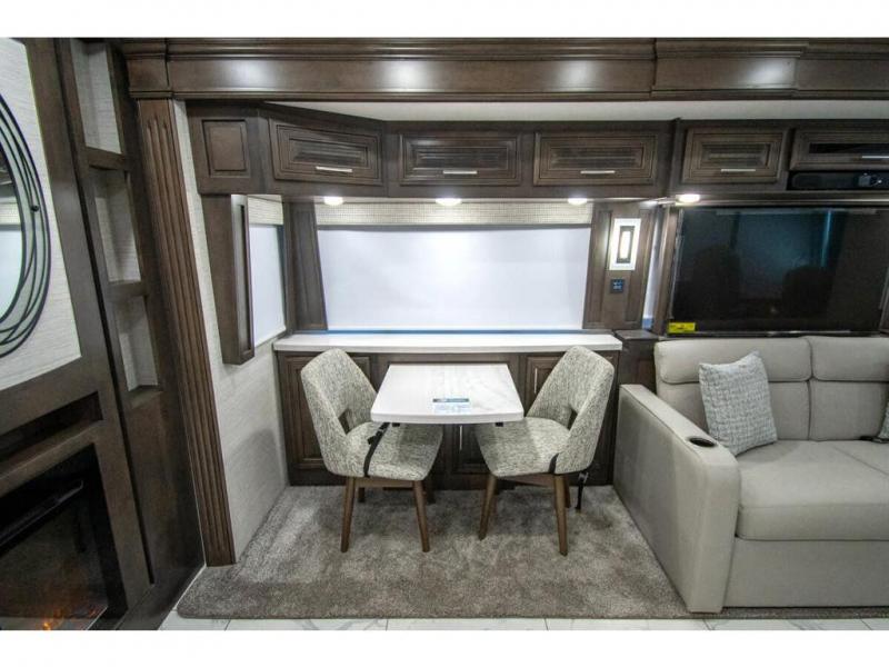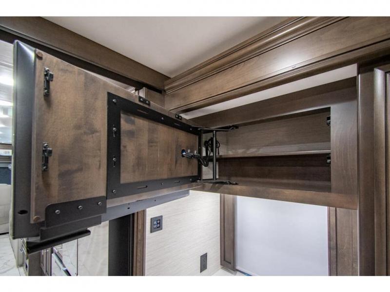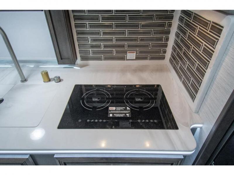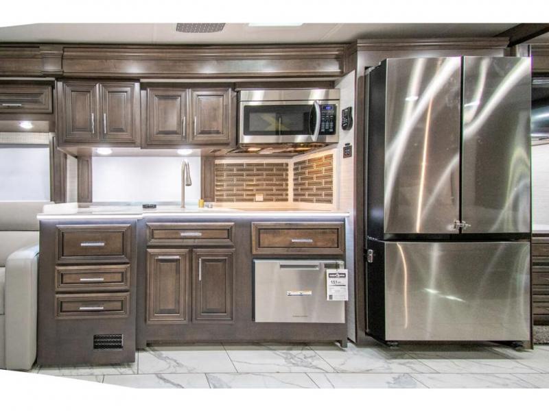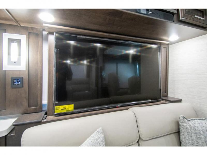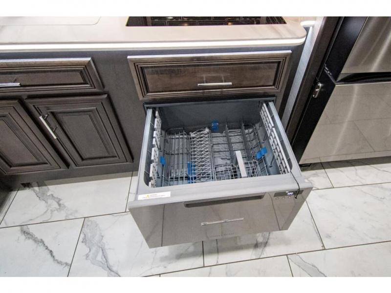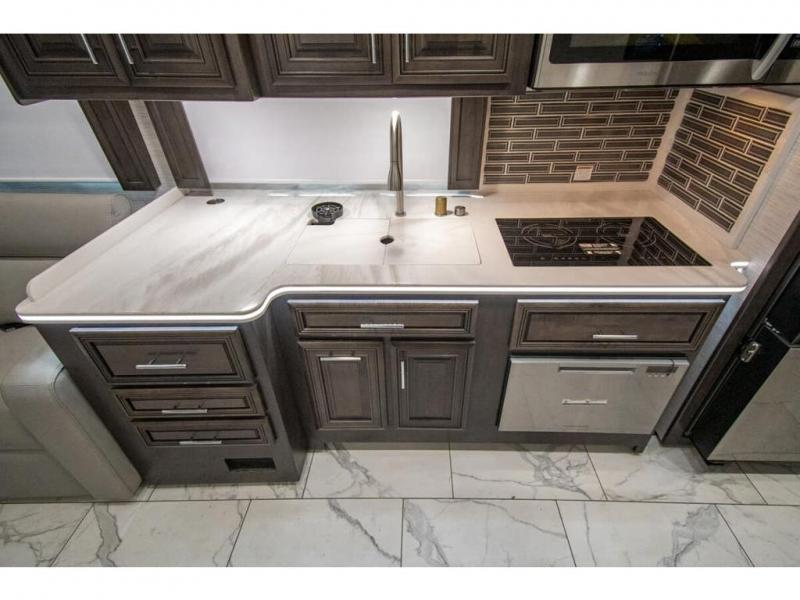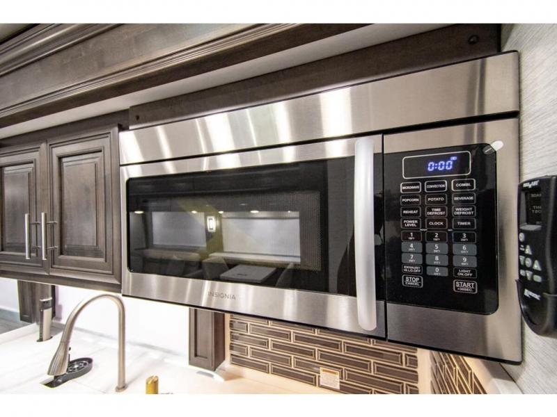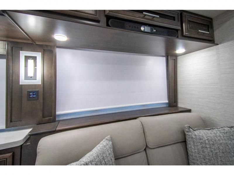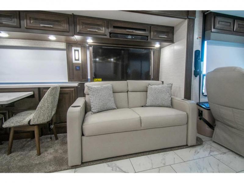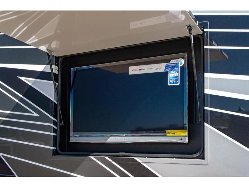 You will find comfort all throughout this motorhome, from the bunk lift over the cab with a 32" LED TV to the full rear bathroom with a stackable washer and dryer and dual bath sinks. There is plenty of entertainment throughout the inside with LED TVs and the outside with an exterior entertainment center with a 40" LED TV, Bluetooth radio, and speakers to crank up the tunes. The chef will have an easy time preparing their meals with the two burner induction cooktop and can keep their ingredients fresh with the 23 cu. ft. French door residential refrigerator, plus there is a 30" over the range convection microwave for those nights when you don't feel like cooking. The booth dinette is a great place to enjoy your meals, play card games, and even transform into an extra sleeping space. The hide-a-bed sofa and second sofa also offer comfortable sleeping spaces if needed!