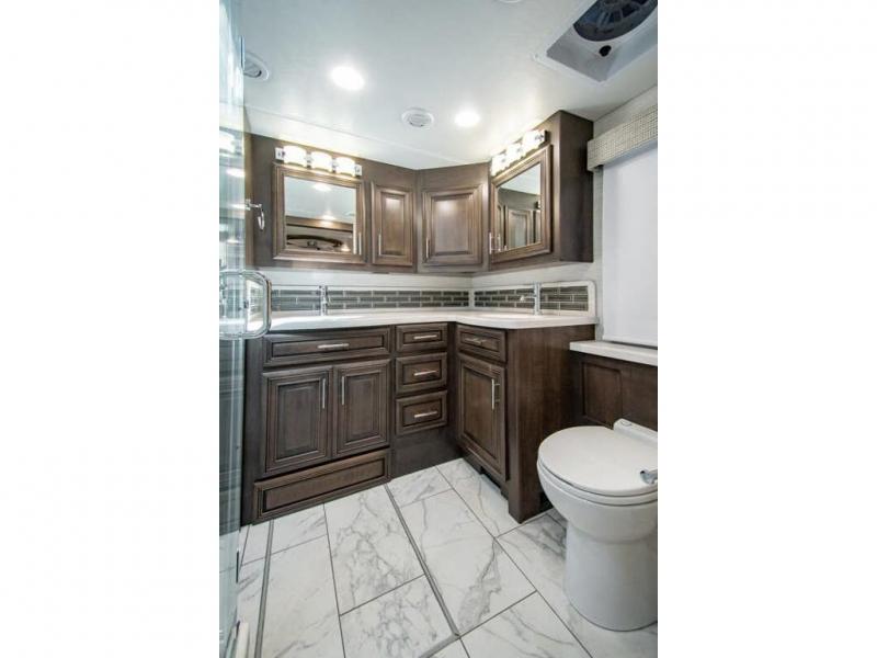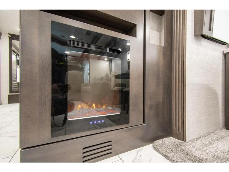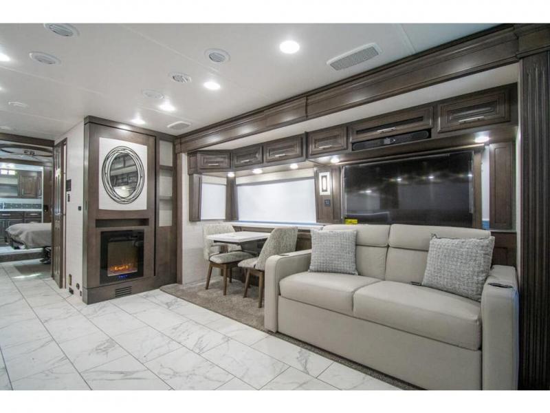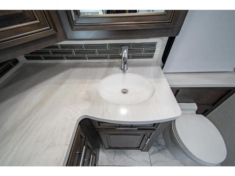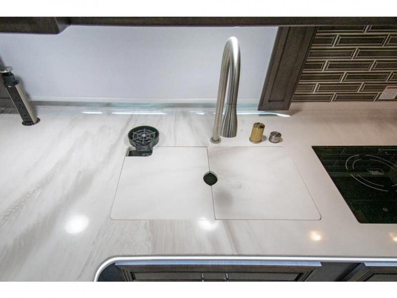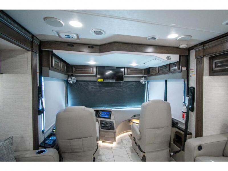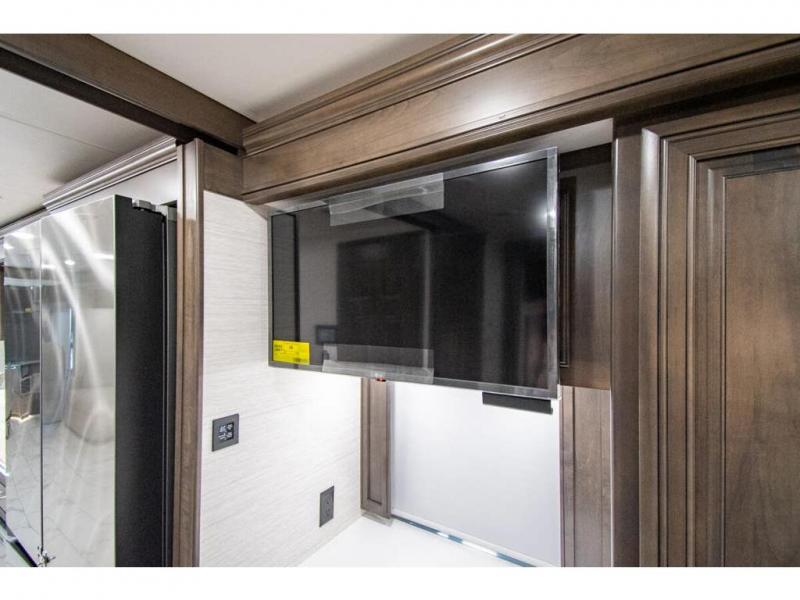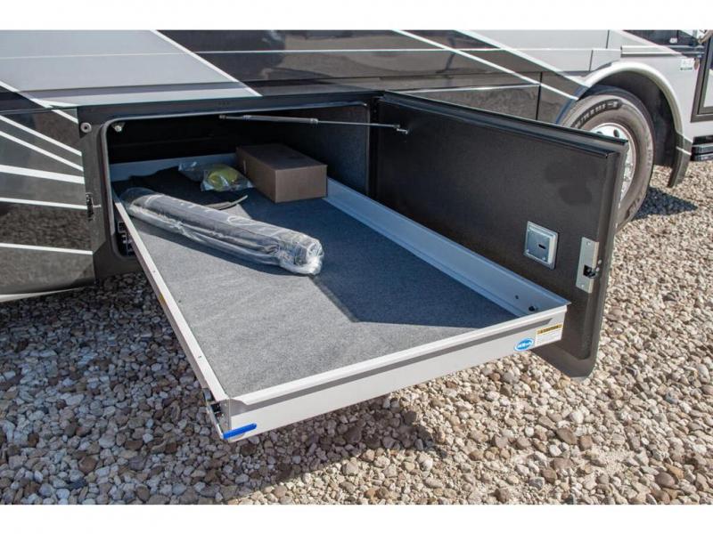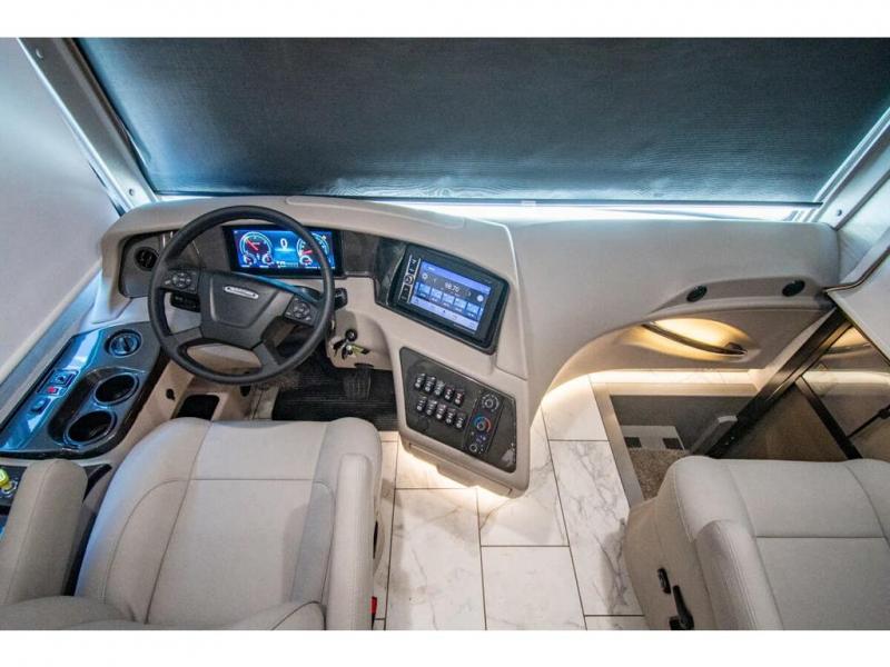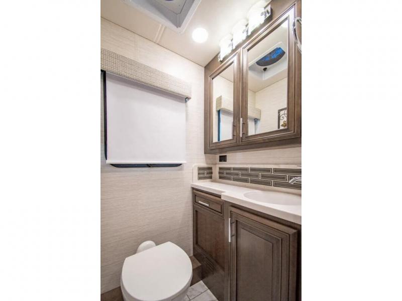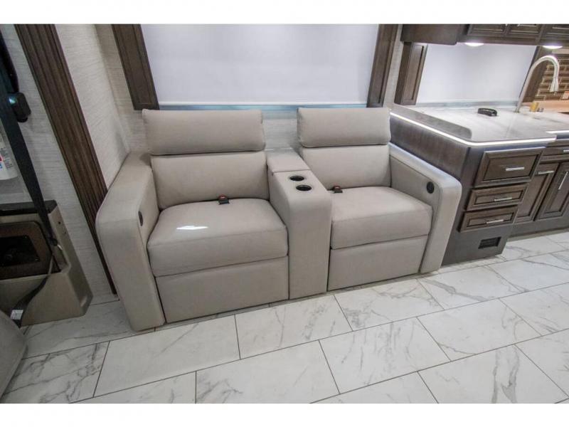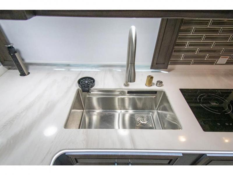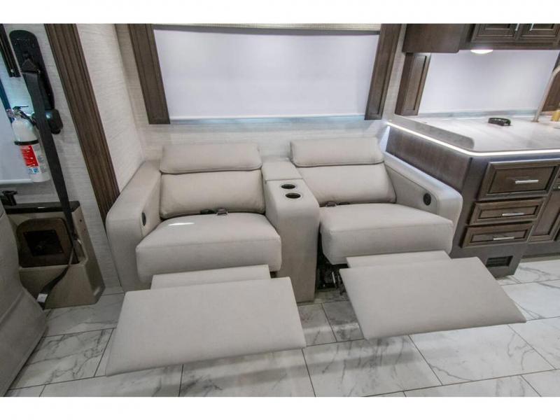 You will find comfort all throughout this motorhome, from the bunk lift over the cab with a 32" LED TV to the full rear bathroom with a stackable washer and dryer and dual bath sinks. There is plenty of entertainment throughout the inside with LED TVs and the outside with an exterior entertainment center with a 40" LED TV, Bluetooth radio, and speakers to crank up the tunes. The chef will have an easy time preparing their meals with the two burner induction cooktop and can keep their ingredients fresh with the 23 cu. ft. French door residential refrigerator, plus there is a 30" over the range convection microwave for those nights when you don't feel like cooking. The booth dinette is a great place to enjoy your meals, play card games, and even transform into an extra sleeping space. The hide-a-bed sofa and second sofa also offer comfortable sleeping spaces if needed!