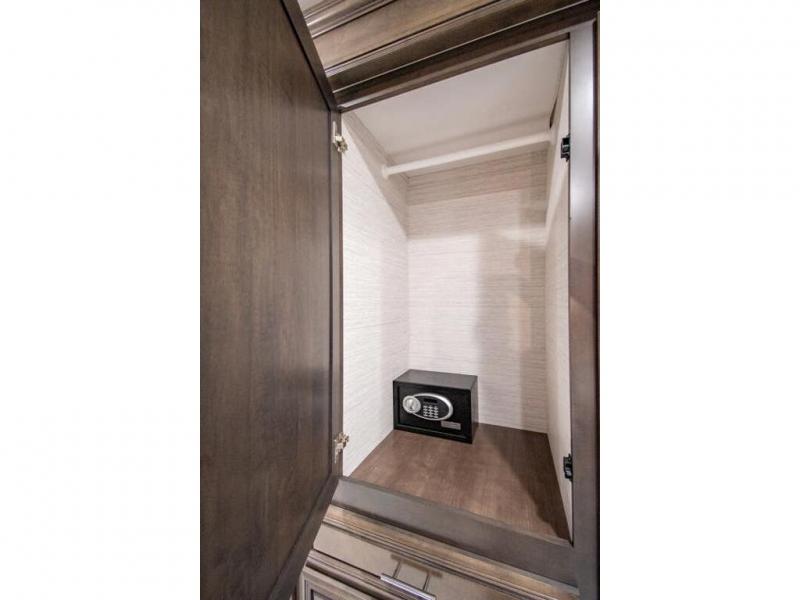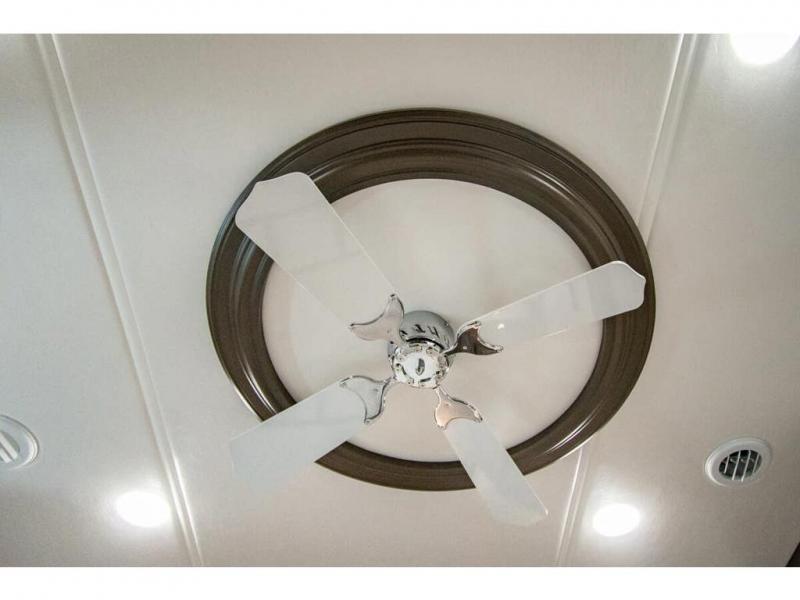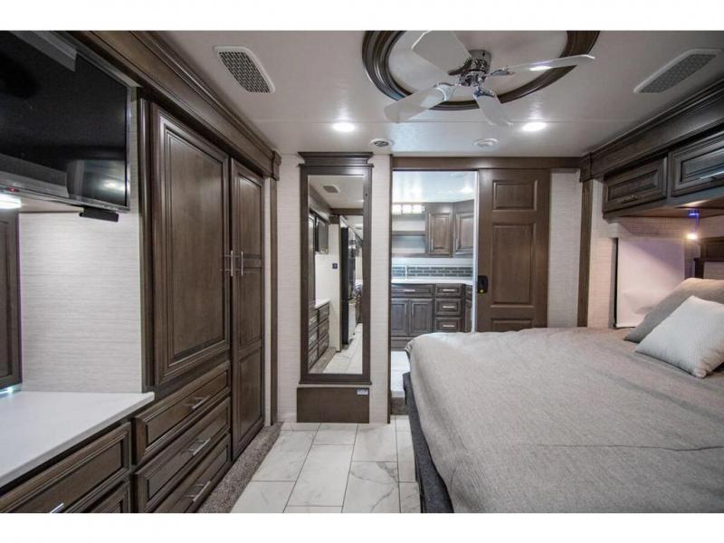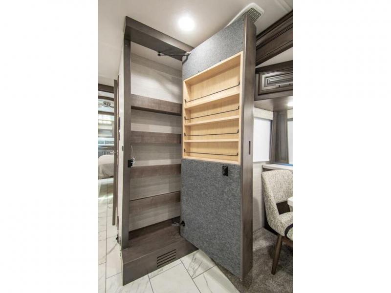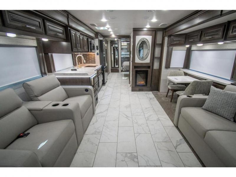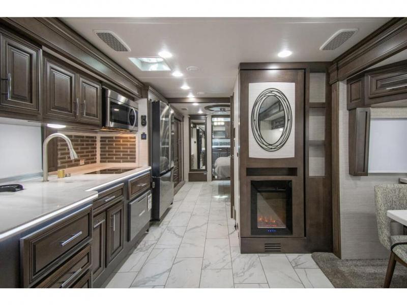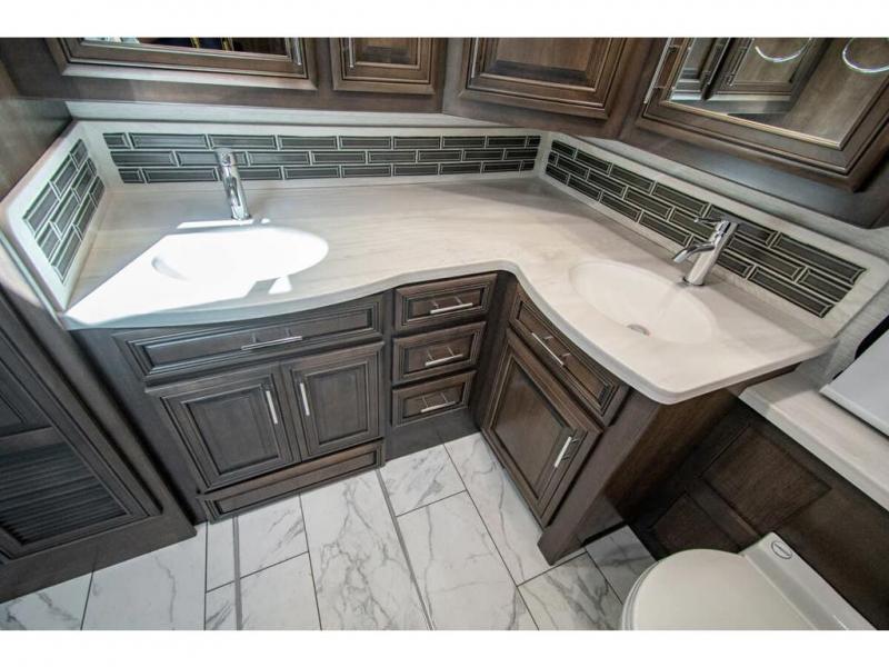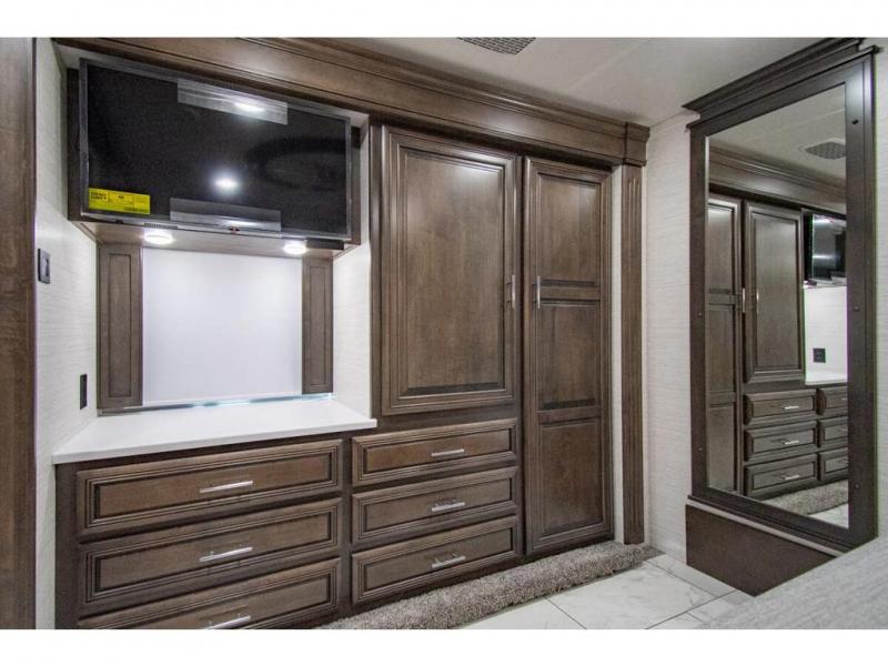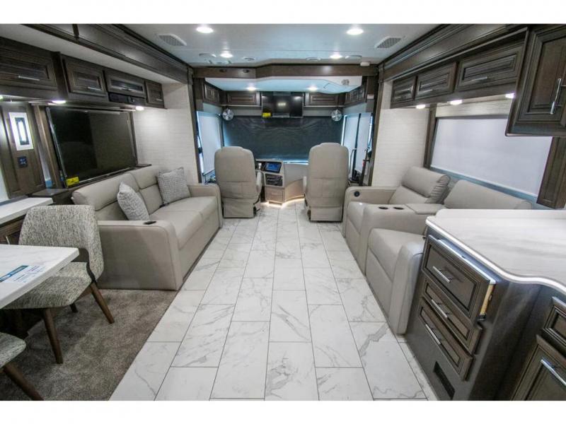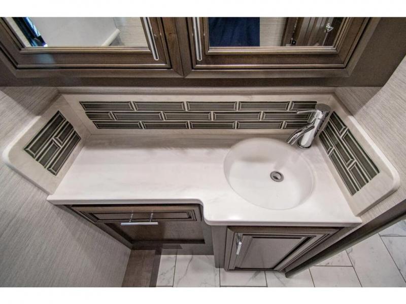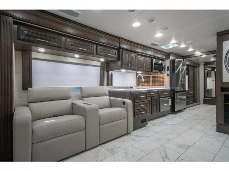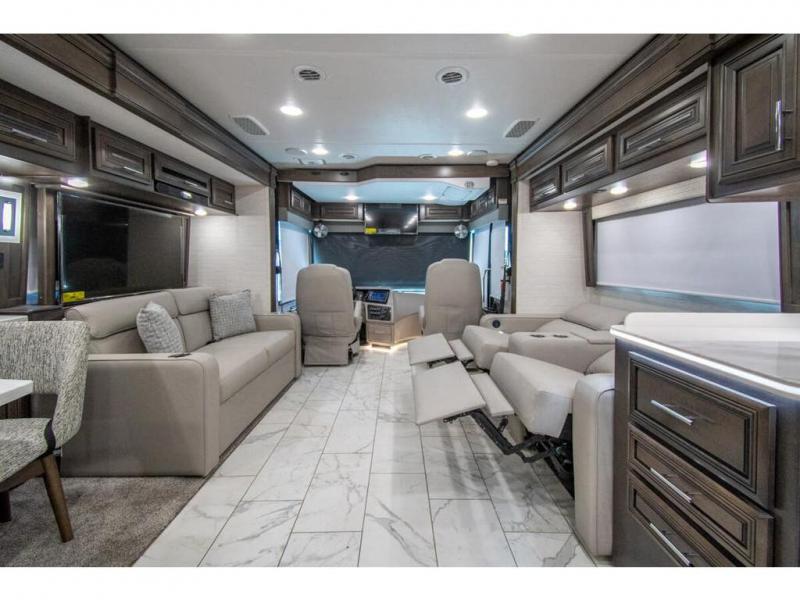 You will find comfort all throughout this motorhome, from the bunk lift over the cab with a 32" LED TV to the full rear bathroom with a stackable washer and dryer and dual bath sinks. There is plenty of entertainment throughout the inside with LED TVs and the outside with an exterior entertainment center with a 40" LED TV, Bluetooth radio, and speakers to crank up the tunes. The chef will have an easy time preparing their meals with the two burner induction cooktop and can keep their ingredients fresh with the 23 cu. ft. French door residential refrigerator, plus there is a 30" over the range convection microwave for those nights when you don't feel like cooking. The booth dinette is a great place to enjoy your meals, play card games, and even transform into an extra sleeping space. The hide-a-bed sofa and second sofa also offer comfortable sleeping spaces if needed!
