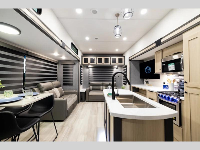 Imagine waking up every morning in a luxurious RV that feels like home. The rear living room is a cozy retreat, perfect for relaxing and unwinding after a long adventure day. With a comfortable hide-a-bed sofa, entertainment center, cozy fireplace, theater seating, and overhead cabinets, you'll have everything you need to enjoy quality time with family and friends. The kitchen is perfect for fulfilling all your cooking cravings, featuring a kitchen island with flip-up extension for added convenience when cooking, a microwave, pantry, and 12V refrigerator. There is also a hi-top table and chairs, coffee bar, and walk-in pantry. The full bathroom comes with a linen closet and all the amenities you need to freshen up and feel at home. And with a spacious shower and plenty of storage, you'll have everything you need to start your day off right. The front bedroom is the perfect space to recharge energy, featuring a comfortable king bed, dresser, walk-in wardrobe, and washer and dryer prep for all your laundry needs. Outside, you'll appreciate the pass-through storage for all your gear and toys, as well as the 15' and 11' awnings for shade and protection.