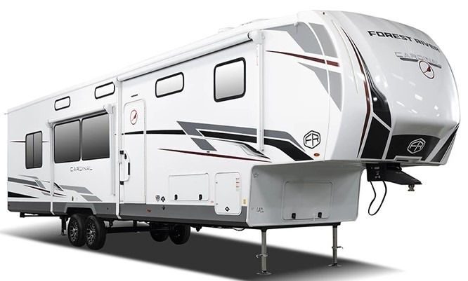 With any Cardinal fifth wheel by Forest River you will enjoy affordable luxury at every turn. These models are constructed with residential fiberglass insulation in the roof and floor, a sectioned ABS plastic underbelly armor, and a vacuum bonded, welded aluminum structure for added strength and durability. You will also find seamless roto-cast holding tanks, an outdoor shower, and 4-point auto leveling for quick and easy setup. There are carpet-free living spaces, residential backsplash, motion lighting throughout, and many more comforts!