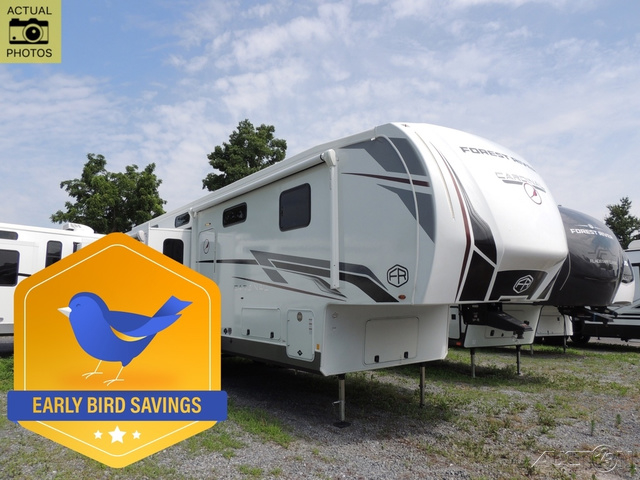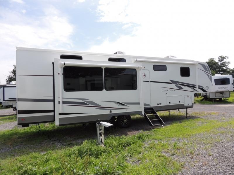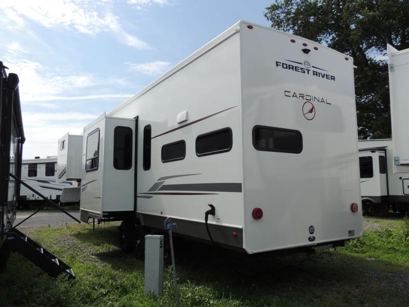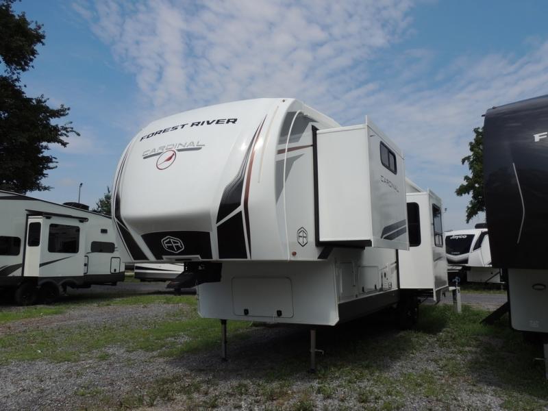 With any Cardinal fifth wheel by Forest River you will enjoy affordable luxury at every turn. These models are constructed with residential fiberglass insulation in the roof and floor, a sectioned ABS plastic underbelly armor, and a vacuum bonded, welded aluminum structure for added strength and durability. You will also find seamless roto-cast holding tanks, an outdoor shower, and 4-point auto leveling for quick and easy setup. Each model includes a best-in-class, high-efficiency 35,000 BTU furnace, along with a 18,000 BTU ducted A/C, with second and third A/C prep, plus an on-demand tankless water heater for added convenience. There are carpet-free living spaces, residential backsplash, motion lighting throughout, and many more comforts!
