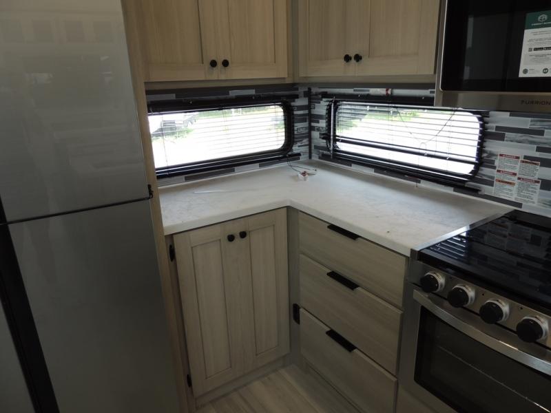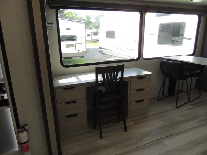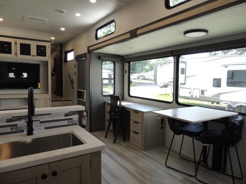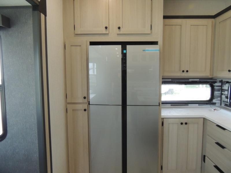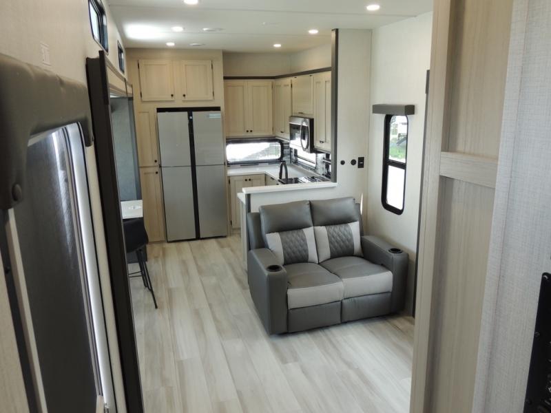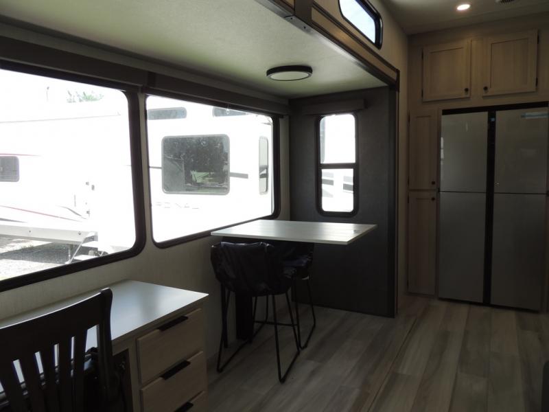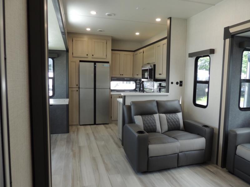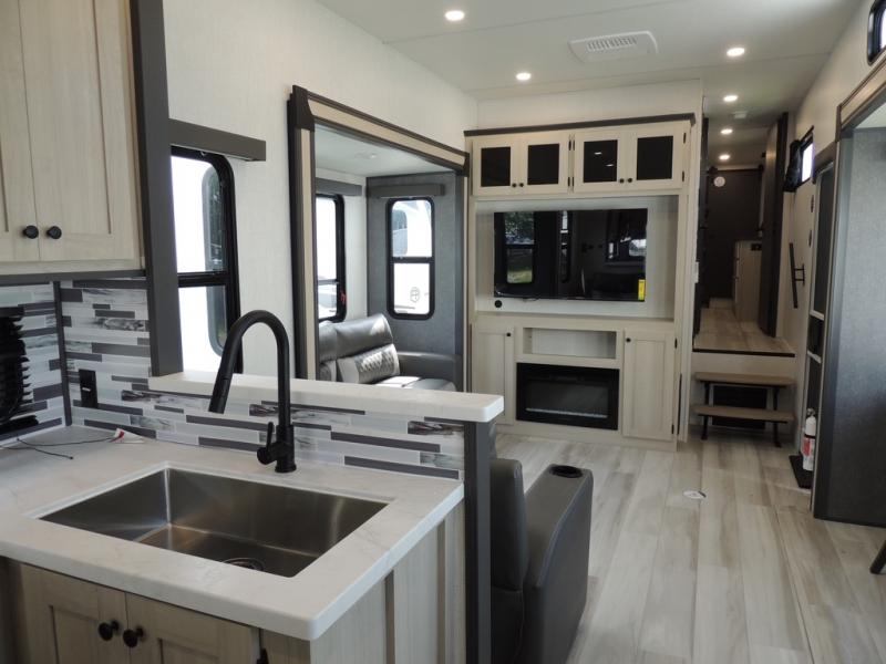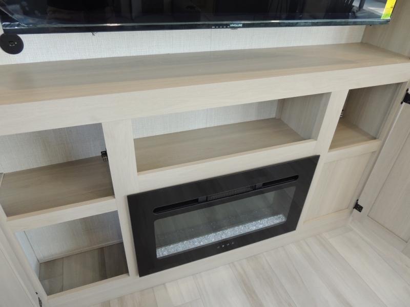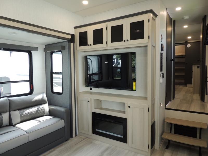Cook like a chef worthy of a Michelin star in this amazing fifth wheel! Inside, you'll find a spacious rear kitchen, complete with a pantry, a 12V refrigerator ideal for keeping your fruits and vegetables fresh, overhead cabinets, and a sprawling countertop for all your cooking and dining times. The high-top table and chairs provide the perfect place to enjoy meals with family and friends. The living room is a cozy place featuring comfortable theater seating, a tri-fold sofa, a cozy fireplace, an entertainment center, and a convenient desk for staying productive on the go. The full bathroom is also a great place to freshen up, complete with a linen closet and all the amenities you need to take a bath and feel at home. With a spacious shower and plenty of storage, you'll have everything you need to start your day off right. The perfect place to rest and recharge after a long day of adventure is the front bedroom which boasts a comfortable king bed, dresser, walk-in wardrobe with washer and dryer prep, for keeping all your favorite belongings clean and organized on the road. Outside, you'll appreciate the pass-through storage for all your gear and toys, as well as the two awnings (15' and 11') ideal for creating unforgettable memories outside without worrying about the weather.