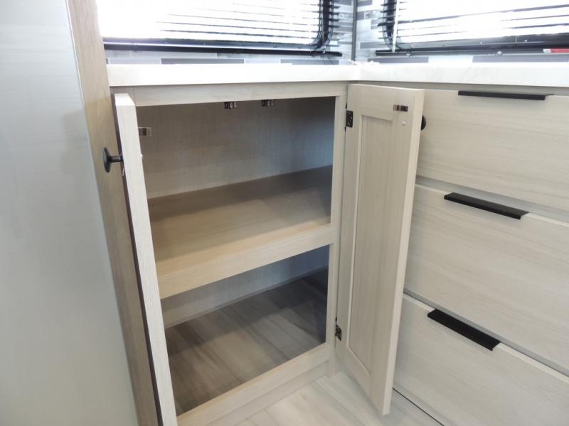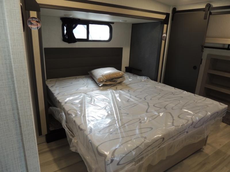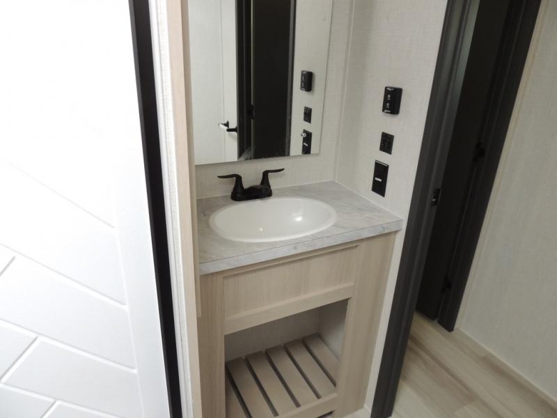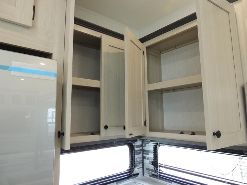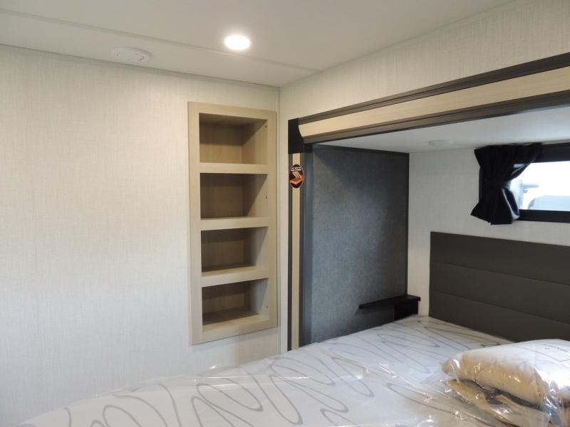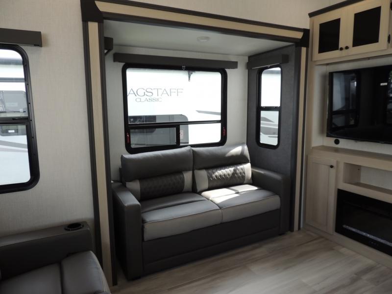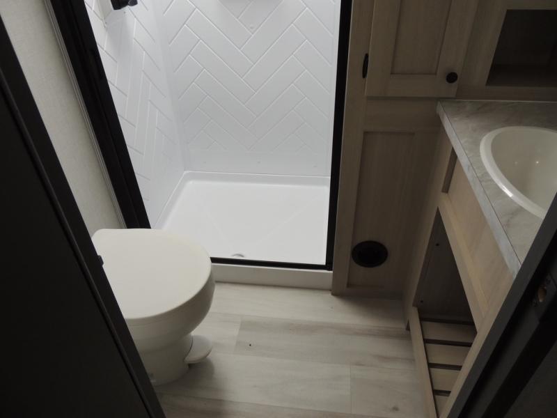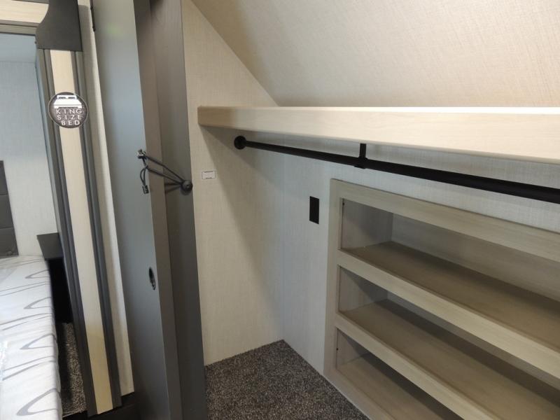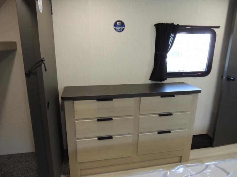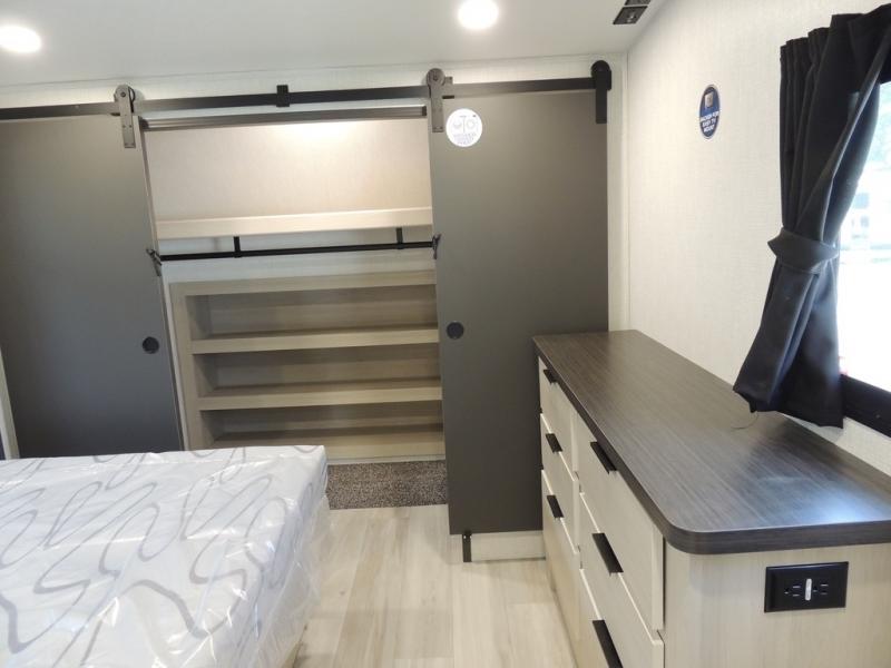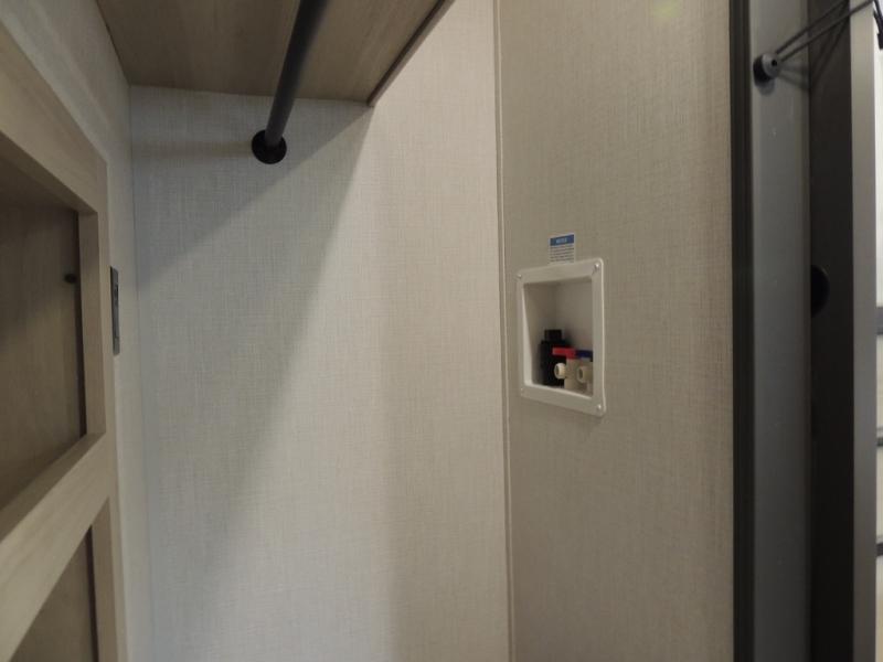 Cook like a chef worthy of a Michelin star in this amazing fifth wheel! Inside, you'll find a spacious rear kitchen, complete with a pantry, a 12V refrigerator ideal for keeping your fruits and vegetables fresh, overhead cabinets, and a sprawling countertop for all your cooking and dining times. The high-top table and chairs provide the perfect place to enjoy meals with family and friends. The living room is a cozy place featuring comfortable theater seating, a tri-fold sofa, a cozy fireplace, an entertainment center, and a convenient desk for staying productive on the go. The full bathroom is also a great place to freshen up, complete with a linen closet and all the amenities you need to take a bath and feel at home. With a spacious shower and plenty of storage, you'll have everything you need to start your day off right. The perfect place to rest and recharge after a long day of adventure is the front bedroom which boasts a comfortable king bed, dresser, walk-in wardrobe with washer and dryer prep, for keeping all your favorite belongings clean and organized on the road. Outside, you'll appreciate the pass-through storage for all your gear and toys, as well as the two awnings (15' and 11') ideal for creating unforgettable memories outside without worrying about the weather.