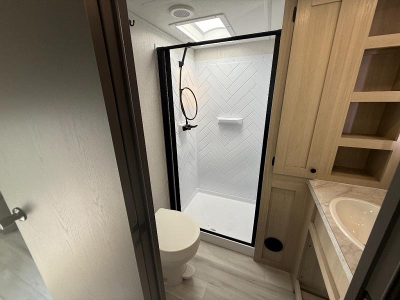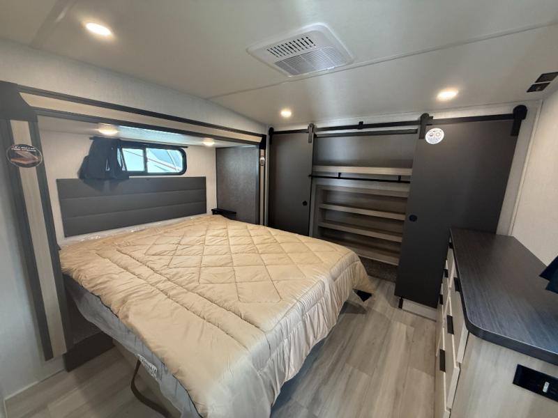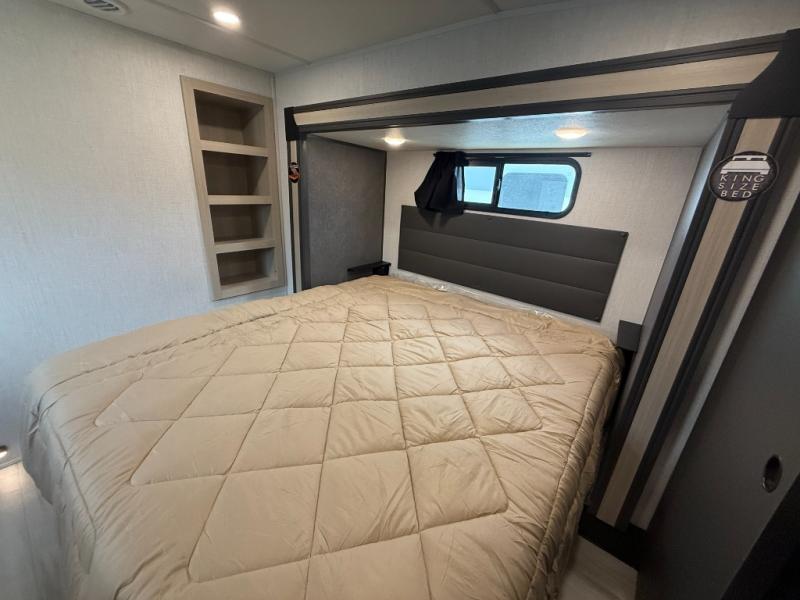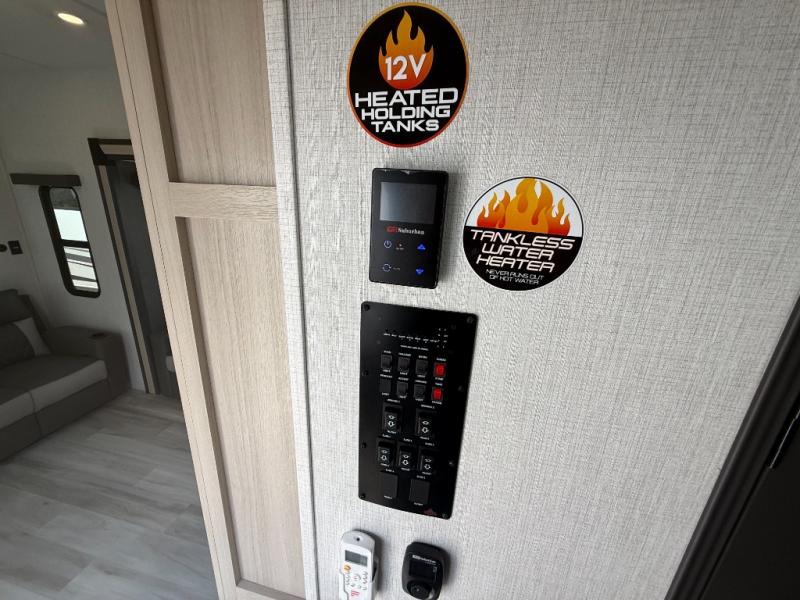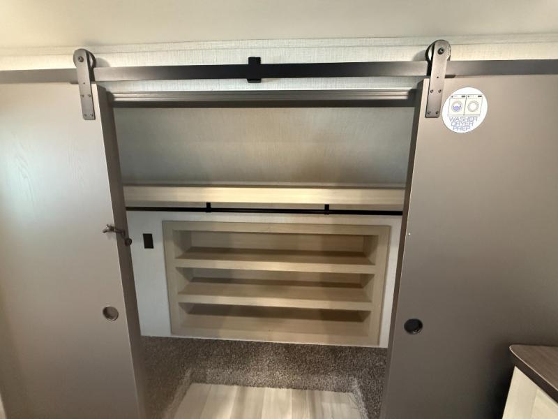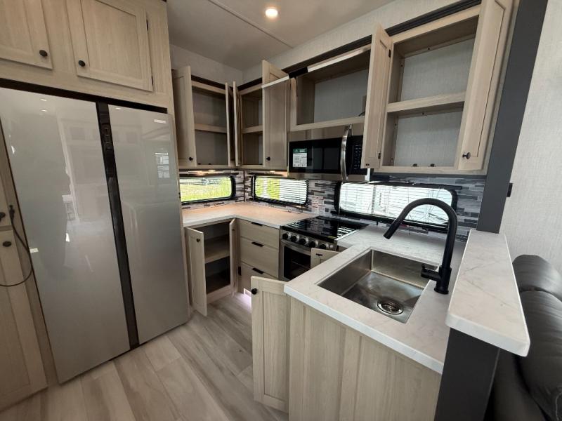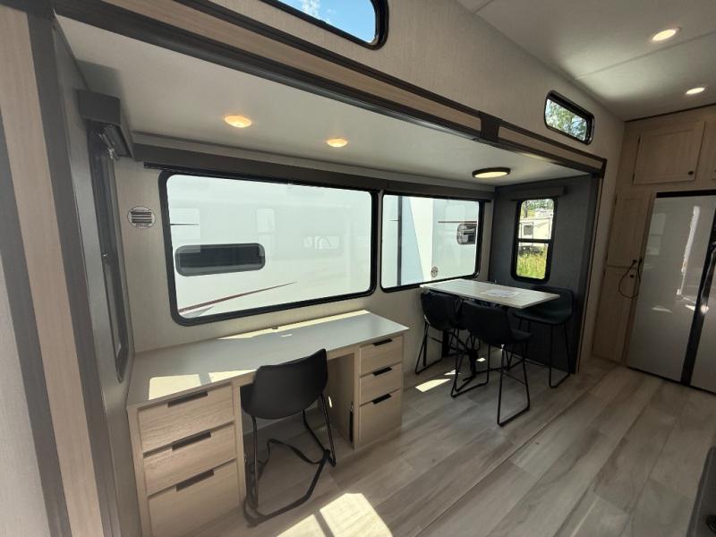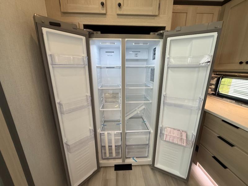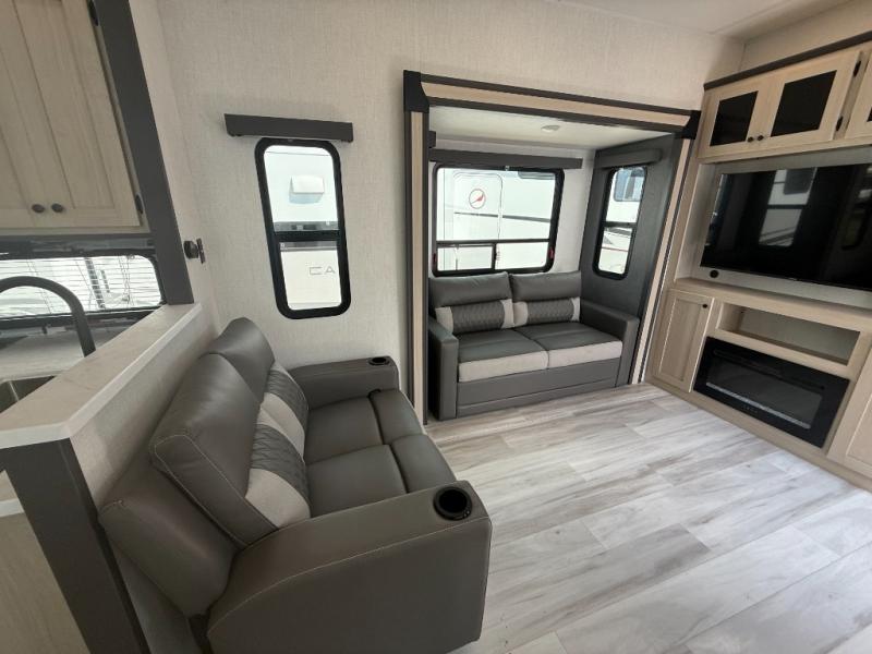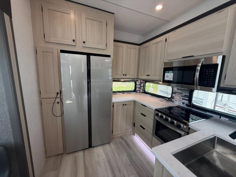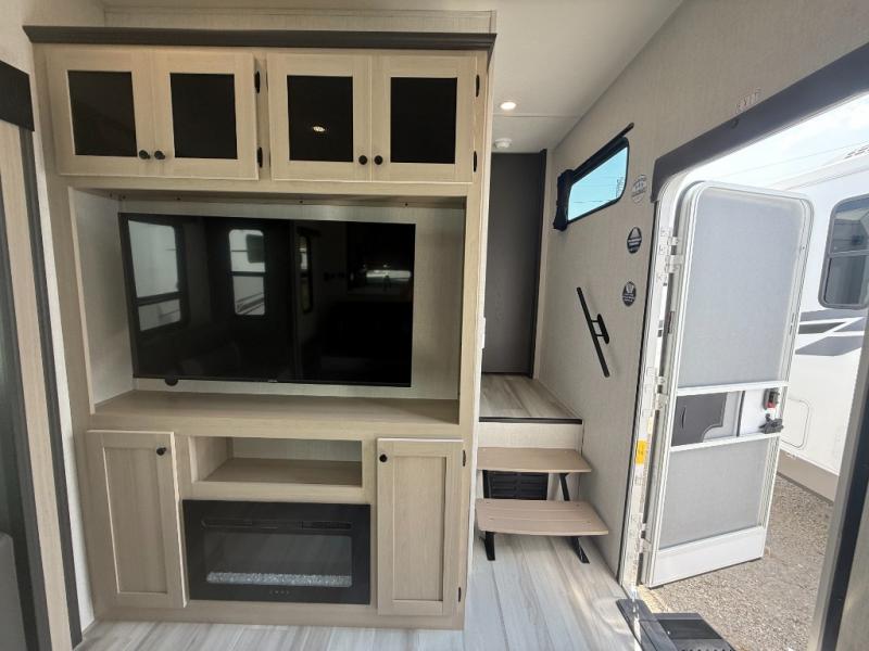 Cook like a chef worthy of a Michelin star in this amazing fifth wheel! Inside, you'll find a spacious rear kitchen, complete with a pantry, a 12V refrigerator ideal for keeping your fruits and vegetables fresh, overhead cabinets, and a sprawling countertop for all your cooking and dining times. The high-top table and chairs provide the perfect place to enjoy meals with family and friends. The living room is a cozy place featuring comfortable theater seating, a tri-fold sofa, a cozy fireplace, an entertainment center, and a convenient desk for staying productive on the go. The full bathroom is also a great place to freshen up, complete with a linen closet and all the amenities you need to take a bath and feel at home. With a spacious shower and plenty of storage, you'll have everything you need to start your day off right. The perfect place to rest and recharge after a long day of adventure is the front bedroom which boasts a comfortable king bed, dresser, walk-in wardrobe with washer and dryer prep, for keeping all your favorite belongings clean and organized on the road. Outside, you'll appreciate the pass-through storage for all your gear and toys, as well as the two awnings (15' and 11') ideal for creating unforgettable memories outside without worrying about the weather.