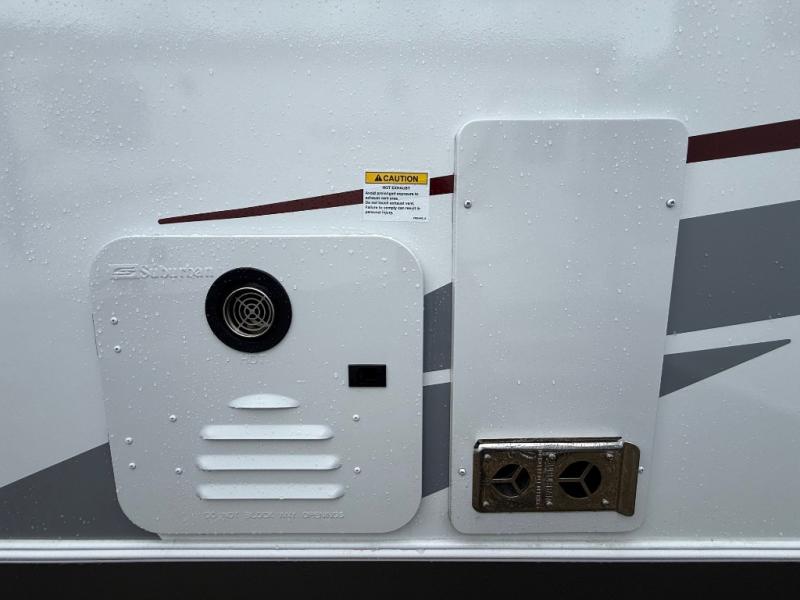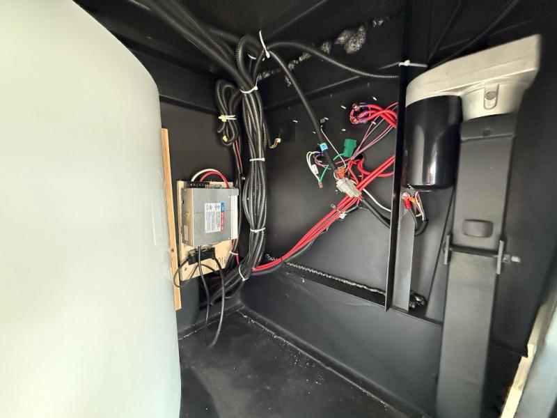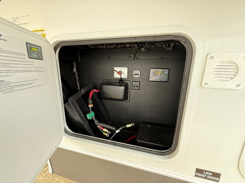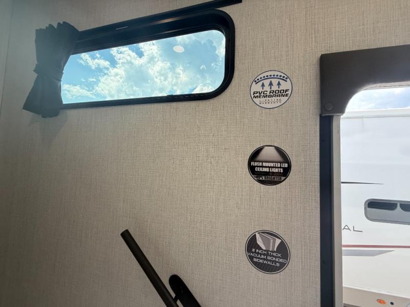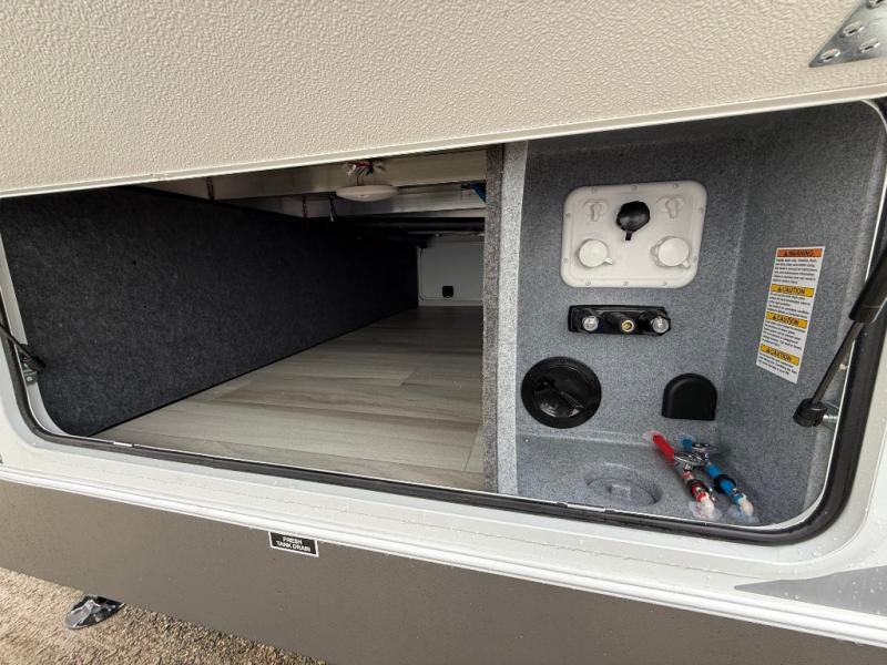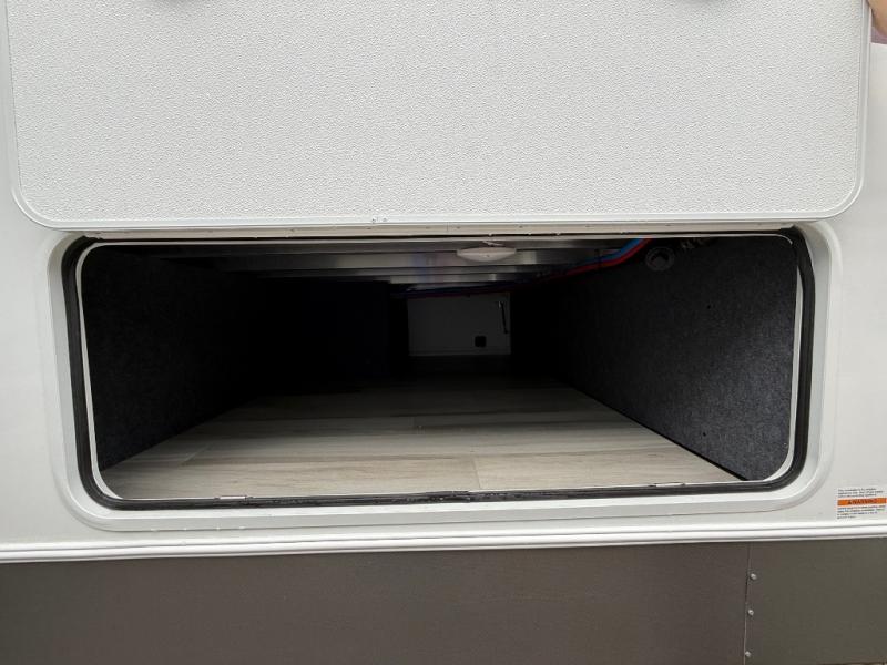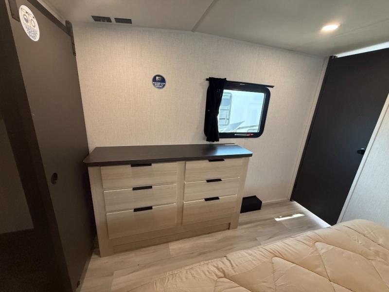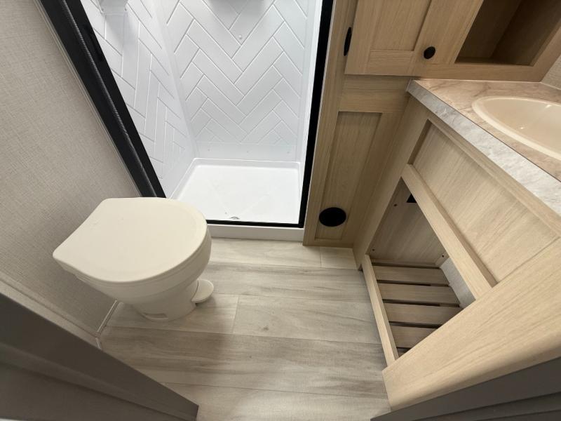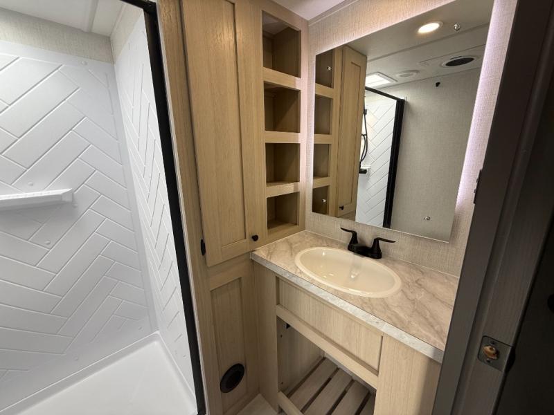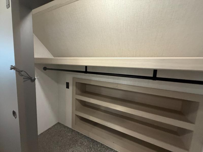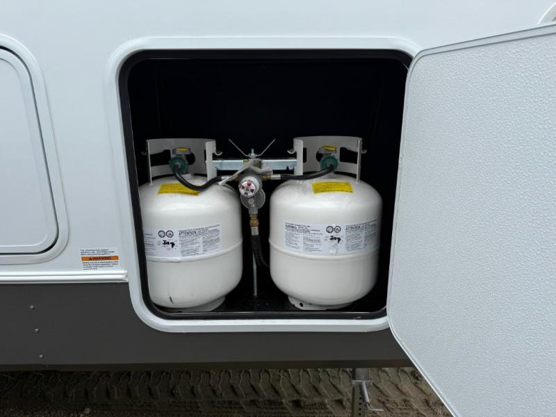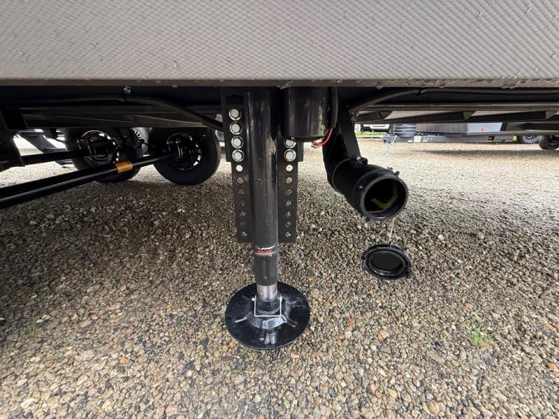 Cook like a chef worthy of a Michelin star in this amazing fifth wheel! Inside, you'll find a spacious rear kitchen, complete with a pantry, a 12V refrigerator ideal for keeping your fruits and vegetables fresh, overhead cabinets, and a sprawling countertop for all your cooking and dining times. The high-top table and chairs provide the perfect place to enjoy meals with family and friends. The living room is a cozy place featuring comfortable theater seating, a tri-fold sofa, a cozy fireplace, an entertainment center, and a convenient desk for staying productive on the go. The full bathroom is also a great place to freshen up, complete with a linen closet and all the amenities you need to take a bath and feel at home. With a spacious shower and plenty of storage, you'll have everything you need to start your day off right. The perfect place to rest and recharge after a long day of adventure is the front bedroom which boasts a comfortable king bed, dresser, walk-in wardrobe with washer and dryer prep, for keeping all your favorite belongings clean and organized on the road. Outside, you'll appreciate the pass-through storage for all your gear and toys, as well as the two awnings (15' and 11') ideal for creating unforgettable memories outside without worrying about the weather.
