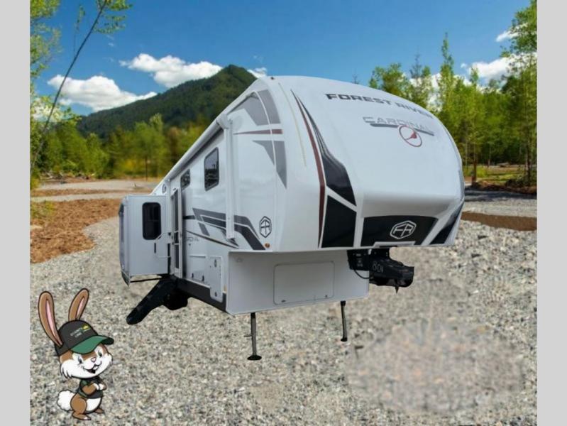 With any Cardinal fifth wheel by Forest River you will enjoy affordable luxury at every turn. These models are constructed with residential fiberglass insulation in the roof and floor, a sectioned ABS plastic underbelly armor, and a vacuum bonded, welded aluminum structure for added strength and durability. You will also find seamless roto-cast holding tanks, an outdoor shower, and 4-point auto leveling for quick and easy setup. There are carpet-free living spaces, residential backsplash, motion lighting throughout, and many more comforts!