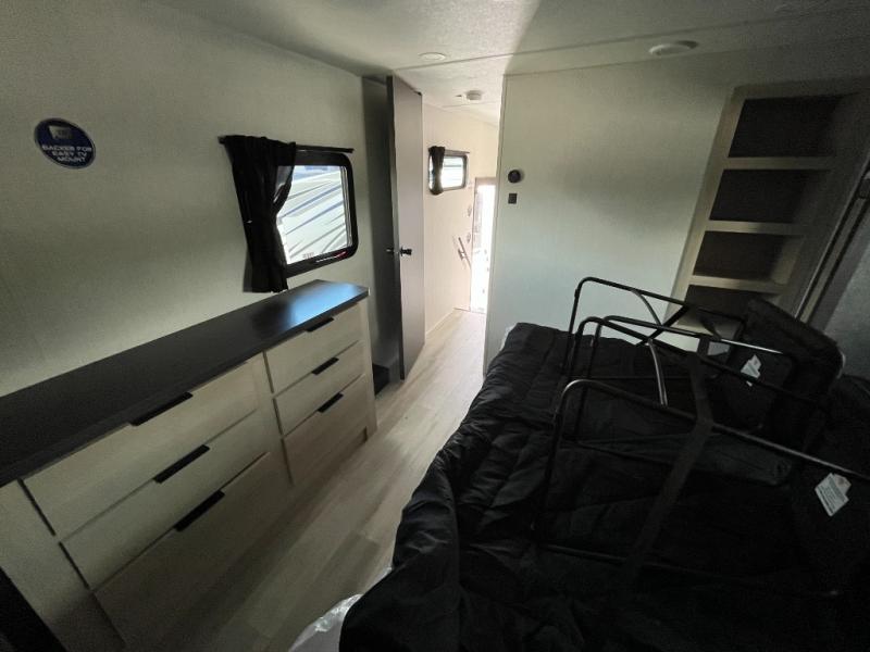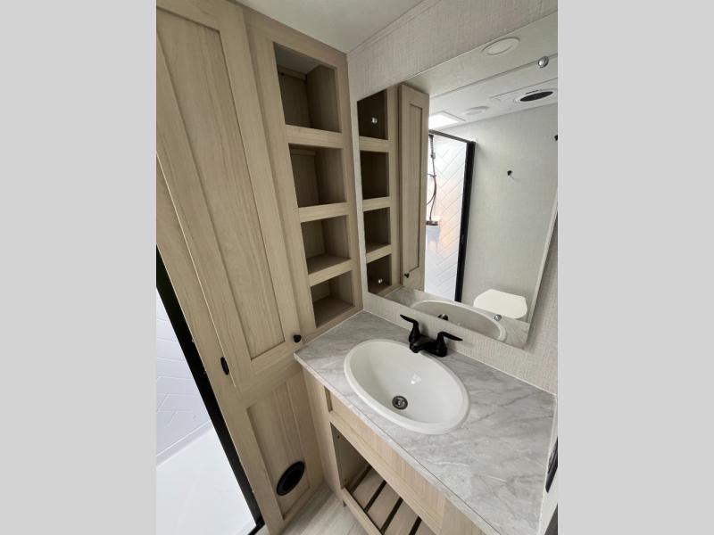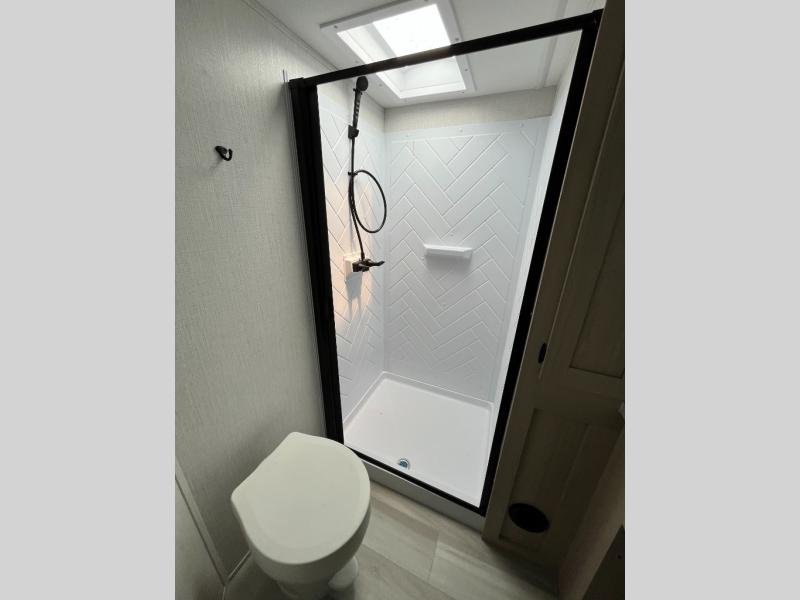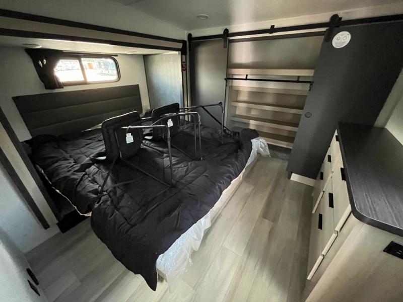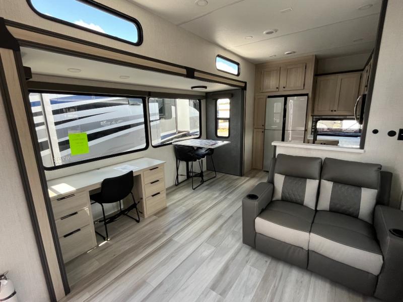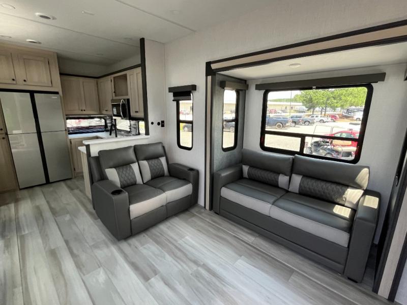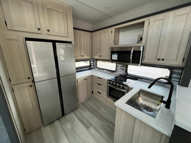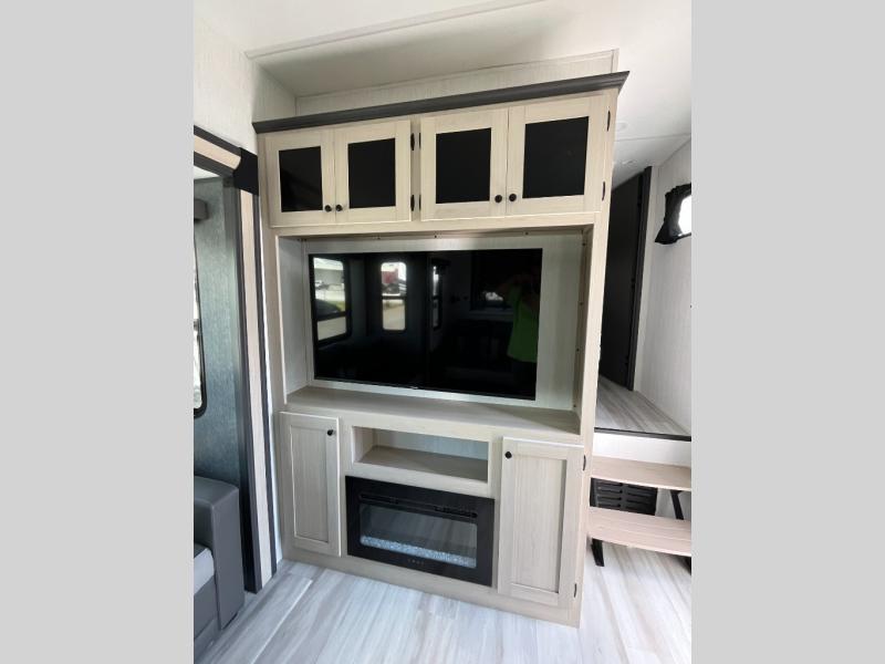 Cook like a chef worthy of a Michelin star in this amazing fifth wheel! Inside, you'll find a spacious rear kitchen, complete with a pantry, a 12V refrigerator ideal for keeping your fruits and vegetables fresh, overhead cabinets, and a sprawling countertop for all your cooking and dining times. The high-top table and chairs provide the perfect place to enjoy meals with family and friends. The living room is a cozy place featuring comfortable theater seating, a tri-fold sofa, a cozy fireplace, an entertainment center, and a convenient desk for staying productive on the go. The full bathroom is also a great place to freshen up, complete with a linen closet and all the amenities you need to take a bath and feel at home. With a spacious shower and plenty of storage, you'll have everything you need to start your day off right. The perfect place to rest and recharge after a long day of adventure is the front bedroom which boasts a comfortable king bed, dresser, walk-in wardrobe with washer and dryer prep, for keeping all your favorite belongings clean and organized on the road. Outside, you'll appreciate the pass-through storage for all your gear and toys, as well as the two awnings (15' and 11') ideal for creating unforgettable memories outside without worrying about the weather.