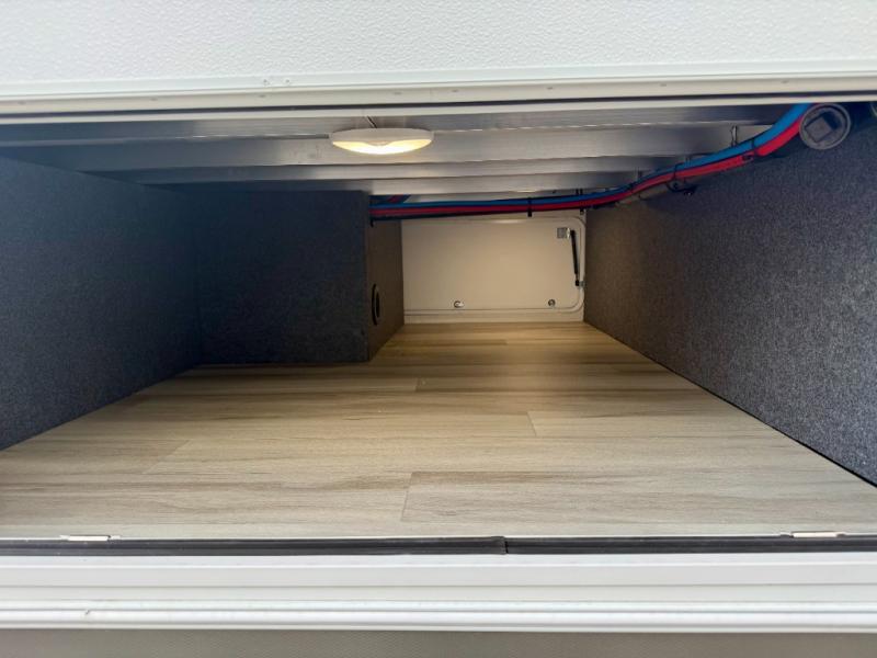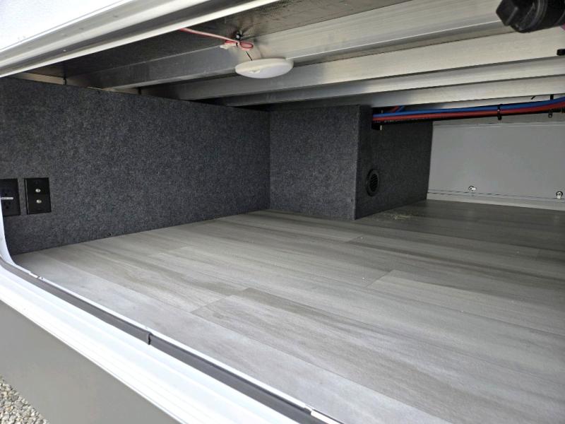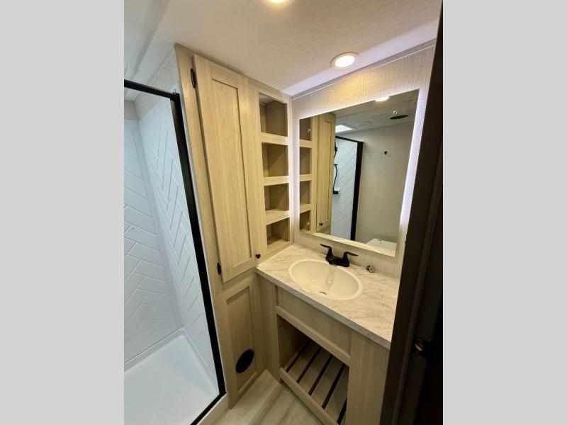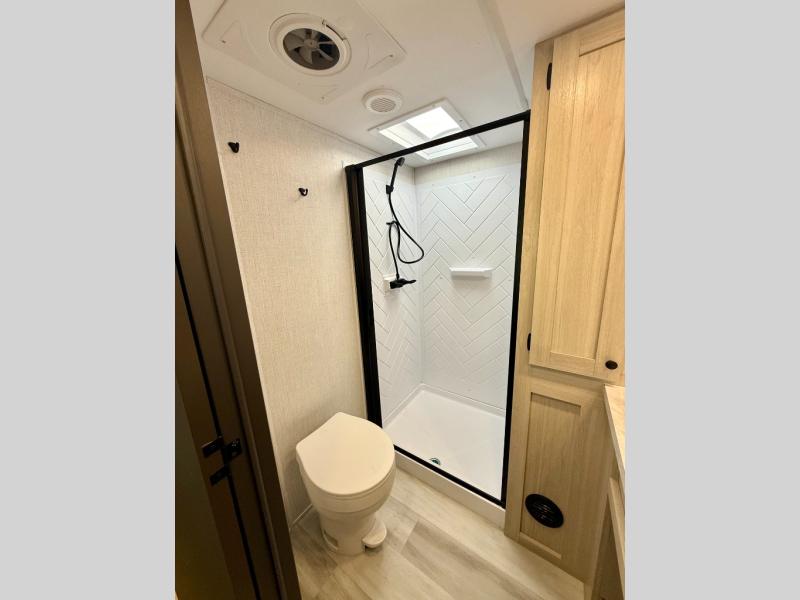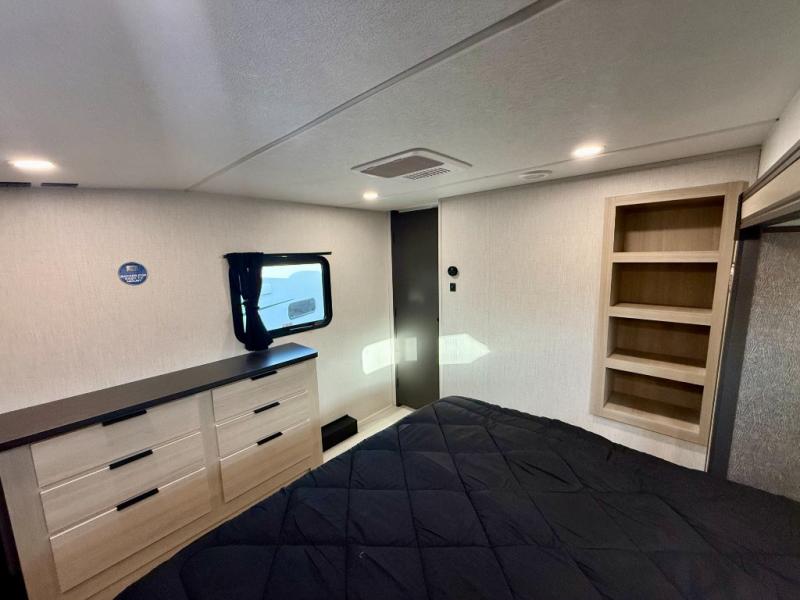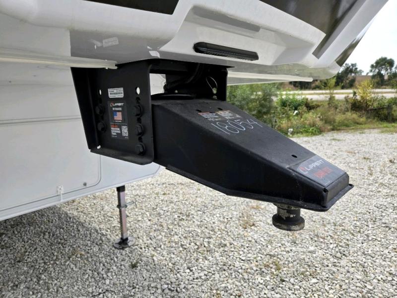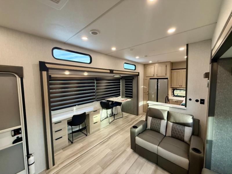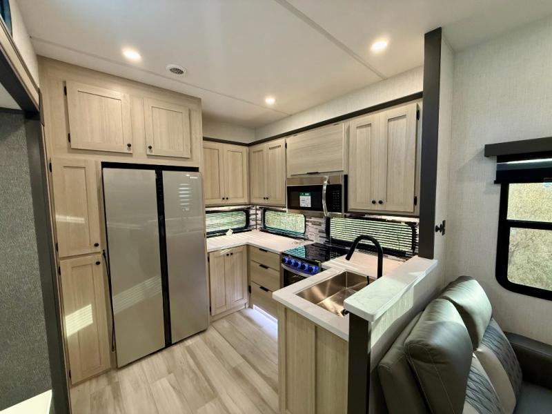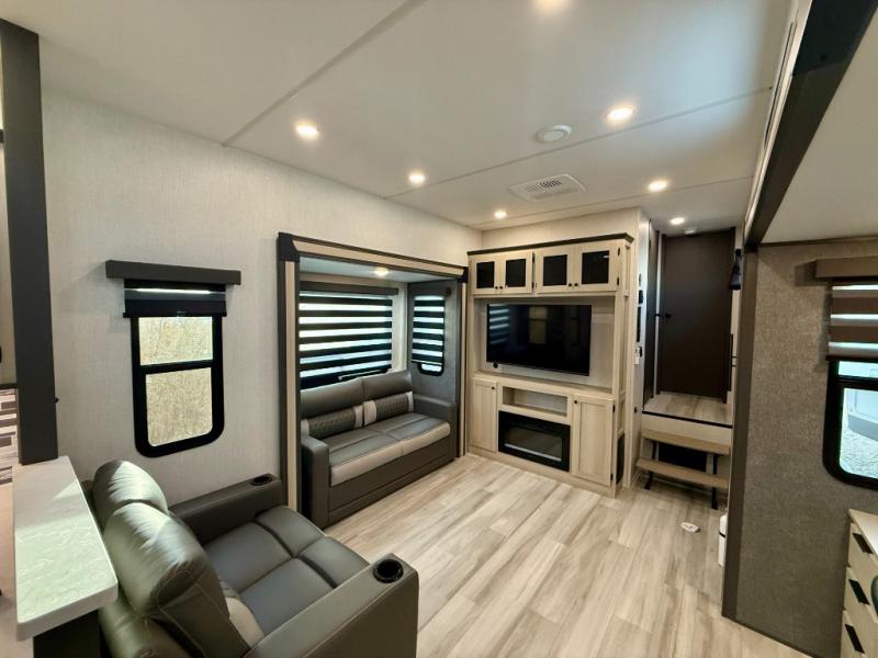 Cook like a chef worthy of a Michelin star in this amazing fifth wheel! Inside, you'll find a spacious rear kitchen, complete with a pantry, a 12V refrigerator ideal for keeping your fruits and vegetables fresh, overhead cabinets, and a sprawling countertop for all your cooking and dining times. The high-top table and chairs provide the perfect place to enjoy meals with family and friends. The living room is a cozy place featuring comfortable theater seating, a tri-fold sofa, a cozy fireplace, an entertainment center, and a convenient desk for staying productive on the go. The full bathroom is also a great place to freshen up, complete with a linen closet and all the amenities you need to take a bath and feel at home. With a spacious shower and plenty of storage, you'll have everything you need to start your day off right. The perfect place to rest and recharge after a long day of adventure is the front bedroom which boasts a comfortable king bed, dresser, walk-in wardrobe with washer and dryer prep, for keeping all your favorite belongings clean and organized on the road. Outside, you'll appreciate the pass-through storage for all your gear and toys, as well as the two awnings (15' and 11') ideal for creating unforgettable memories outside without worrying about the weather.
