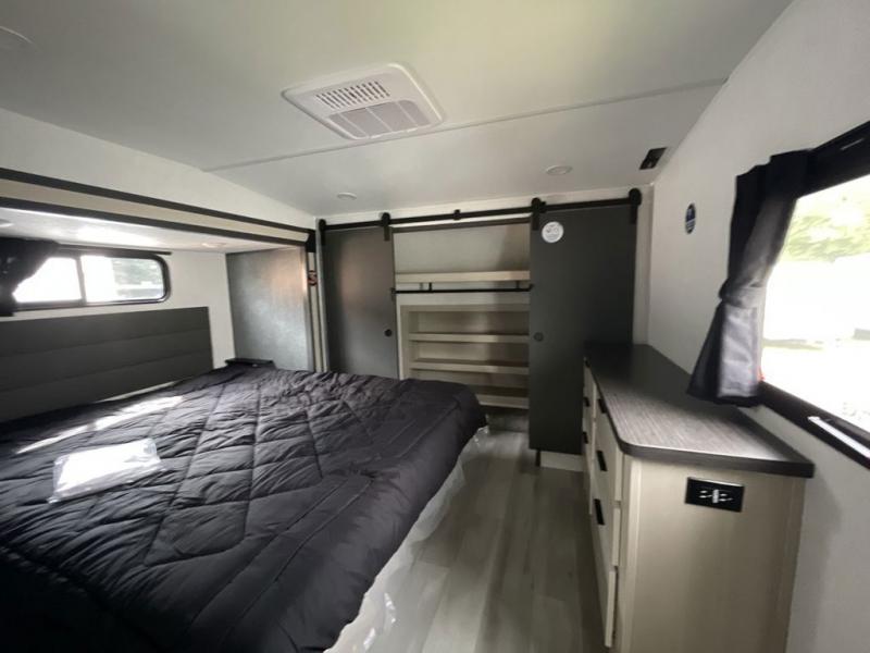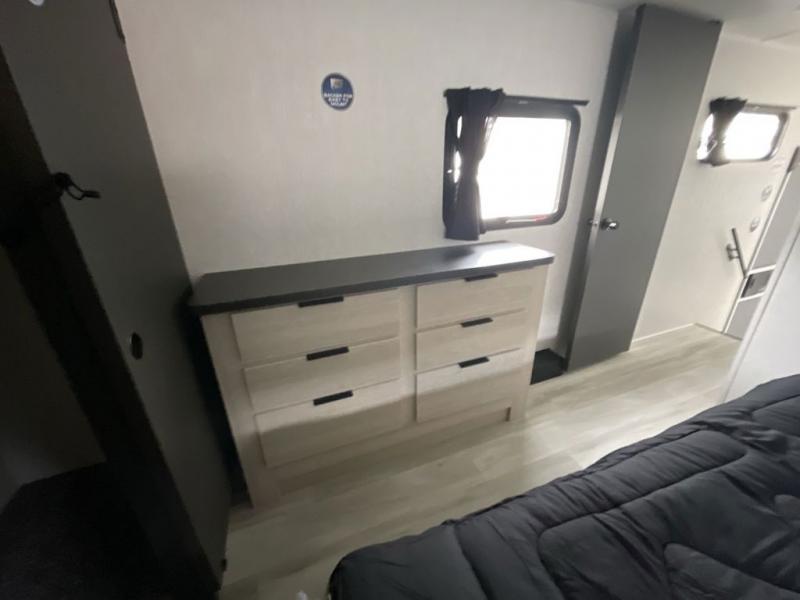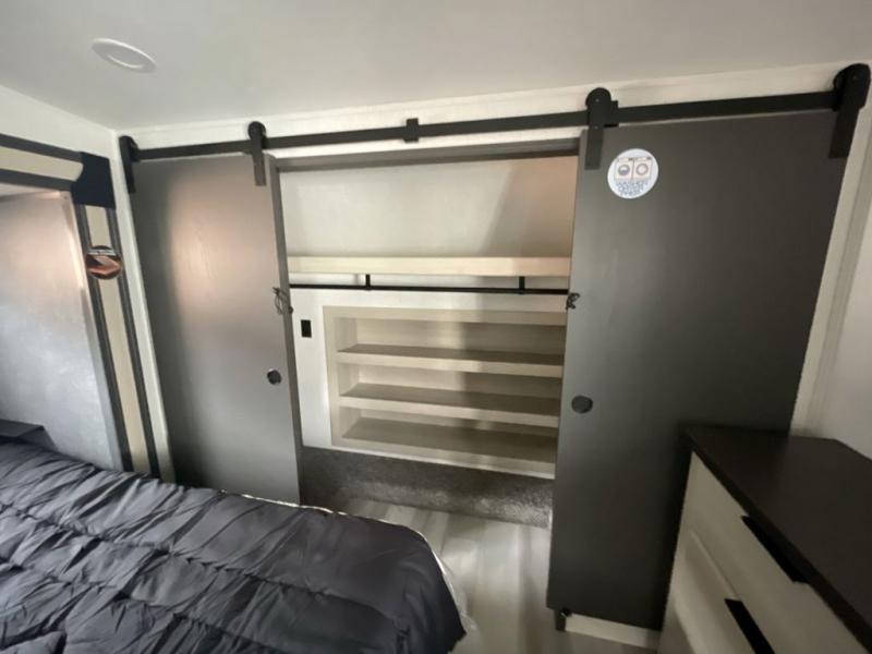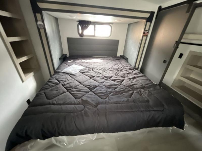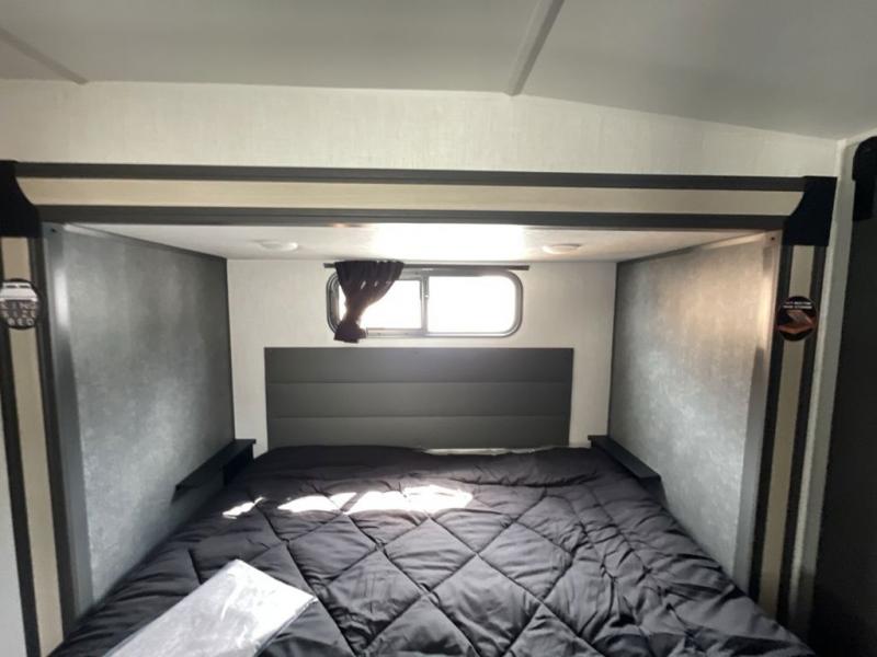Cook like a chef worthy of a Michelin star in this amazing fifth wheel! Inside, you'll find a spacious rear kitchen, complete with a pantry, a 12V refrigerator ideal for keeping your fruits and vegetables fresh, overhead cabinets, and a sprawling countertop for all your cooking and dining times. The high-top table and chairs provide the perfect place to enjoy meals with family and friends. The living room is a cozy place featuring comfortable theater seating, a tri-fold sofa, a cozy fireplace, an entertainment center, and a convenient desk for staying productive on the go. The full bathroom is also a great place to freshen up, complete with a linen closet and all the amenities you need to take a bath and feel at home. With a spacious shower and plenty of storage, you'll have everything you need to start your day off right. The perfect place to rest and recharge after a long day of adventure is the front bedroom which boasts a comfortable king bed, dresser, walk-in wardrobe with washer and dryer prep, for keeping all your favorite belongings clean and organized on the road. Outside, you'll appreciate the pass-through storage for all your gear and toys, as well as the two awnings (15' and 11') ideal for creating unforgettable memories outside without worrying about the weather.