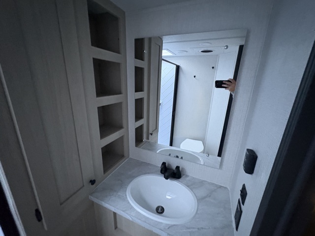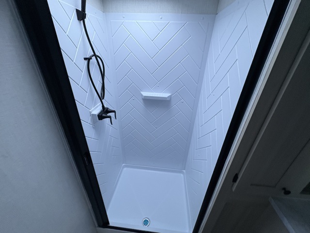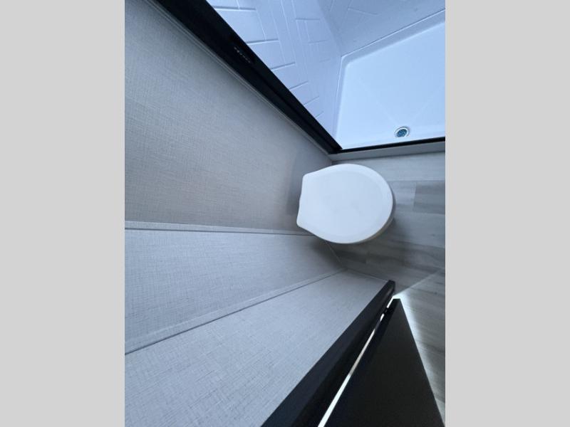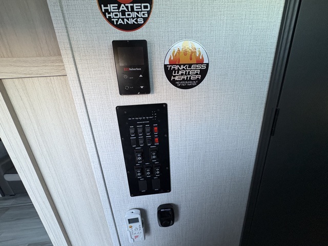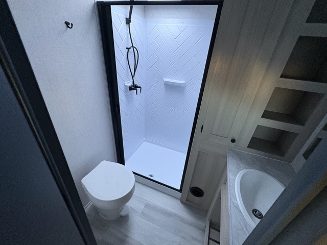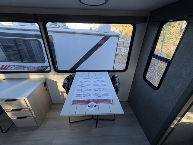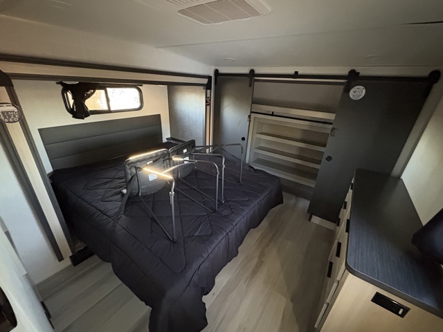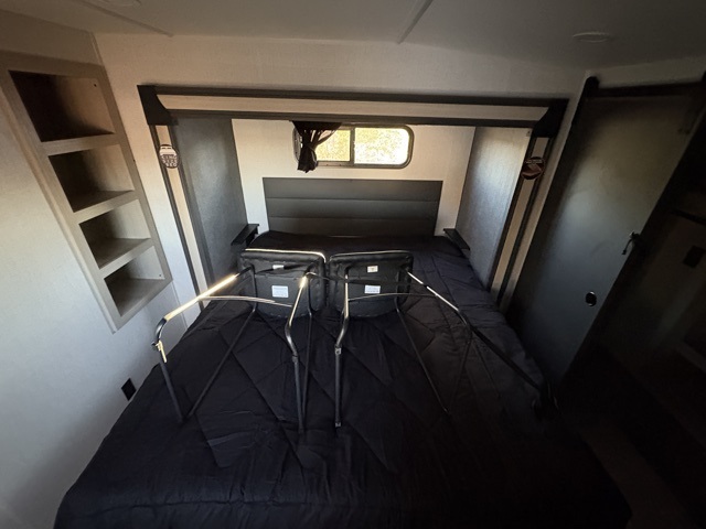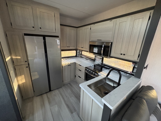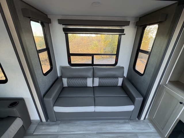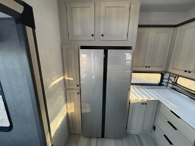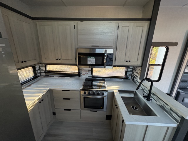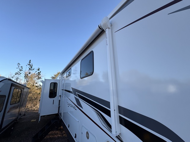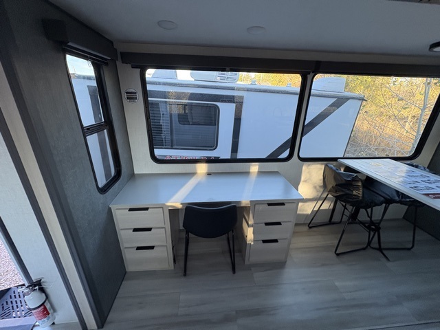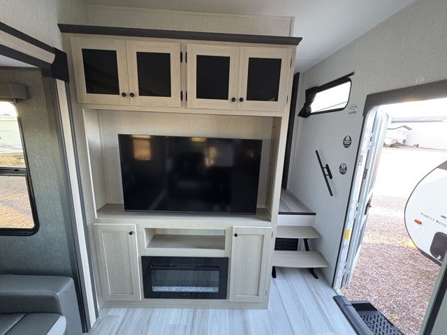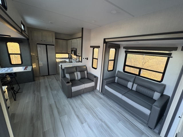 Cook like a chef worthy of a Michelin star in this amazing fifth wheel! Inside, you'll find a spacious rear kitchen, complete with a pantry, a 12V refrigerator ideal for keeping your fruits and vegetables fresh, overhead cabinets, and a sprawling countertop for all your cooking and dining times. The high-top table and chairs provide the perfect place to enjoy meals with family and friends. The living room is a cozy place featuring comfortable theater seating, a tri-fold sofa, a cozy fireplace, an entertainment center, and a convenient desk for staying productive on the go. The full bathroom is also a great place to freshen up, complete with a linen closet and all the amenities you need to take a bath and feel at home. With a spacious shower and plenty of storage, you'll have everything you need to start your day off right. The perfect place to rest and recharge after a long day of adventure is the front bedroom which boasts a comfortable king bed, dresser, walk-in wardrobe with washer and dryer prep, for keeping all your favorite belongings clean and organized on the road. Outside, you'll appreciate the pass-through storage for all your gear and toys, as well as the two awnings (15' and 11') ideal for creating unforgettable memories outside without worrying about the weather.
