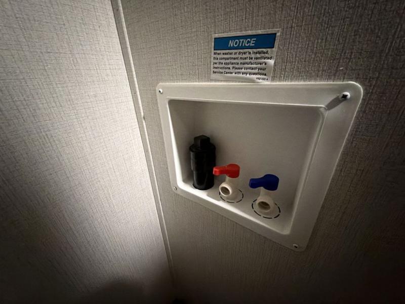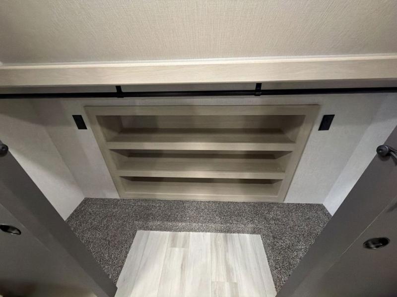 Cook like a chef worthy of a Michelin star in this amazing fifth wheel! Inside, you'll find a spacious rear kitchen, complete with a pantry, a 12V refrigerator ideal for keeping your fruits and vegetables fresh, overhead cabinets, and a sprawling countertop for all your cooking and dining times. The high-top table and chairs provide the perfect place to enjoy meals with family and friends. The living room is a cozy place featuring comfortable theater seating, a tri-fold sofa, a cozy fireplace, an entertainment center, and a convenient desk for staying productive on the go. The full bathroom is also a great place to freshen up, complete with a linen closet and all the amenities you need to take a bath and feel at home. With a spacious shower and plenty of storage, you'll have everything you need to start your day off right. The perfect place to rest and recharge after a long day of adventure is the front bedroom which boasts a comfortable king bed, dresser, walk-in wardrobe with washer and dryer prep, for keeping all your favorite belongings clean and organized on the road. Outside, you'll appreciate the pass-through storage for all your gear and toys, as well as the two awnings (15' and 11') ideal for creating unforgettable memories outside without worrying about the weather.