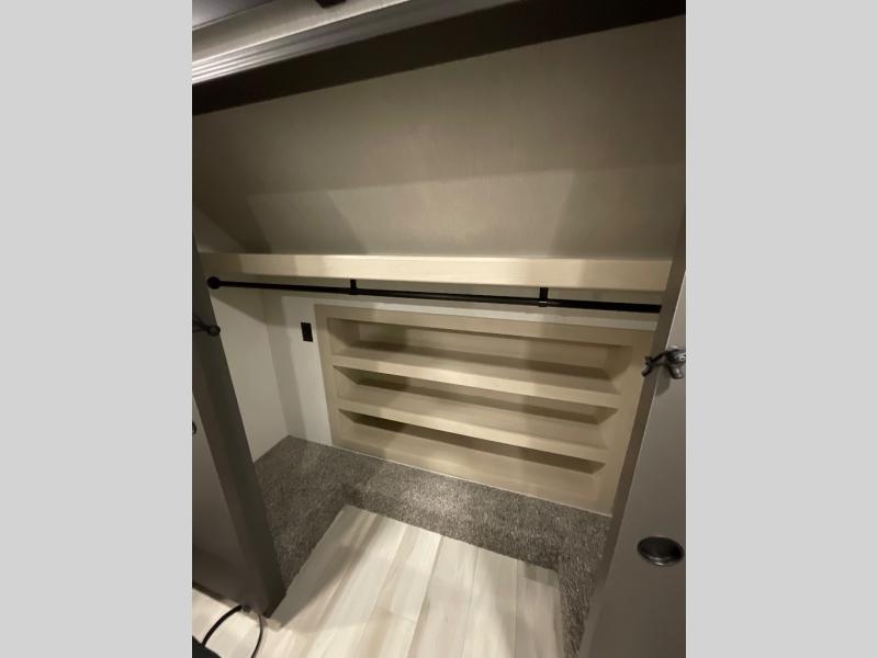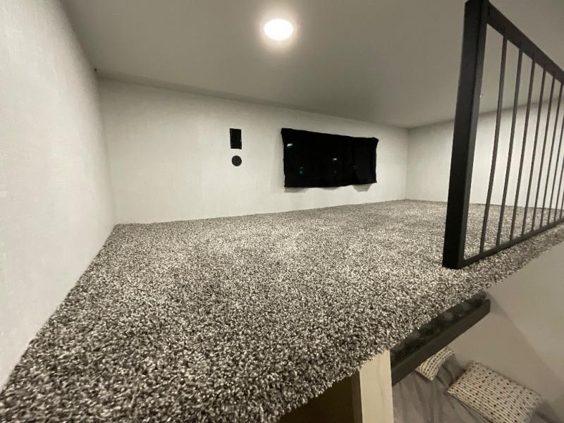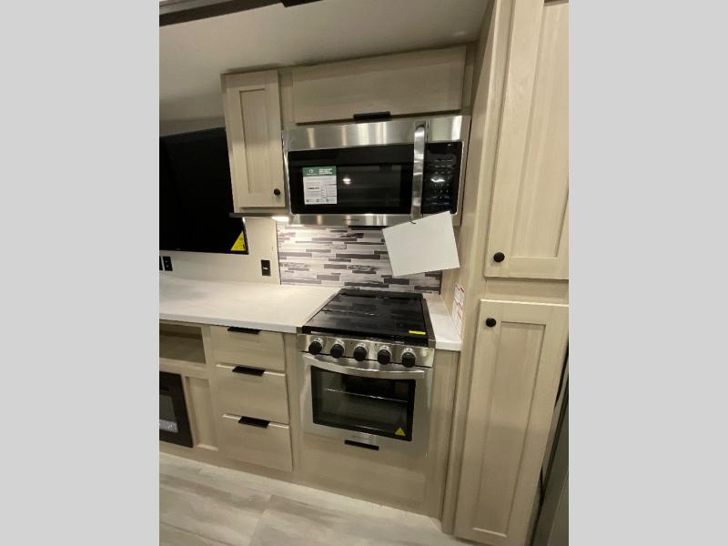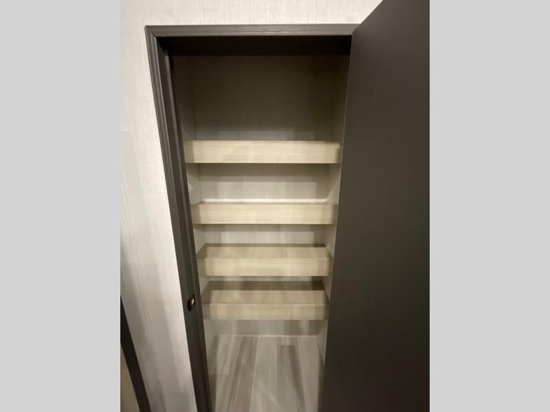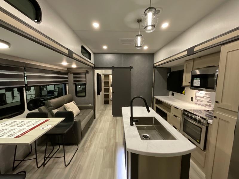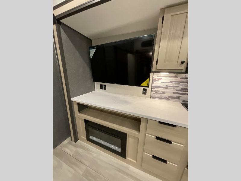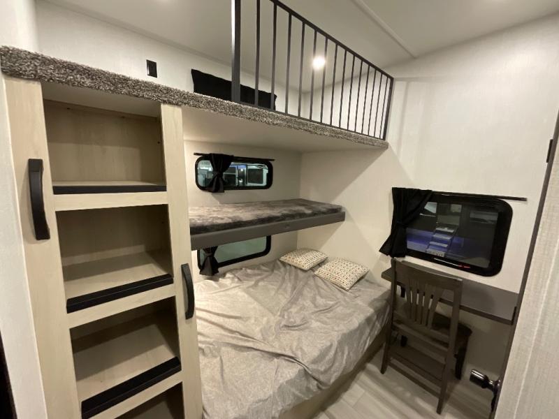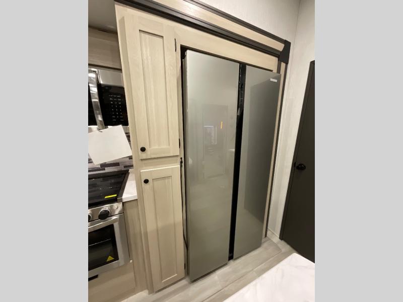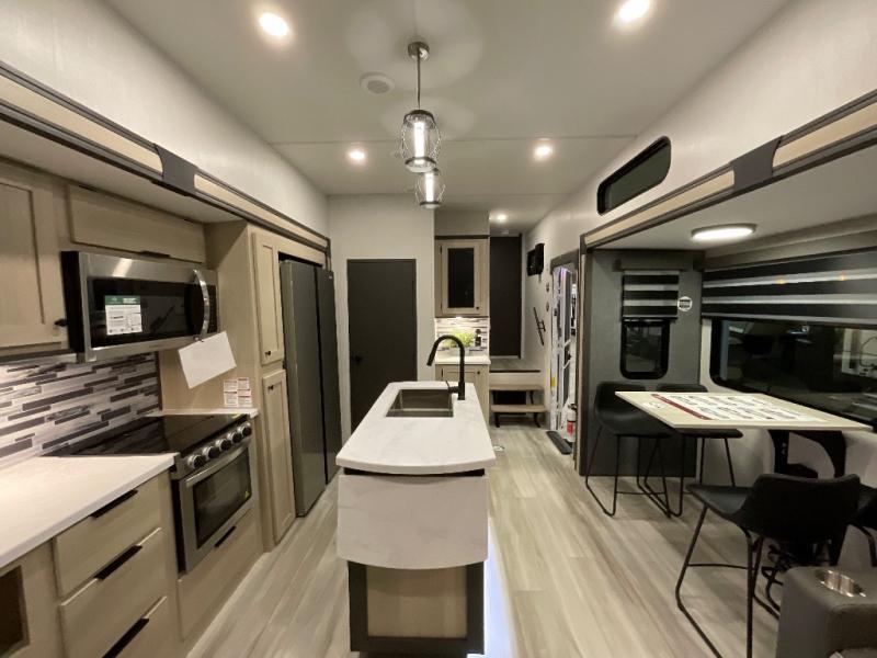 It will be so easy to enjoy extended stays in this spacious fifth wheel! Your guests are sure to love the rear private bunkhouse that includes a 54" x 74" bed below a bunk bed and a loft. This room even features its own full bath for added convenience. The second full bath is up front towards the private bedroom, which the owners can claim as their own. There is a king bed slide out here, along with a walk-in closet with a wardrobe plus washer and dryer prep. Everyone can meet in the middle kitchen and living area as the chef of your group prepares breakfast on the 21" 2-in-1 oven range! There are also two pantries and a 16 cu. ft. 12V refrigerator to store food, plus a coffee bar where you can set up a drink station. After a day of exploring outdoors, you can relax on the theater seating, which is in direct view of the fireplace and entertainment center!