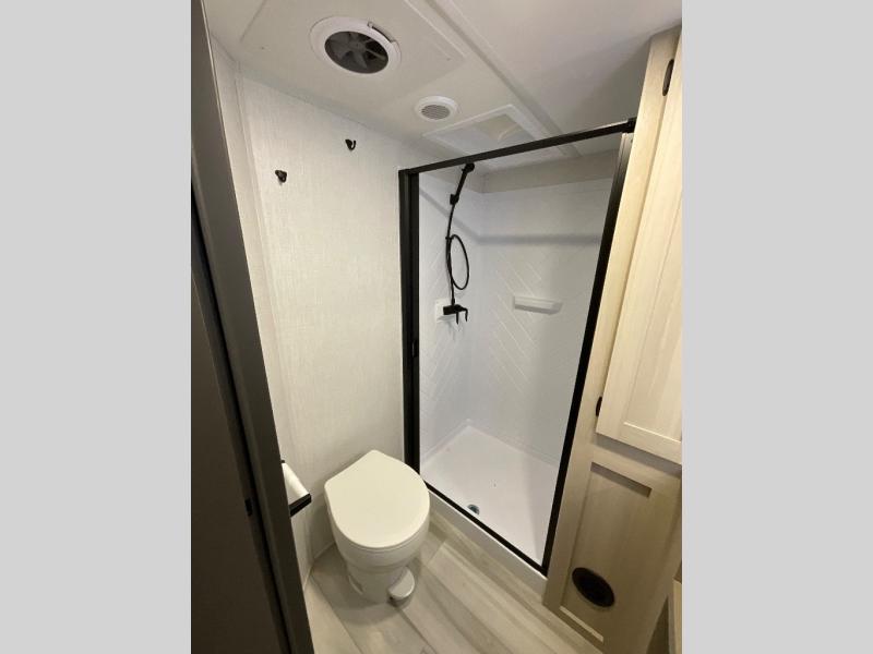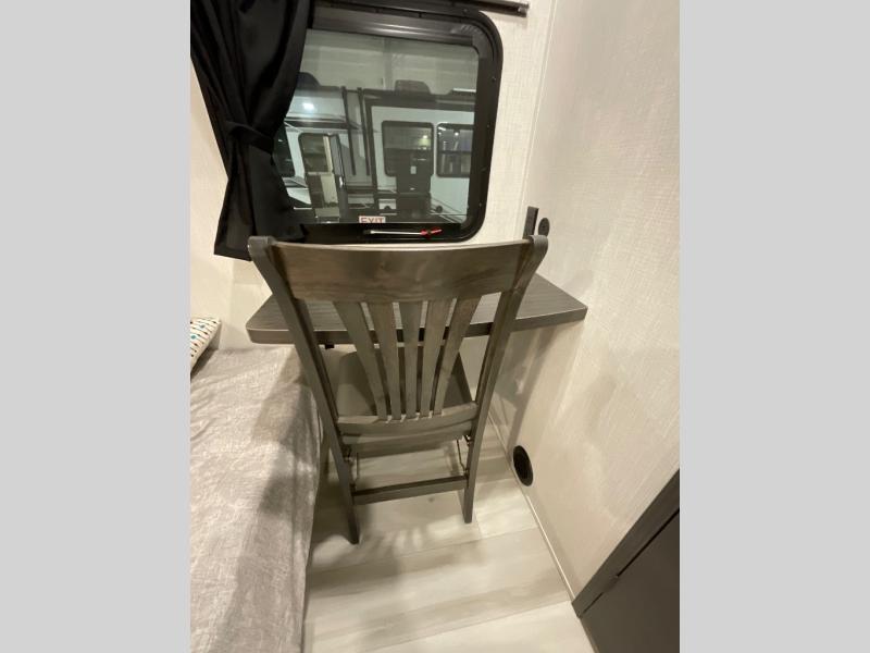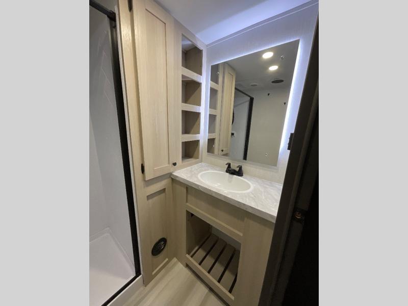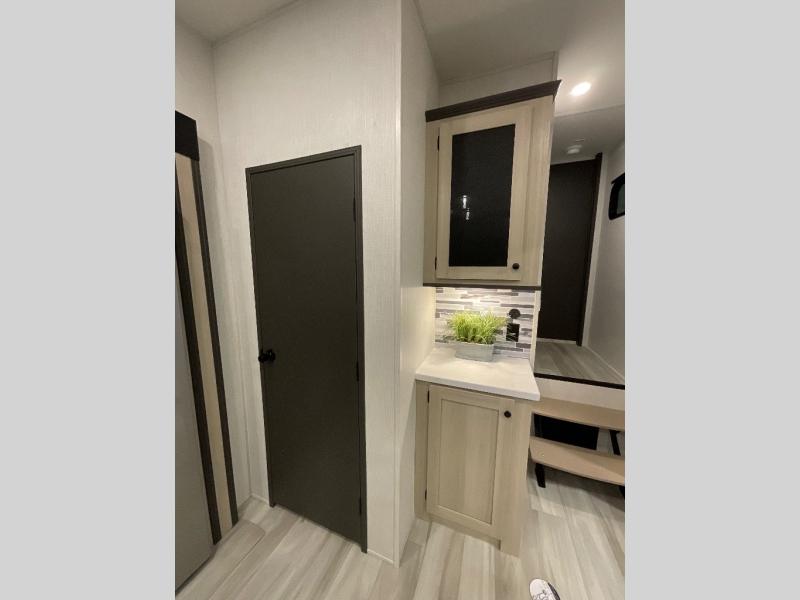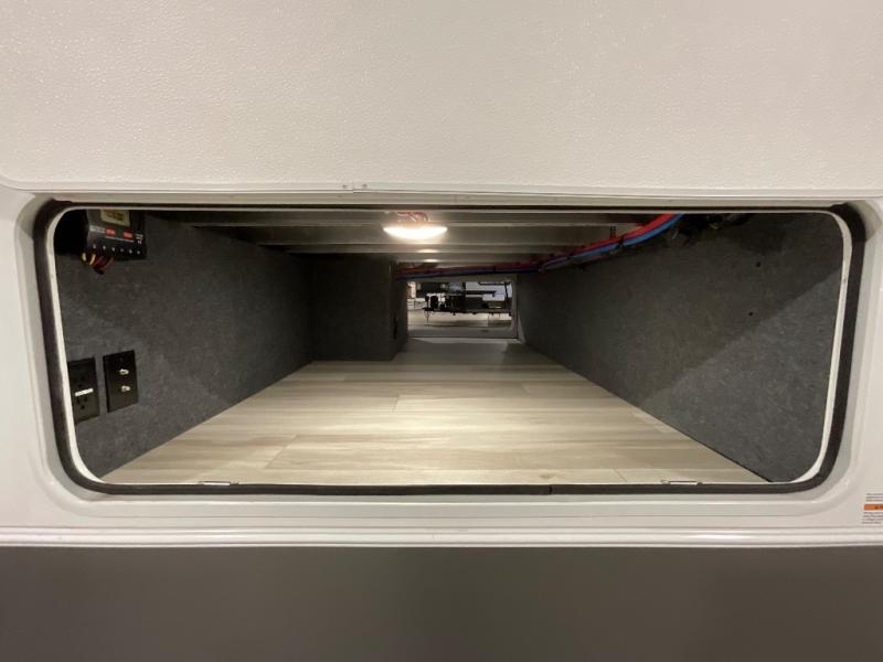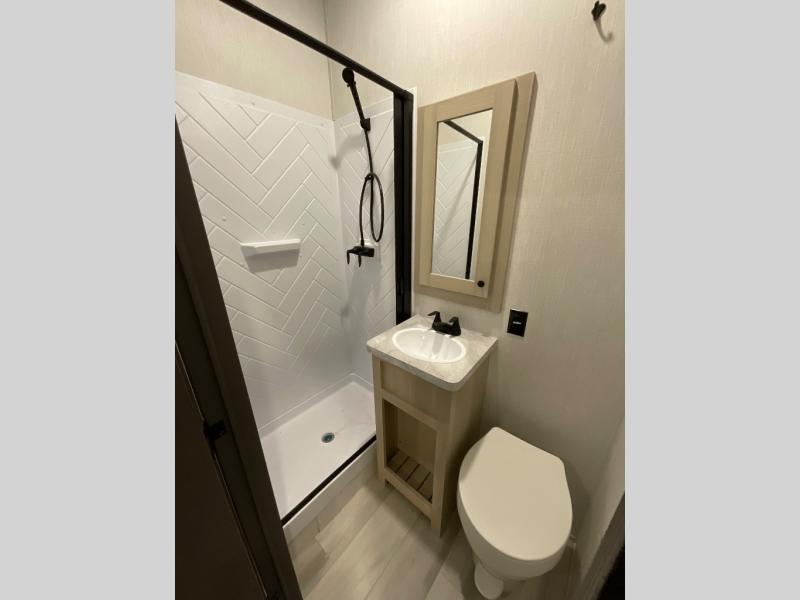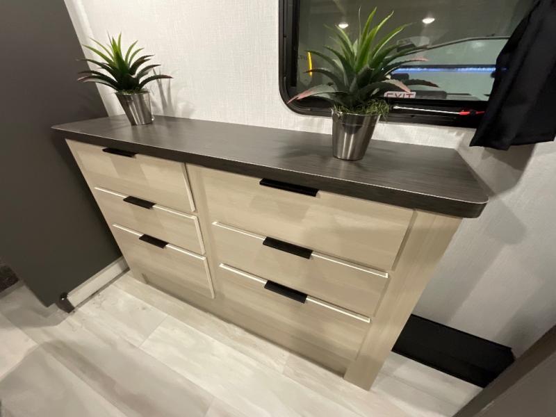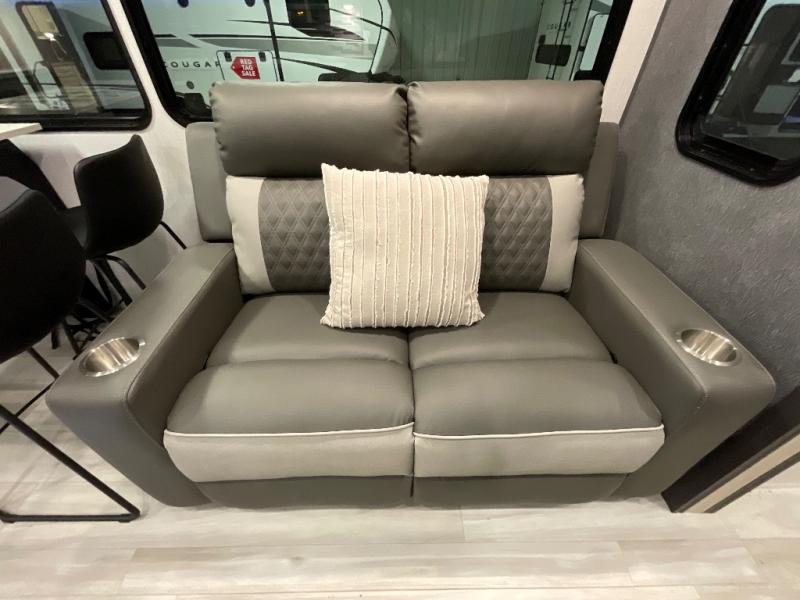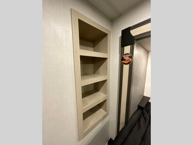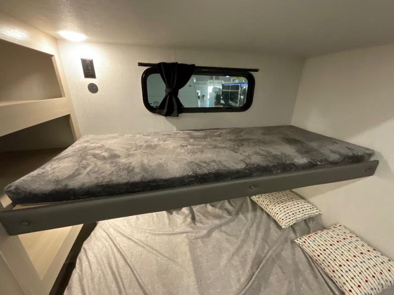 It will be so easy to enjoy extended stays in this spacious fifth wheel! Your guests are sure to love the rear private bunkhouse that includes a 54" x 74" bed below a bunk bed and a loft. This room even features its own full bath for added convenience. The second full bath is up front towards the private bedroom, which the owners can claim as their own. There is a king bed slide out here, along with a walk-in closet with a wardrobe plus washer and dryer prep. Everyone can meet in the middle kitchen and living area as the chef of your group prepares breakfast on the 21" 2-in-1 oven range! There are also two pantries and a 16 cu. ft. 12V refrigerator to store food, plus a coffee bar where you can set up a drink station. After a day of exploring outdoors, you can relax on the theater seating, which is in direct view of the fireplace and entertainment center!