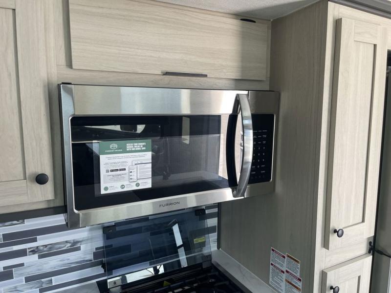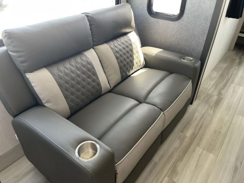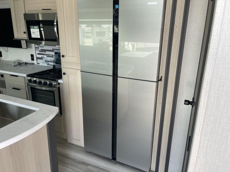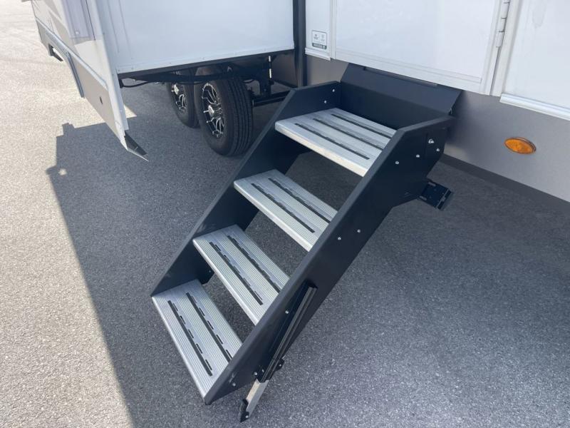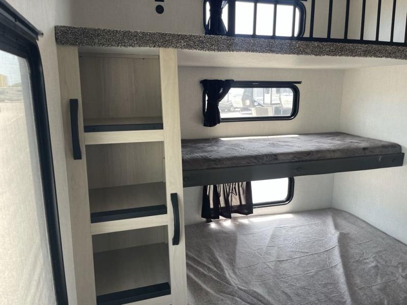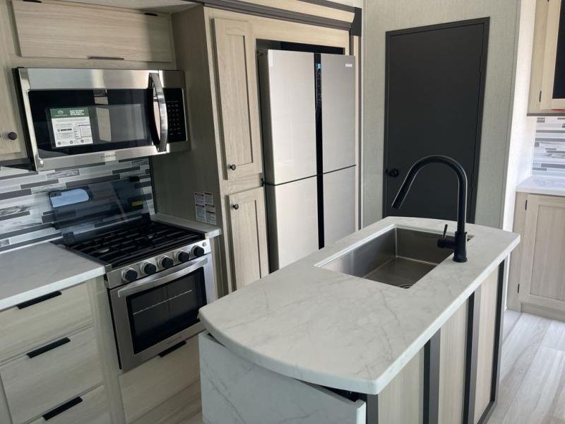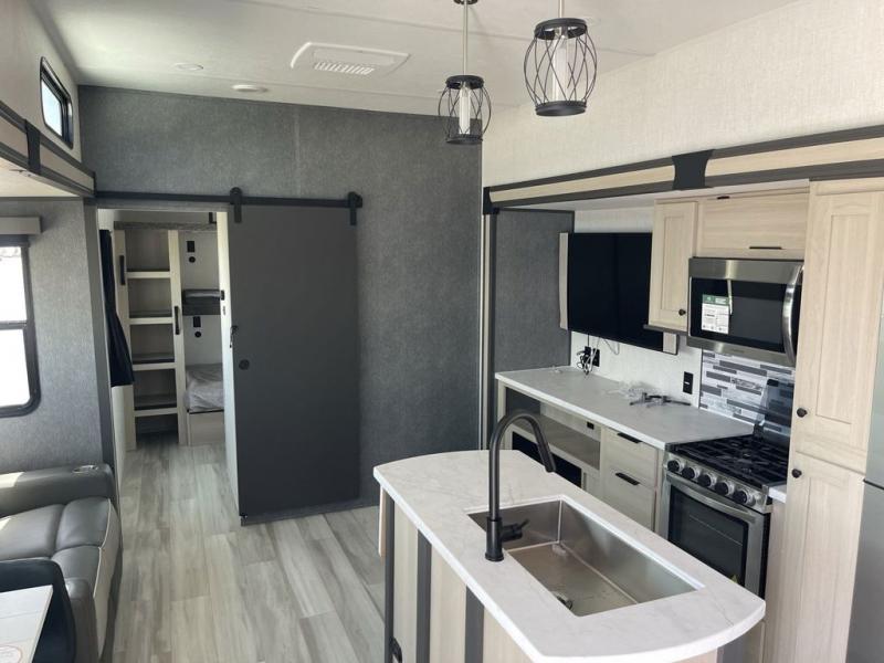 It will be so easy to enjoy extended stays in this spacious fifth wheel! Your guests are sure to love the rear private bunkhouse that includes a 54" x 74" bed below a bunk bed and a loft. This room even features its own full bath for added convenience. The second full bath is up front towards the private bedroom, which the owners can claim as their own. There is a king bed slide out here, along with a walk-in closet with a wardrobe plus washer and dryer prep. Everyone can meet in the middle kitchen and living area as the chef of your group prepares breakfast on the 21" 2-in-1 oven range! There are also two pantries and a 16 cu. ft. 12V refrigerator to store food, plus a coffee bar where you can set up a drink station. After a day of exploring outdoors, you can relax on the theater seating, which is in direct view of the fireplace and entertainment center!