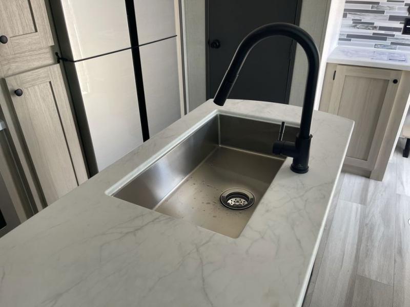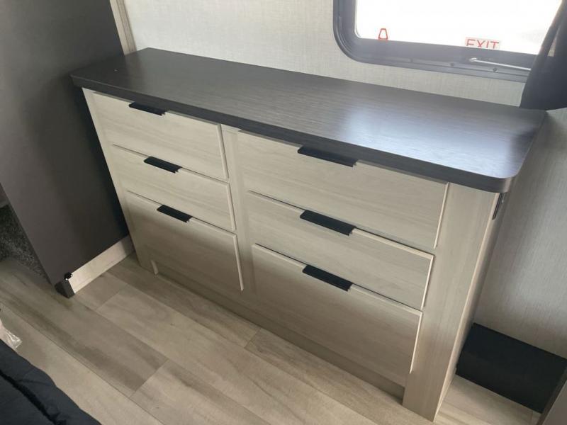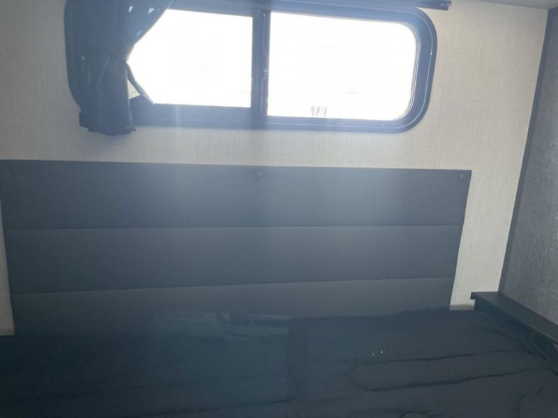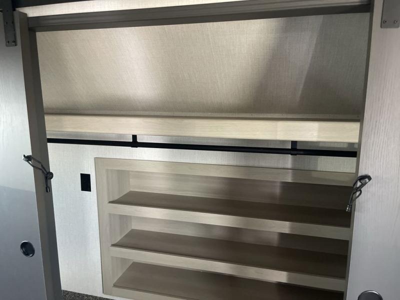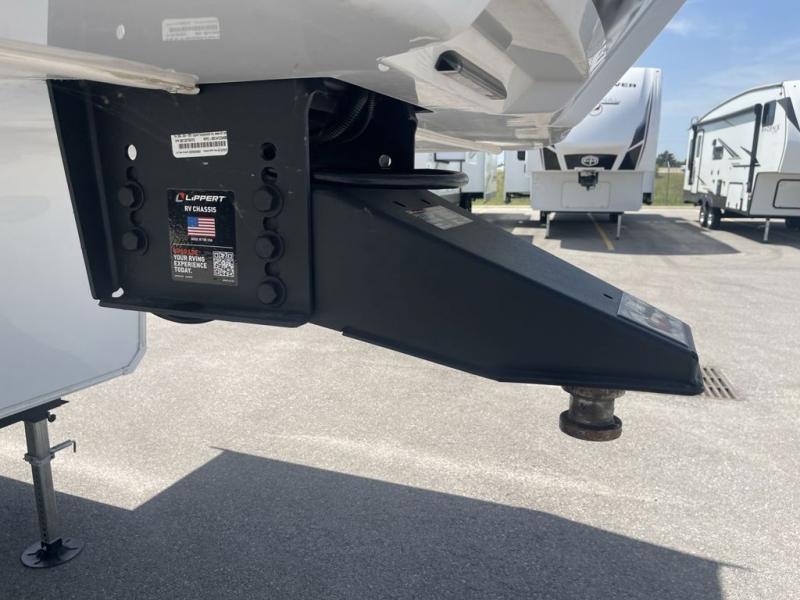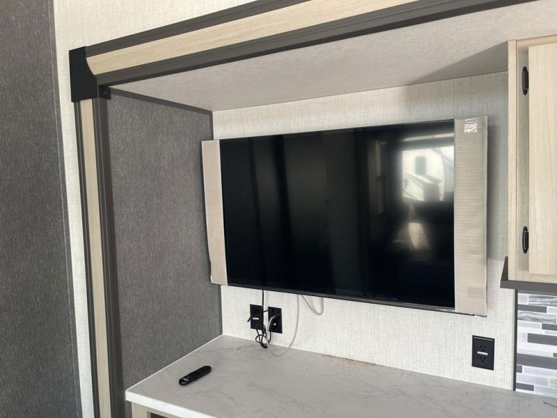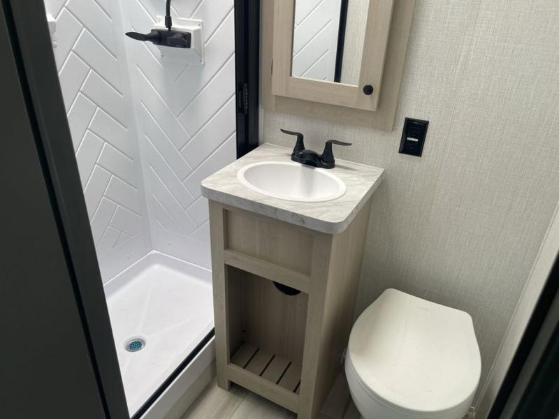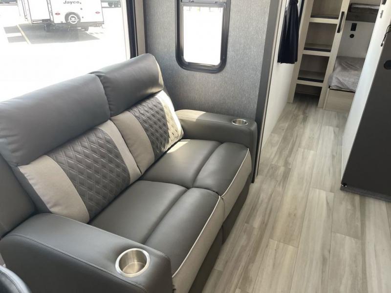 It will be so easy to enjoy extended stays in this spacious fifth wheel! Your guests are sure to love the rear private bunkhouse that includes a 54" x 74" bed below a bunk bed and a loft. This room even features its own full bath for added convenience. The second full bath is up front towards the private bedroom, which the owners can claim as their own. There is a king bed slide out here, along with a walk-in closet with a wardrobe plus washer and dryer prep. Everyone can meet in the middle kitchen and living area as the chef of your group prepares breakfast on the 21" 2-in-1 oven range! There are also two pantries and a 16 cu. ft. 12V refrigerator to store food, plus a coffee bar where you can set up a drink station. After a day of exploring outdoors, you can relax on the theater seating, which is in direct view of the fireplace and entertainment center!