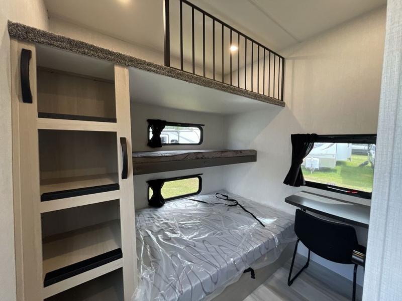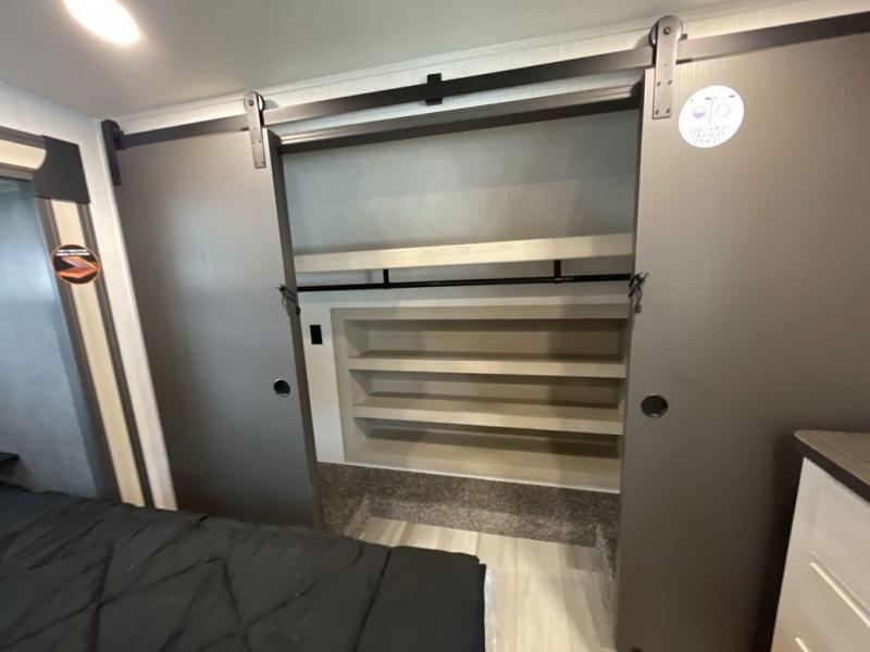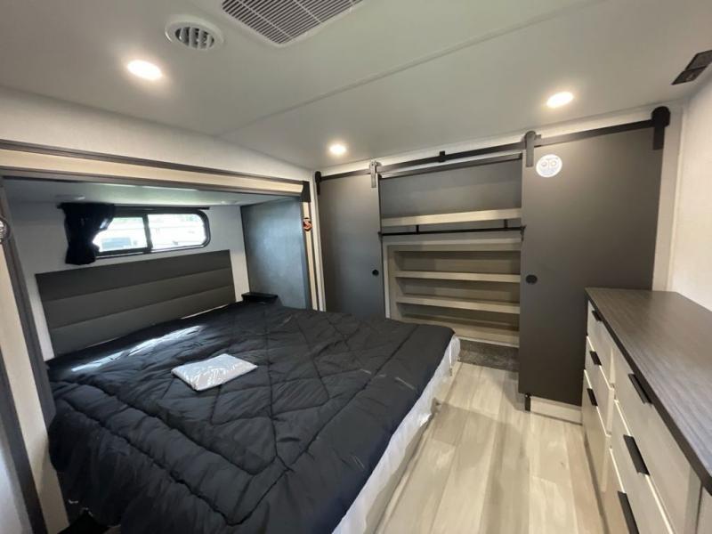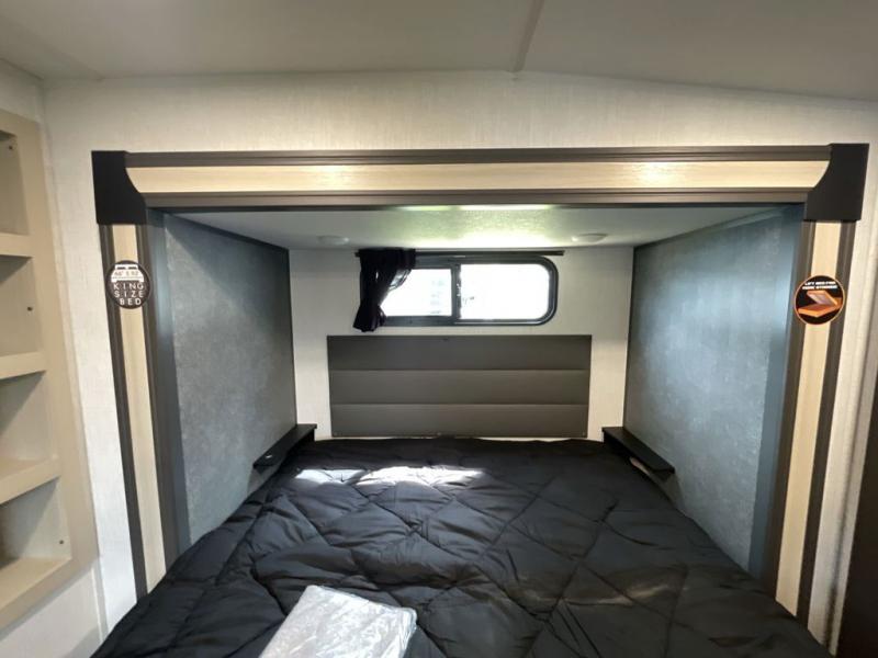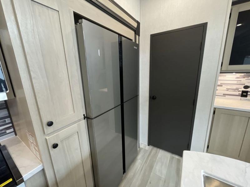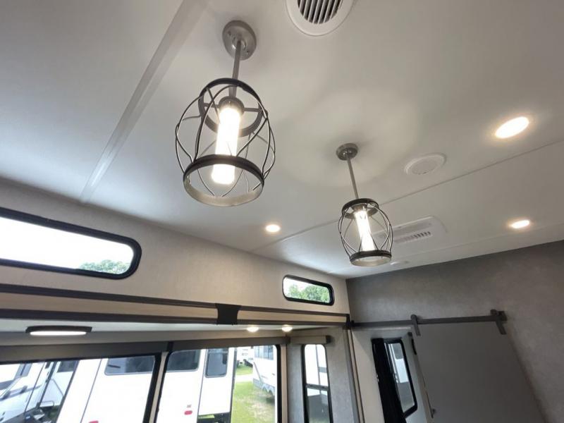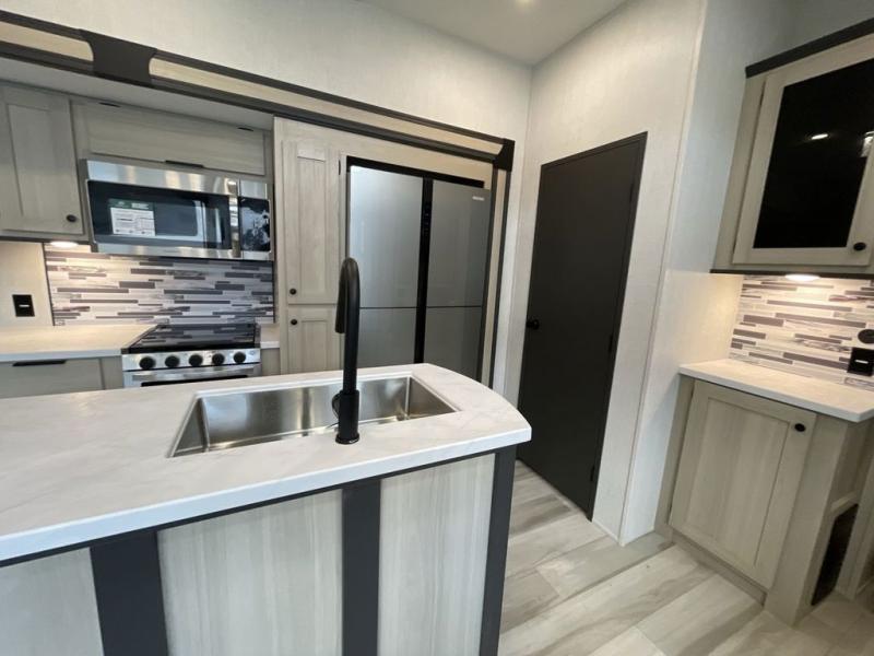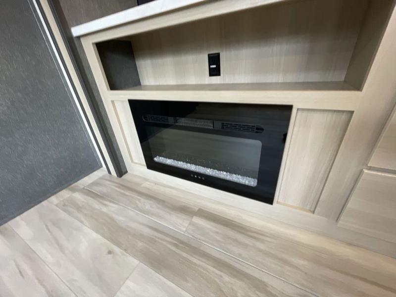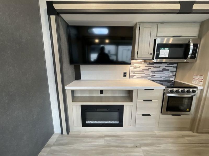 It will be so easy to enjoy extended stays in this spacious fifth wheel! Your guests are sure to love the rear private bunkhouse that includes a 54" x 74" bed below a bunk bed and a loft. This room even features its own full bath for added convenience. The second full bath is up front towards the private bedroom, which the owners can claim as their own. There is a king bed slide out here, along with a walk-in closet with a wardrobe plus washer and dryer prep. Everyone can meet in the middle kitchen and living area as the chef of your group prepares breakfast on the 21" 2-in-1 oven range! There are also two pantries and a 16 cu. ft. 12V refrigerator to store food, plus a coffee bar where you can set up a drink station. After a day of exploring outdoors, you can relax on the theater seating, which is in direct view of the fireplace and entertainment center!