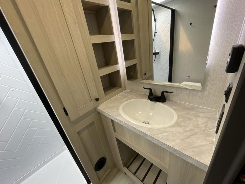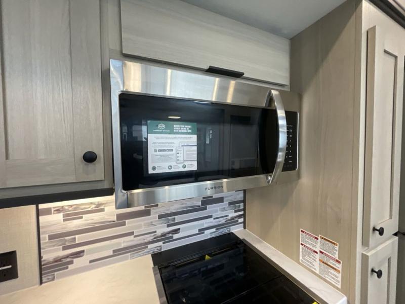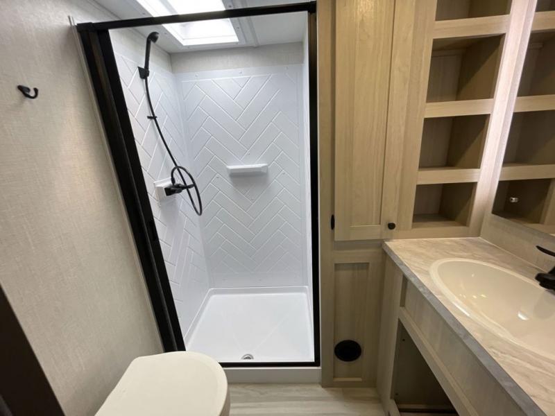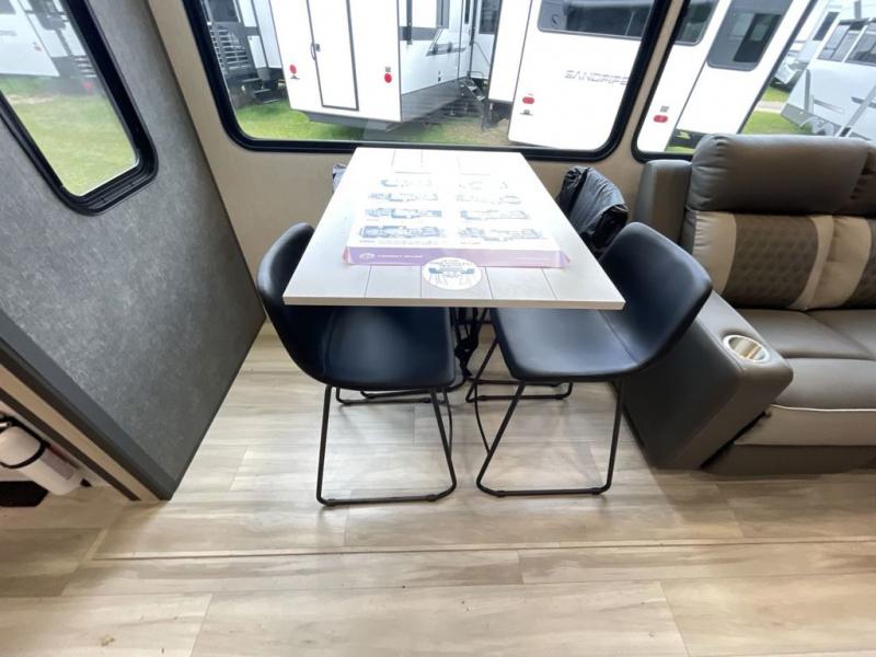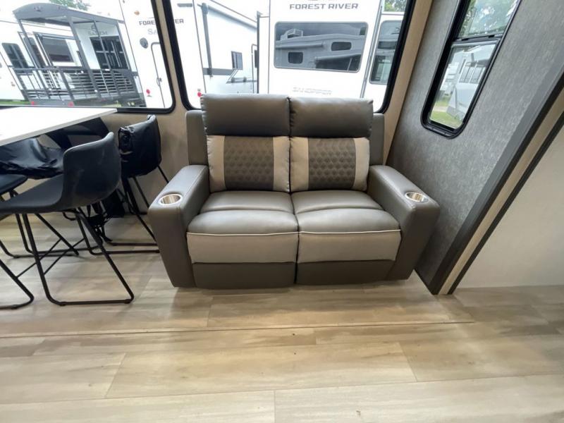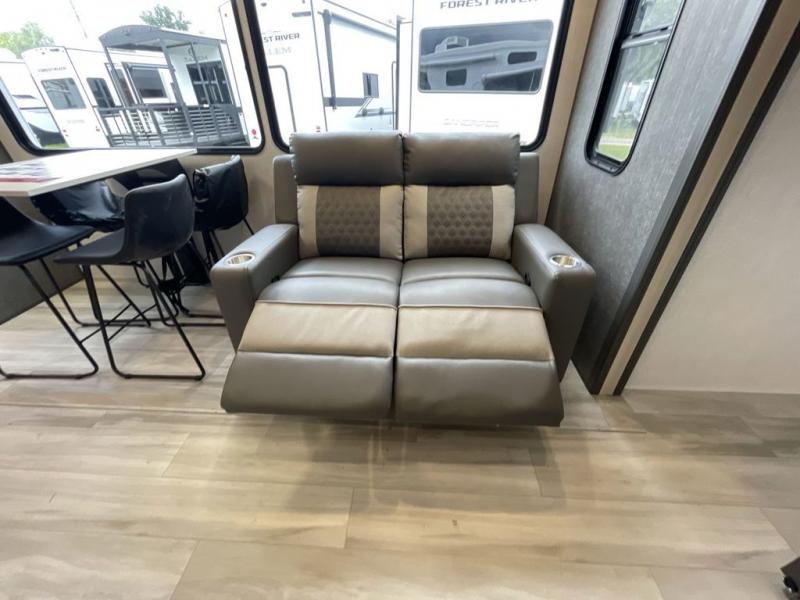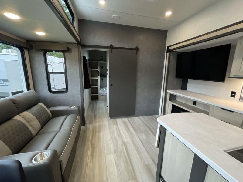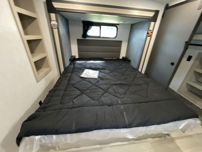 It will be so easy to enjoy extended stays in this spacious fifth wheel! Your guests are sure to love the rear private bunkhouse that includes a 54" x 74" bed below a bunk bed and a loft. This room even features its own full bath for added convenience. The second full bath is up front towards the private bedroom, which the owners can claim as their own. There is a king bed slide out here, along with a walk-in closet with a wardrobe plus washer and dryer prep. Everyone can meet in the middle kitchen and living area as the chef of your group prepares breakfast on the 21" 2-in-1 oven range! There are also two pantries and a 16 cu. ft. 12V refrigerator to store food, plus a coffee bar where you can set up a drink station. After a day of exploring outdoors, you can relax on the theater seating, which is in direct view of the fireplace and entertainment center!