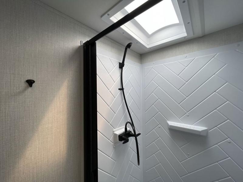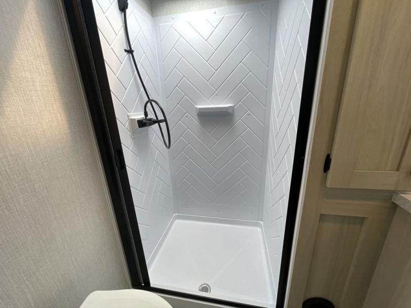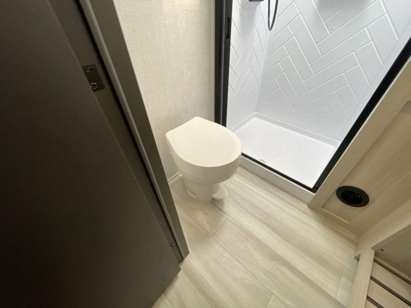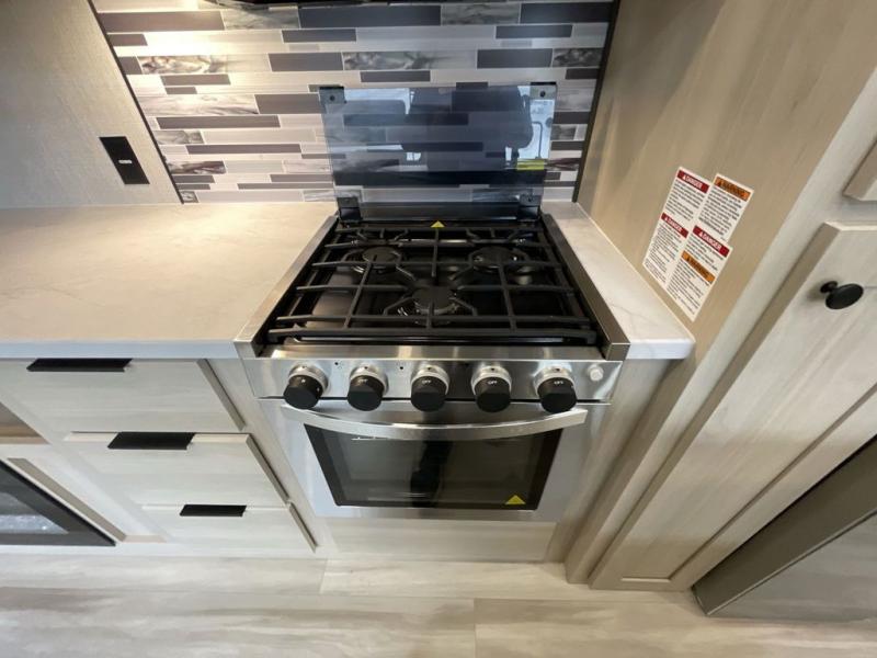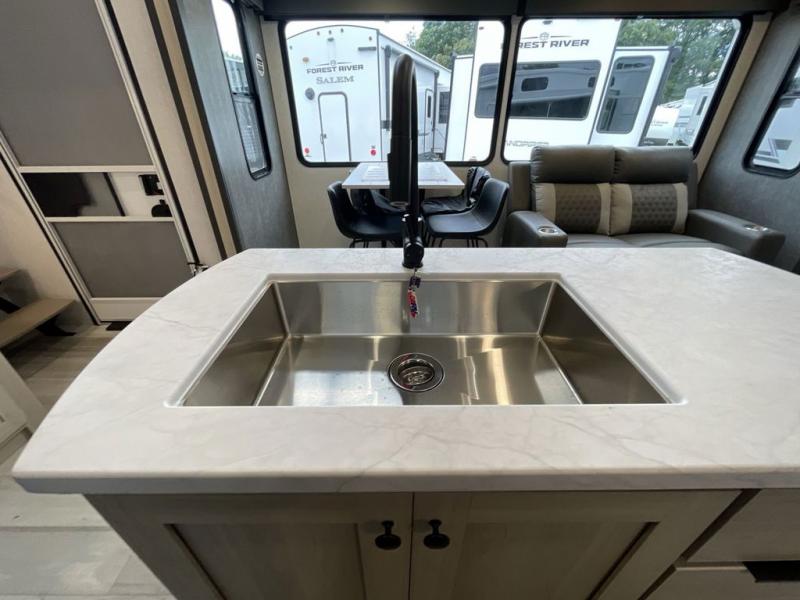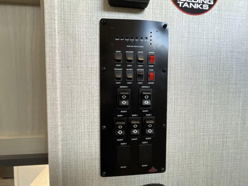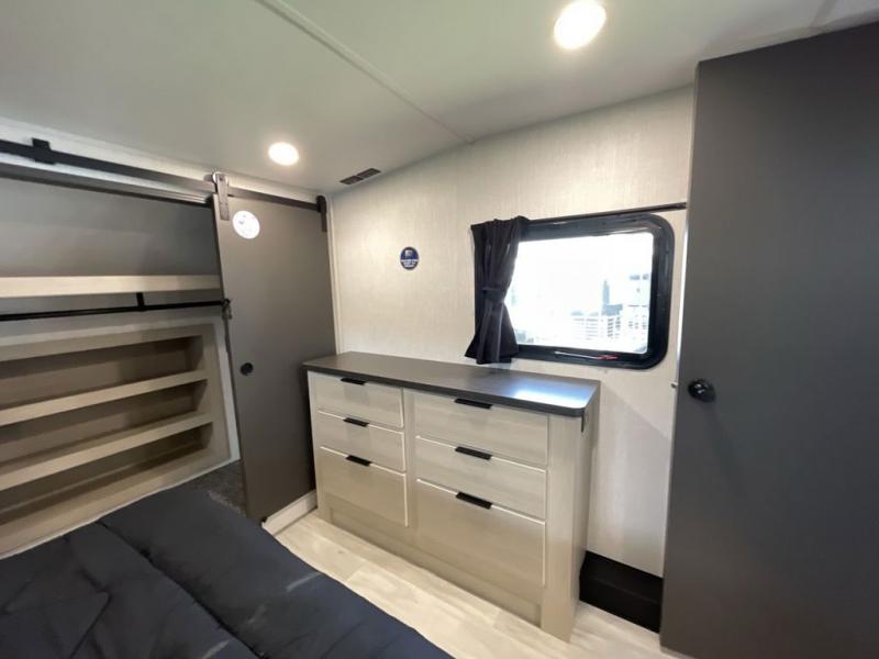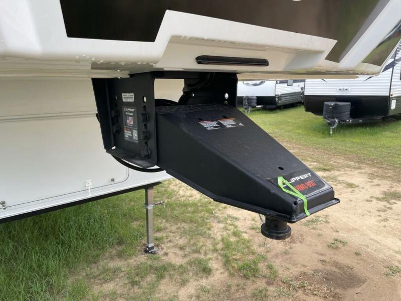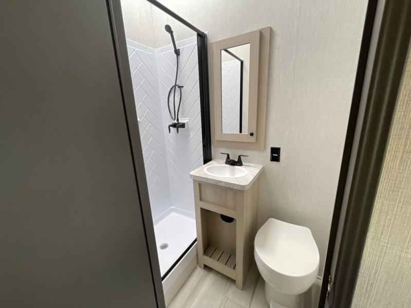 It will be so easy to enjoy extended stays in this spacious fifth wheel! Your guests are sure to love the rear private bunkhouse that includes a 54" x 74" bed below a bunk bed and a loft. This room even features its own full bath for added convenience. The second full bath is up front towards the private bedroom, which the owners can claim as their own. There is a king bed slide out here, along with a walk-in closet with a wardrobe plus washer and dryer prep. Everyone can meet in the middle kitchen and living area as the chef of your group prepares breakfast on the 21" 2-in-1 oven range! There are also two pantries and a 16 cu. ft. 12V refrigerator to store food, plus a coffee bar where you can set up a drink station. After a day of exploring outdoors, you can relax on the theater seating, which is in direct view of the fireplace and entertainment center!