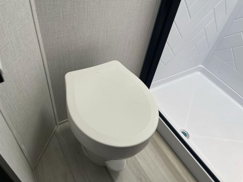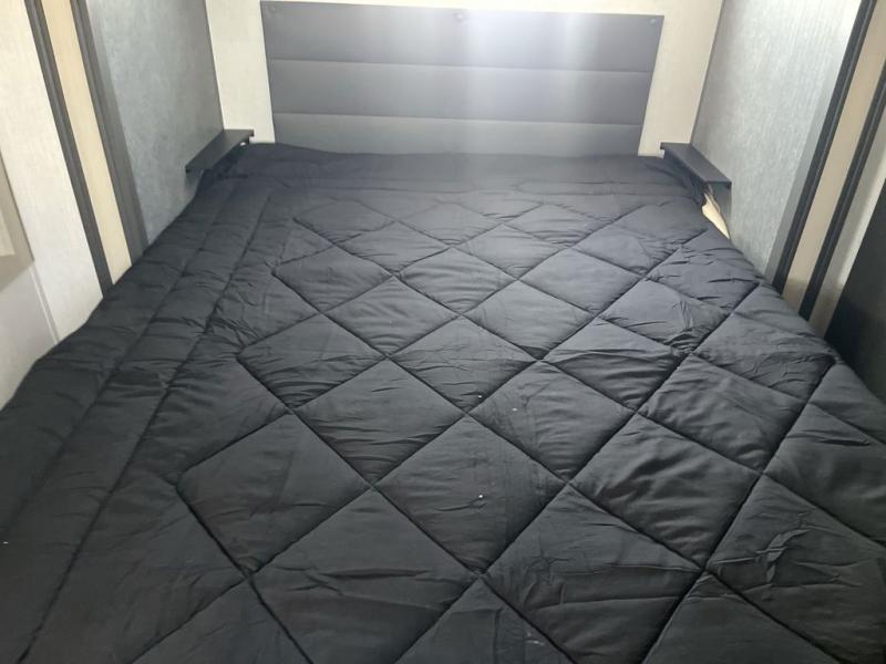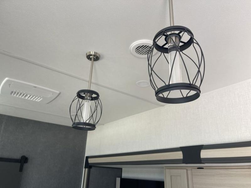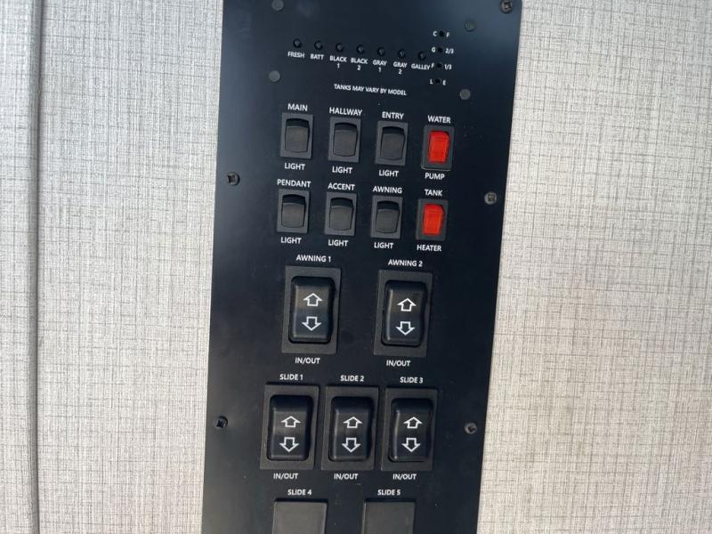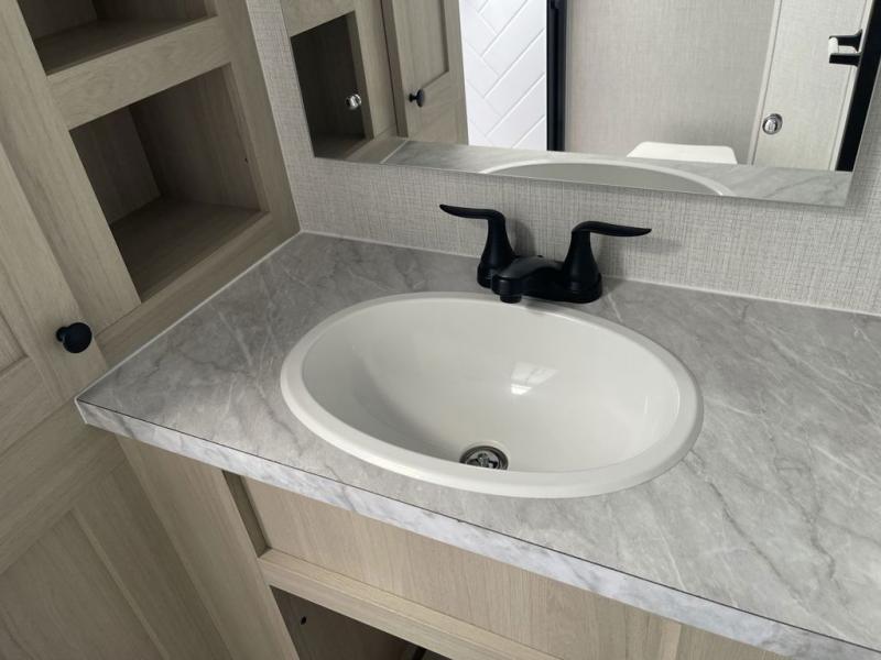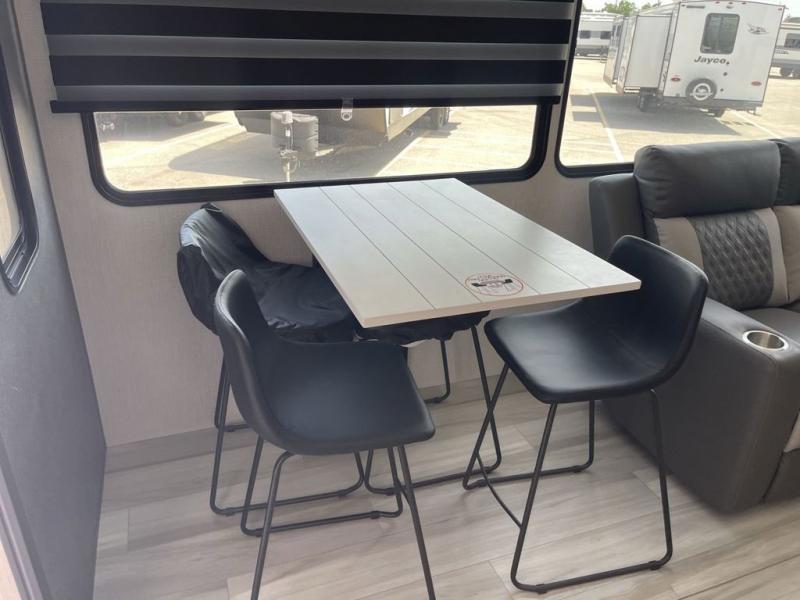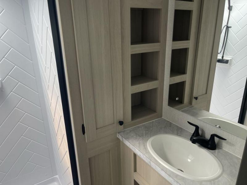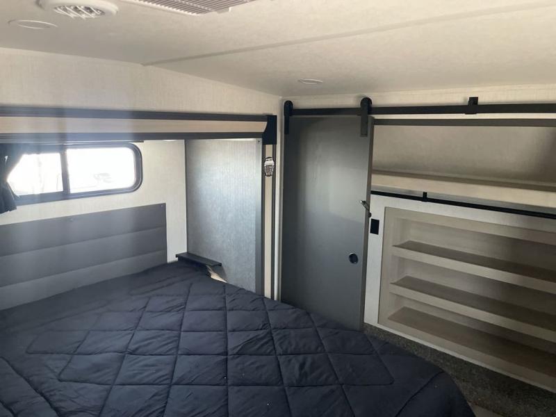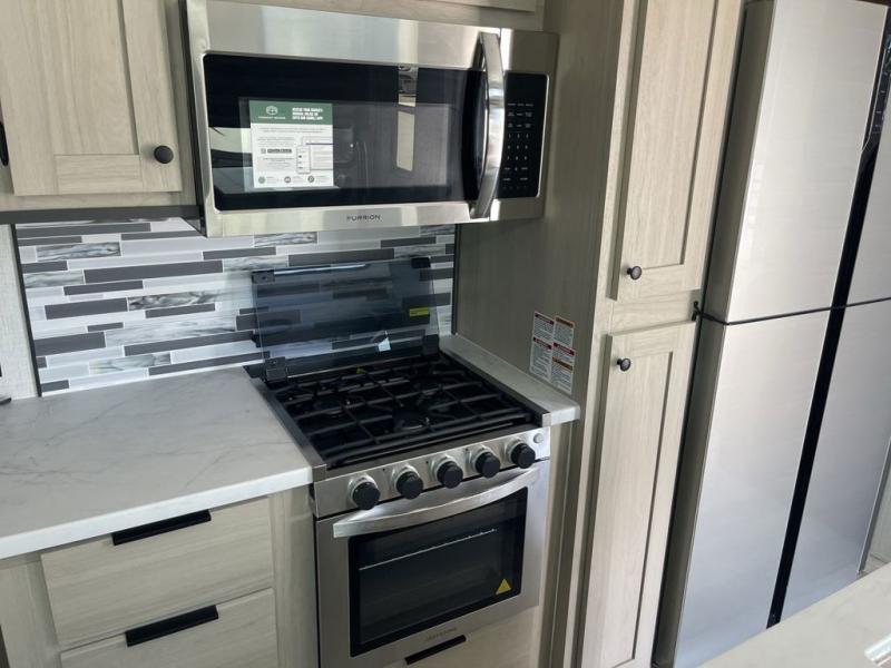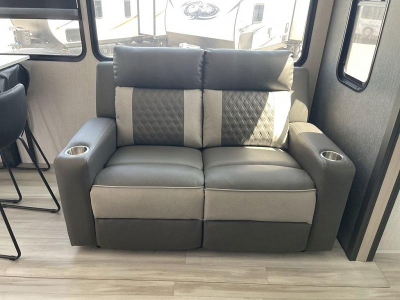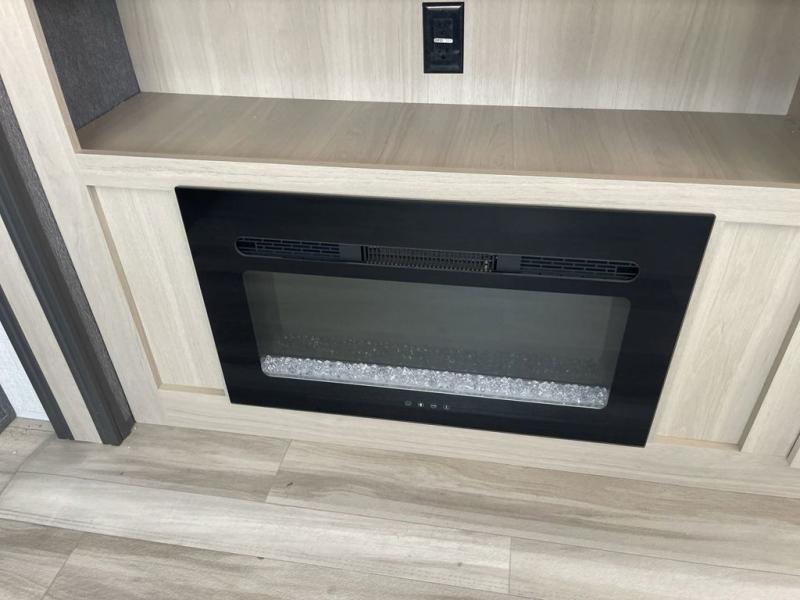 It will be so easy to enjoy extended stays in this spacious fifth wheel! Your guests are sure to love the rear private bunkhouse that includes a 54" x 74" bed below a bunk bed and a loft. This room even features its own full bath for added convenience. The second full bath is up front towards the private bedroom, which the owners can claim as their own. There is a king bed slide out here, along with a walk-in closet with a wardrobe plus washer and dryer prep. Everyone can meet in the middle kitchen and living area as the chef of your group prepares breakfast on the 21" 2-in-1 oven range! There are also two pantries and a 16 cu. ft. 12V refrigerator to store food, plus a coffee bar where you can set up a drink station. After a day of exploring outdoors, you can relax on the theater seating, which is in direct view of the fireplace and entertainment center!