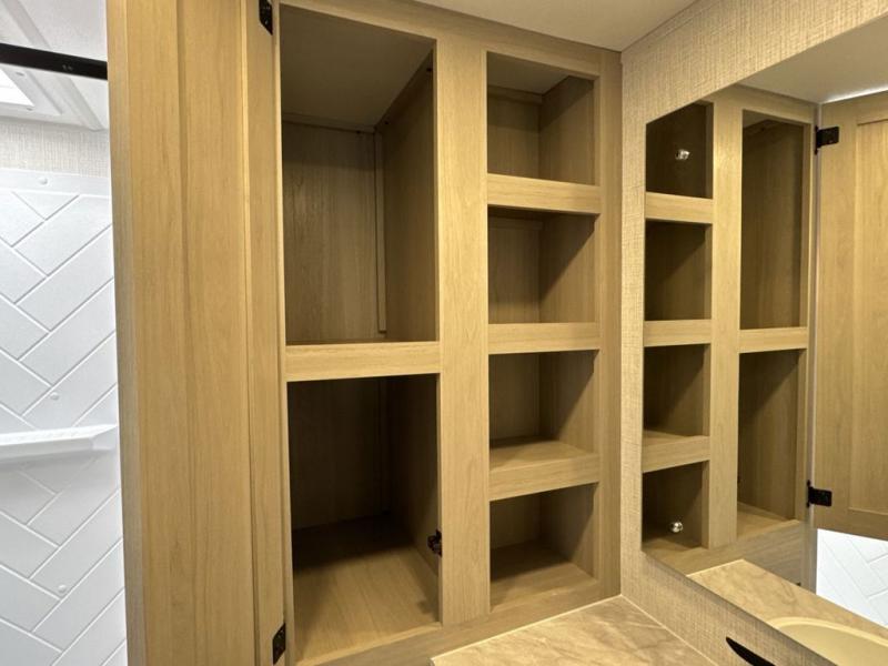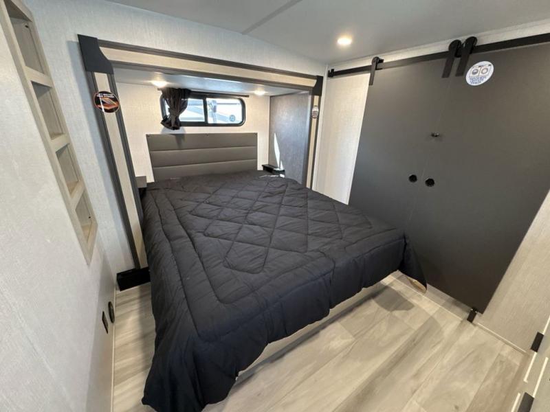 It will be so easy to enjoy extended stays in this spacious fifth wheel! Your guests are sure to love the rear private bunkhouse that includes a 54" x 74" bed below a bunk bed and a loft. This room even features its own full bath for added convenience. The second full bath is up front towards the private bedroom, which the owners can claim as their own. There is a king bed slide out here, along with a walk-in closet with a wardrobe plus washer and dryer prep. Everyone can meet in the middle kitchen and living area as the chef of your group prepares breakfast on the 21" 2-in-1 oven range! There are also two pantries and a 16 cu. ft. 12V refrigerator to store food, plus a coffee bar where you can set up a drink station. After a day of exploring outdoors, you can relax on the theater seating, which is in direct view of the fireplace and entertainment center!