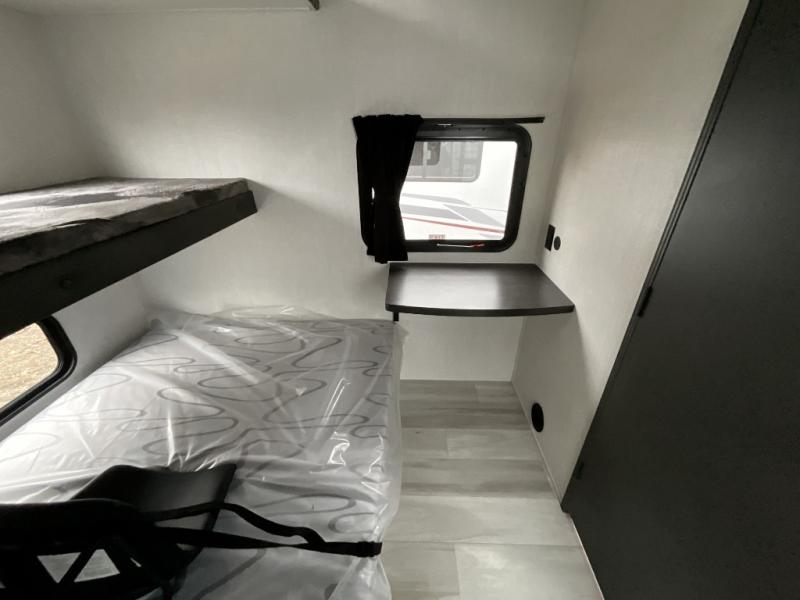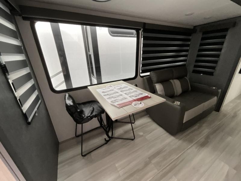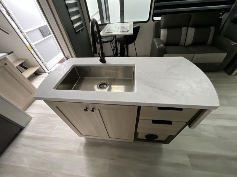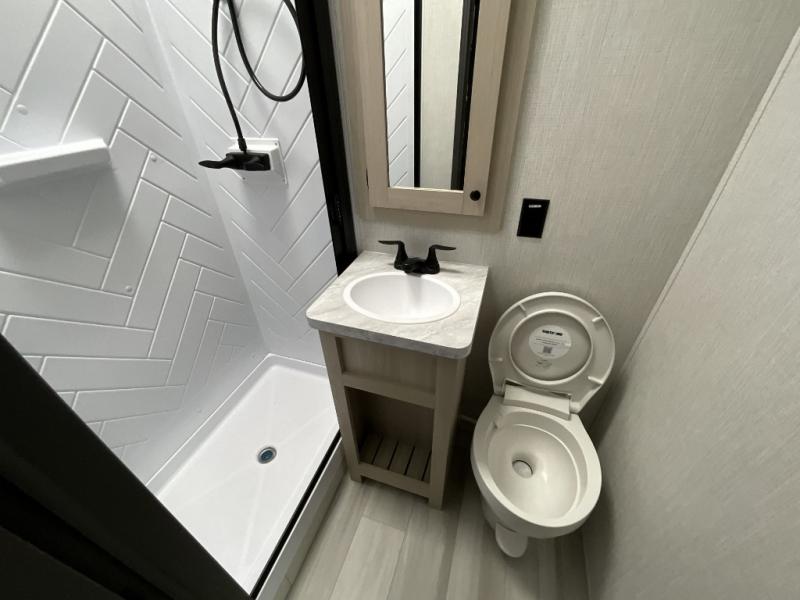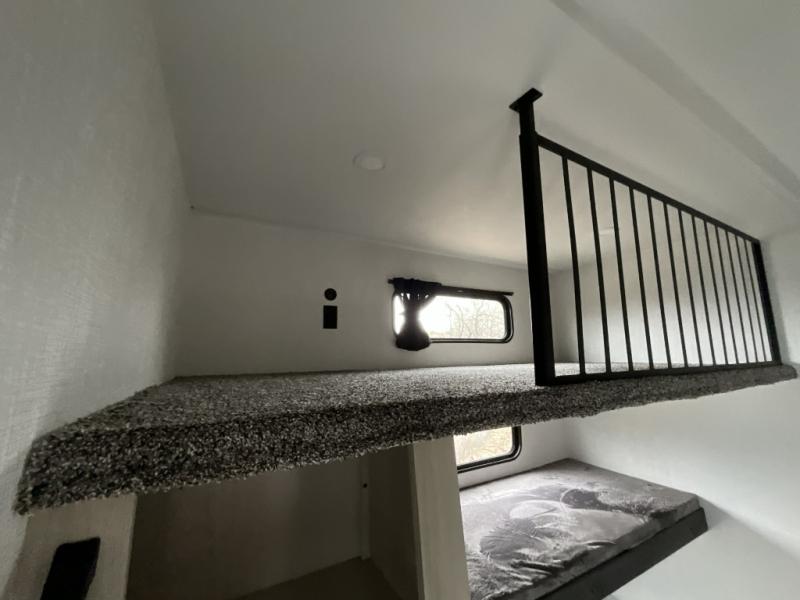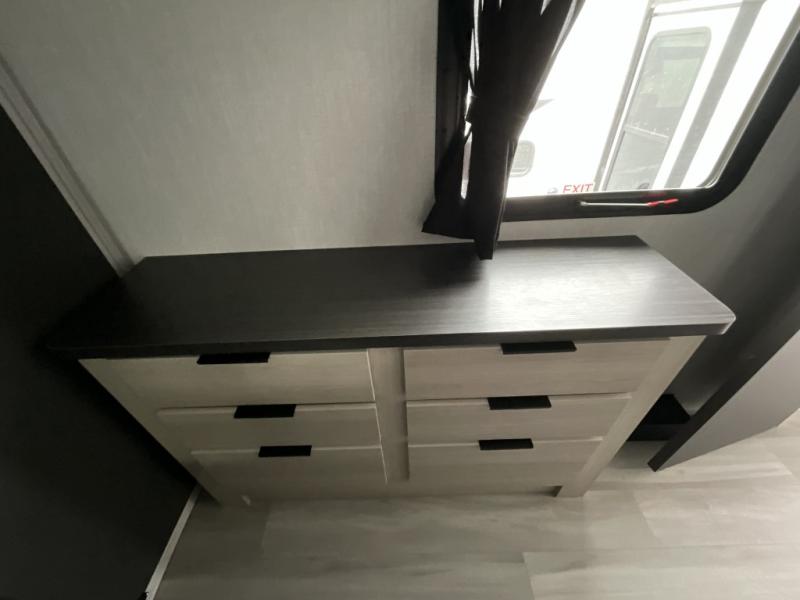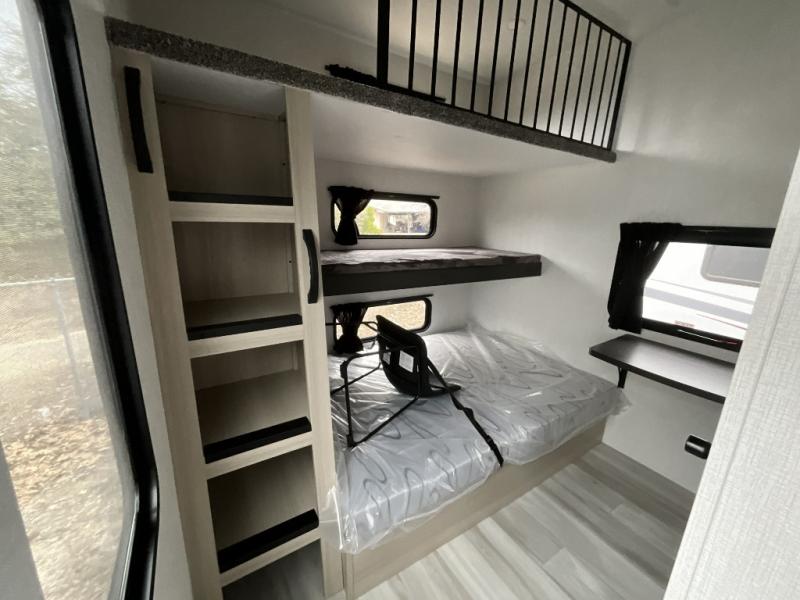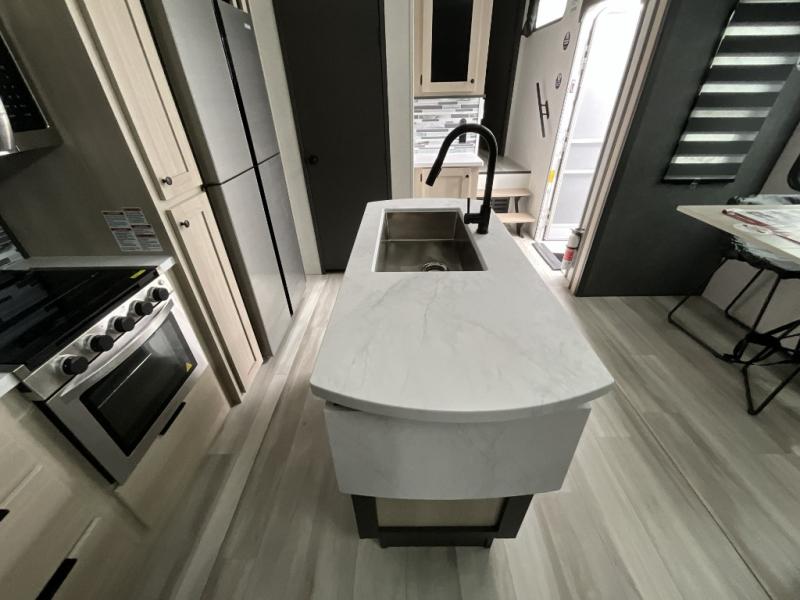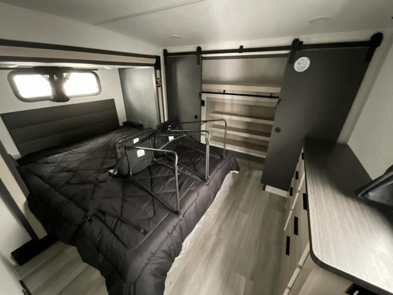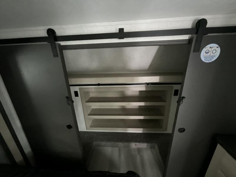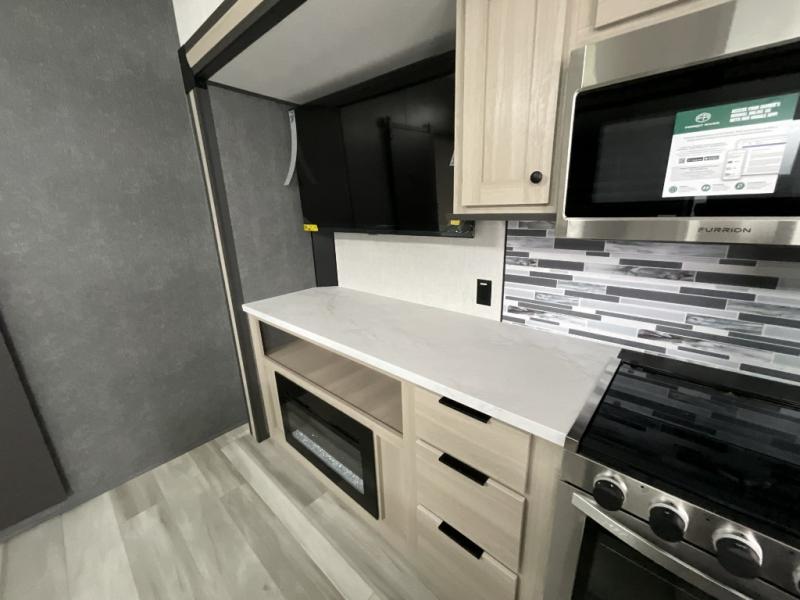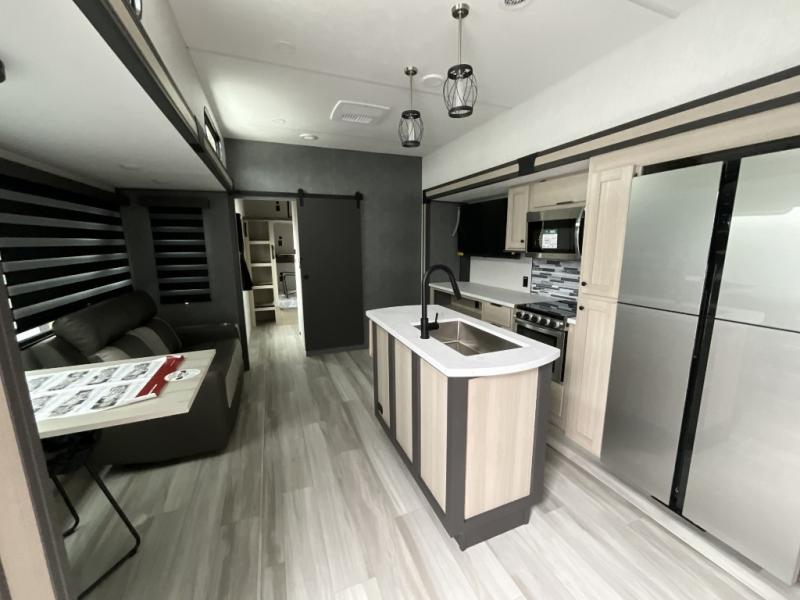 It will be so easy to enjoy extended stays in this spacious fifth wheel! Your guests are sure to love the rear private bunkhouse that includes a 54" x 74" bed below a bunk bed and a loft. This room even features its own full bath for added convenience. The second full bath is up front towards the private bedroom, which the owners can claim as their own. There is a queen bed slide out here, along with a walk-in closet with a wardrobe plus washer and dryer prep. Everyone can meet in the middle kitchen and living area as the chef of your group prepares breakfast on the 21" 2-in-1 oven range! There are also two pantries and a 16-cu. ft. 12V refrigerator to store food, plus a coffee bar where you can set up a drink station. After a day of exploring outdoors, you can relax on the theater seating, which is in direct view of the fireplace and entertainment center!