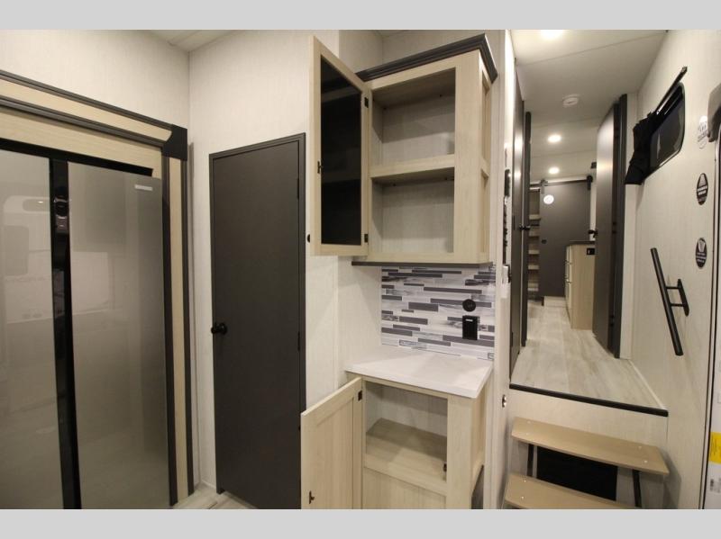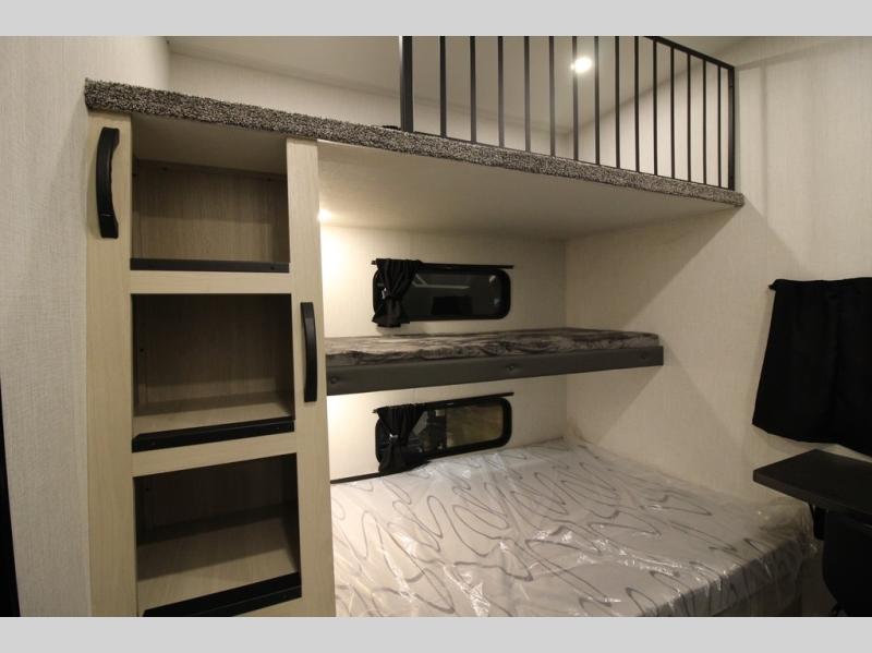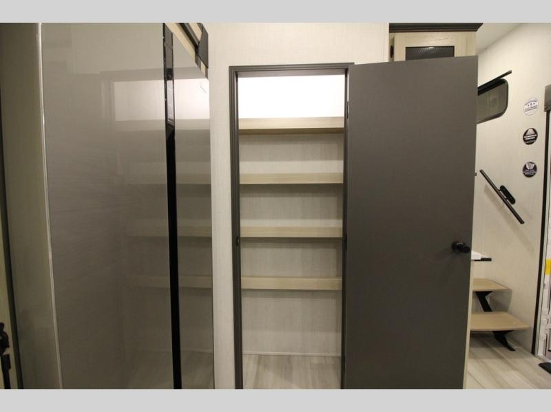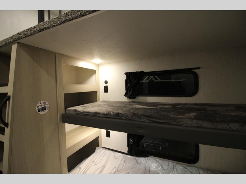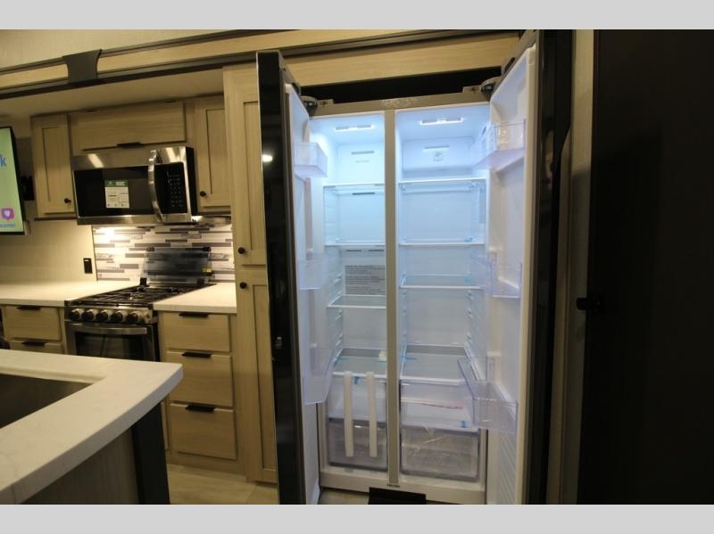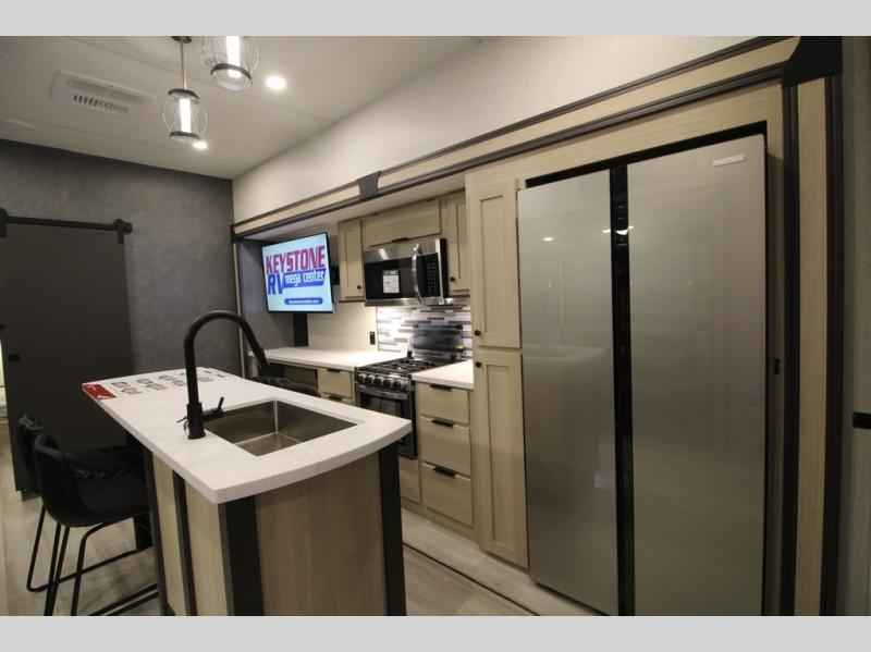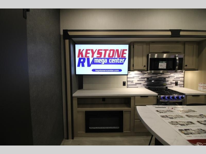 It will be so easy to enjoy extended stays in this spacious fifth wheel! Your guests are sure to love the rear private bunkhouse that includes a 54" x 74" bed below a bunk bed and a loft. This room even features its own full bath for added convenience. The second full bath is up front towards the private bedroom, which the owners can claim as their own. There is a queen bed slide out here, along with a walk-in closet with a wardrobe plus washer and dryer prep. Everyone can meet in the middle kitchen and living area as the chef of your group prepares breakfast on the 21" 2-in-1 oven range! There are also two pantries and a 16-cu. ft. 12V refrigerator to store food, plus a coffee bar where you can set up a drink station. After a day of exploring outdoors, you can relax on the super sofa, which is in direct view of the fireplace and entertainment center!