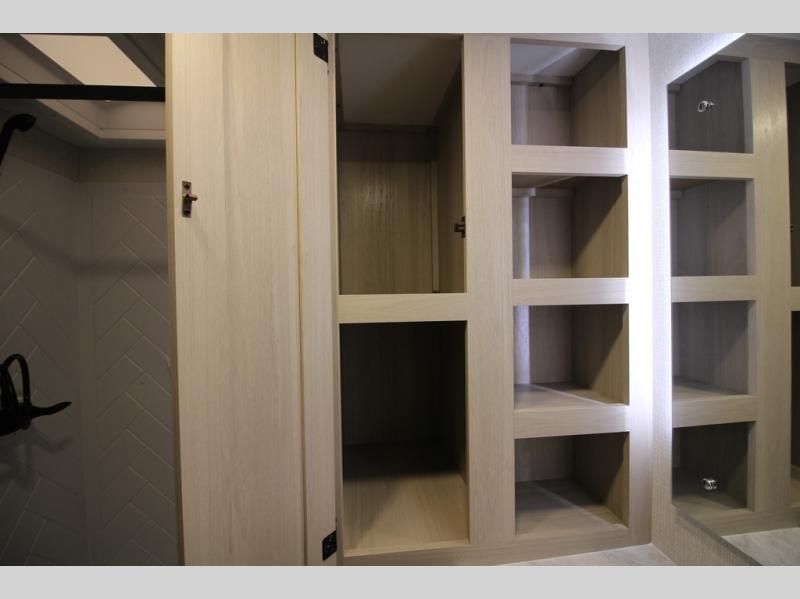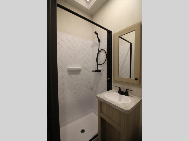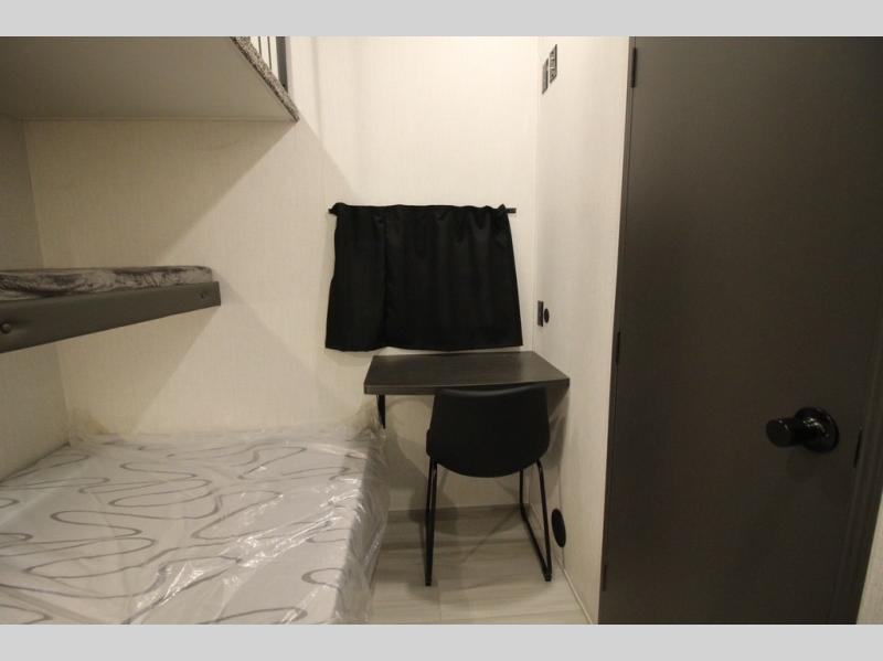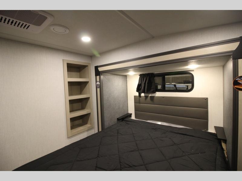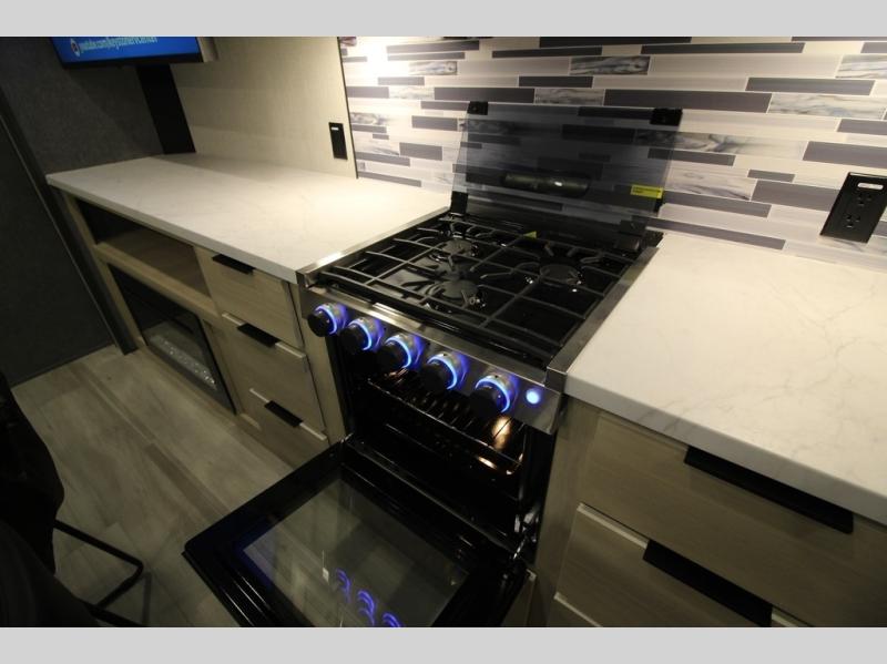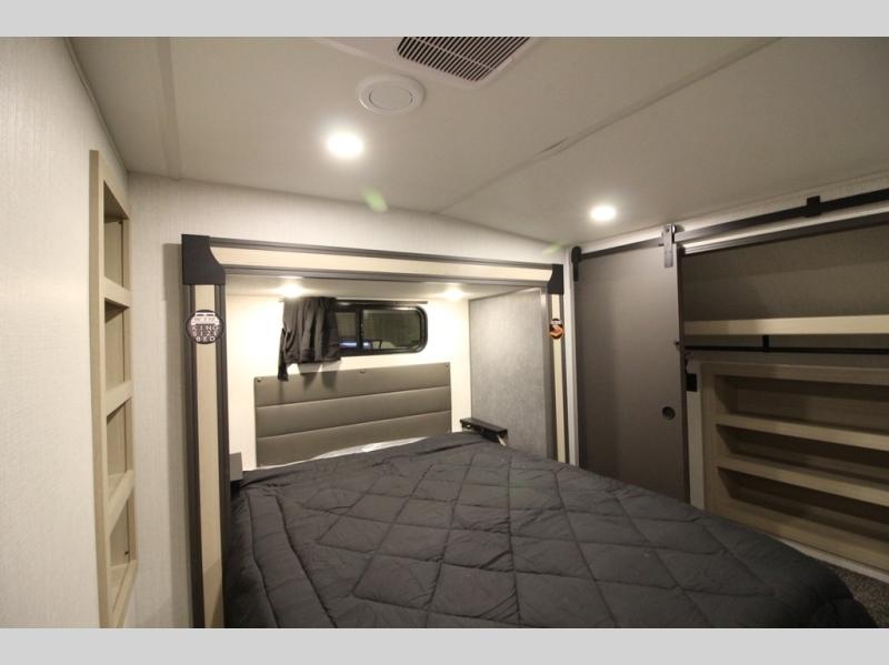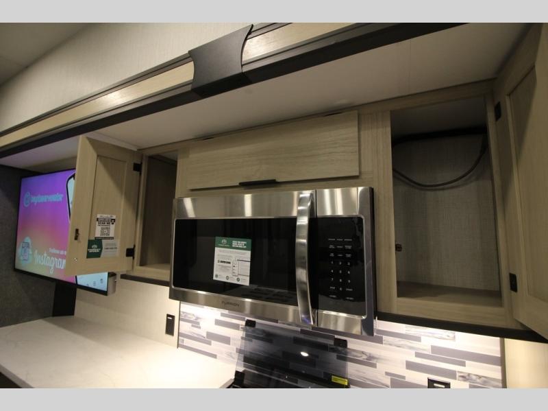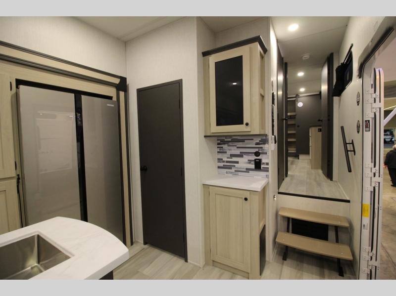 It will be so easy to enjoy extended stays in this spacious fifth wheel! Your guests are sure to love the rear private bunkhouse that includes a 54" x 74" bed below a bunk bed and a loft. This room even features its own full bath for added convenience. The second full bath is up front towards the private bedroom, which the owners can claim as their own. There is a queen bed slide out here, along with a walk-in closet with a wardrobe plus washer and dryer prep. Everyone can meet in the middle kitchen and living area as the chef of your group prepares breakfast on the 21" 2-in-1 oven range! There are also two pantries and a 16-cu. ft. 12V refrigerator to store food, plus a coffee bar where you can set up a drink station. After a day of exploring outdoors, you can relax on the super sofa, which is in direct view of the fireplace and entertainment center!
