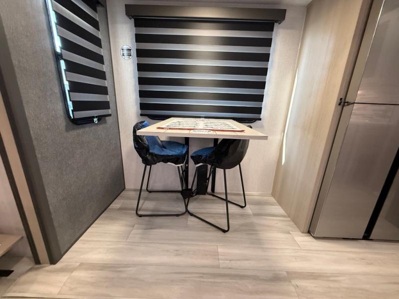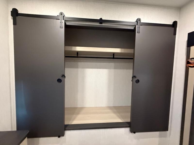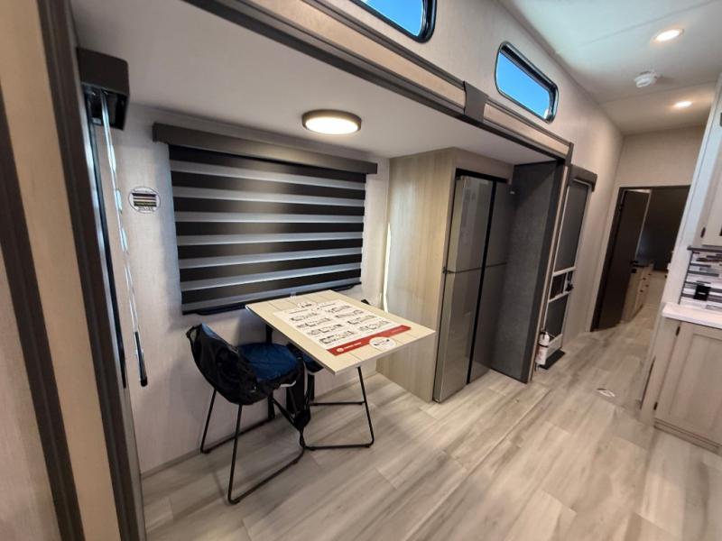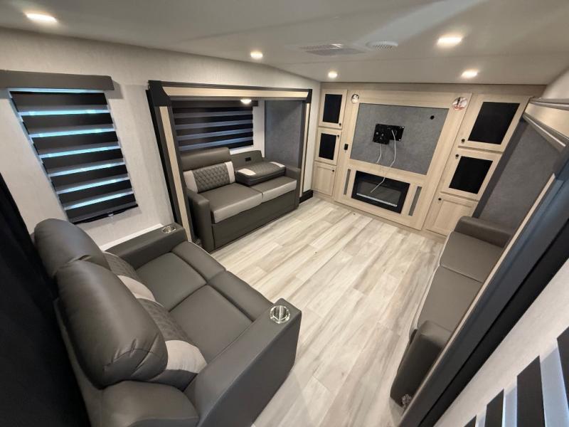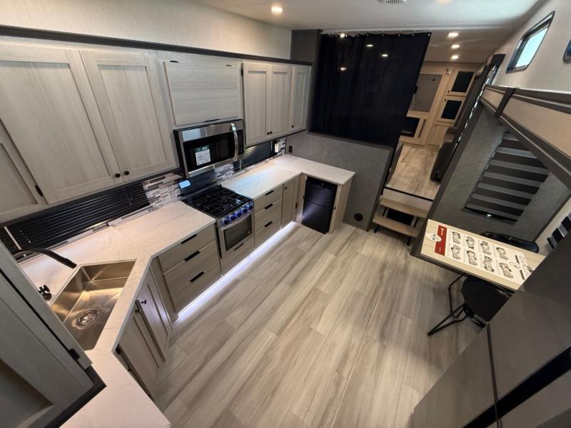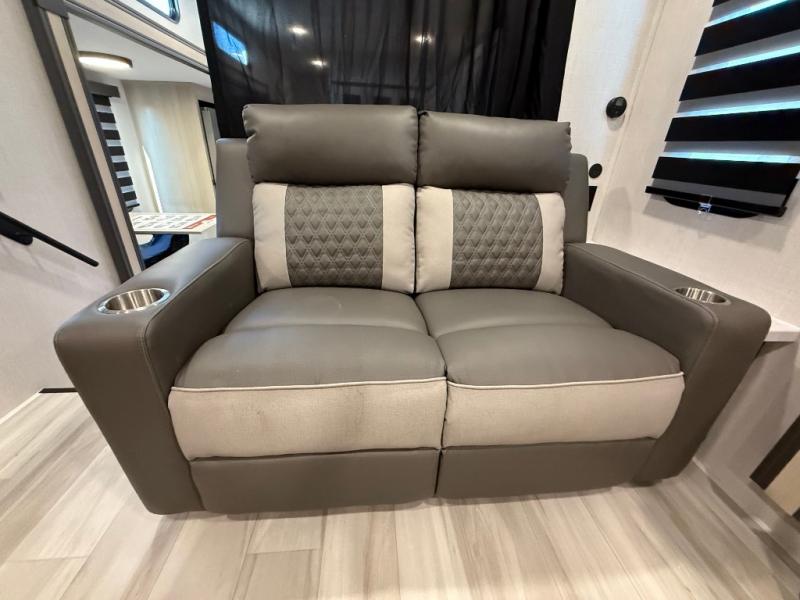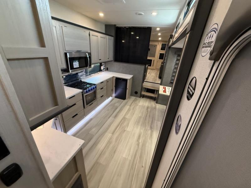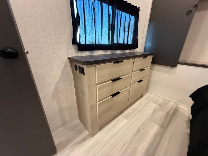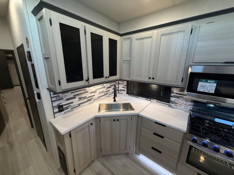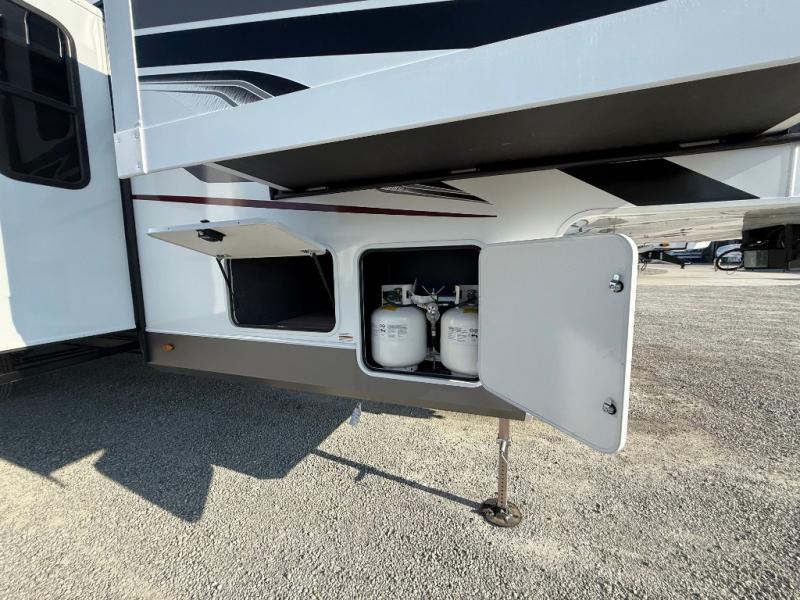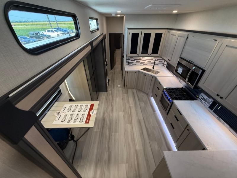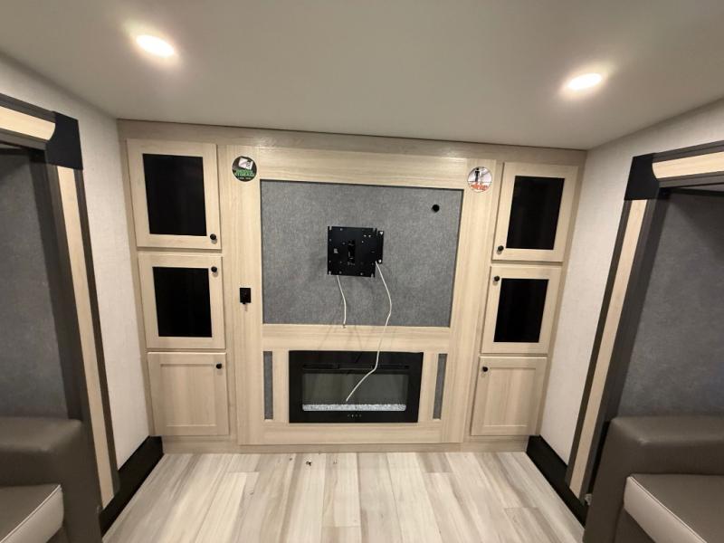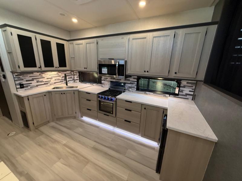 This fifth wheel is packed with features to make each trip enjoyable! The middle kitchen might be your favorite room with wrap-around counter space, a pantry, and a 16 cu. ft. 12V refrigerator for food storage. You can dine at the hi-top table and chairs here, or sit in the front living area on the dual sofas and theater seating! This area can become your guests bedroom at night since there are dual opposing slides and wardrobe storage for their things. You will also find a full-length wardrobe in the rear private bedroom, along with a king bed slide out, plus washer and dryer prep! And of course there is a full bath so everyone can stay clean each day!