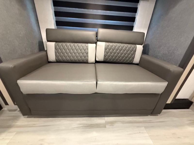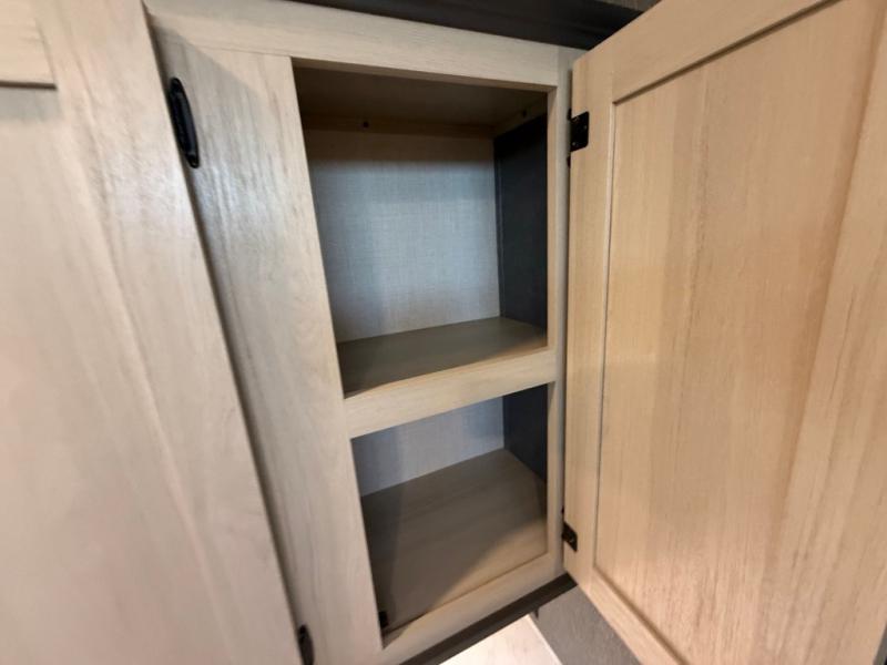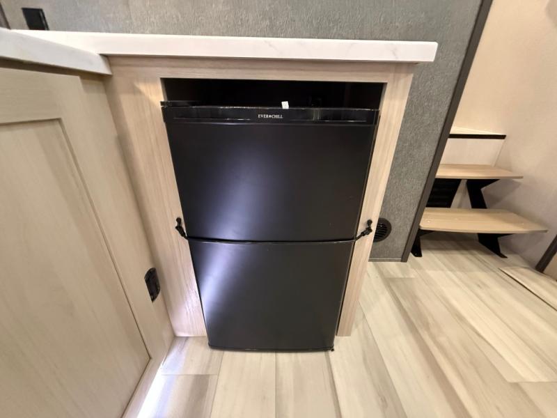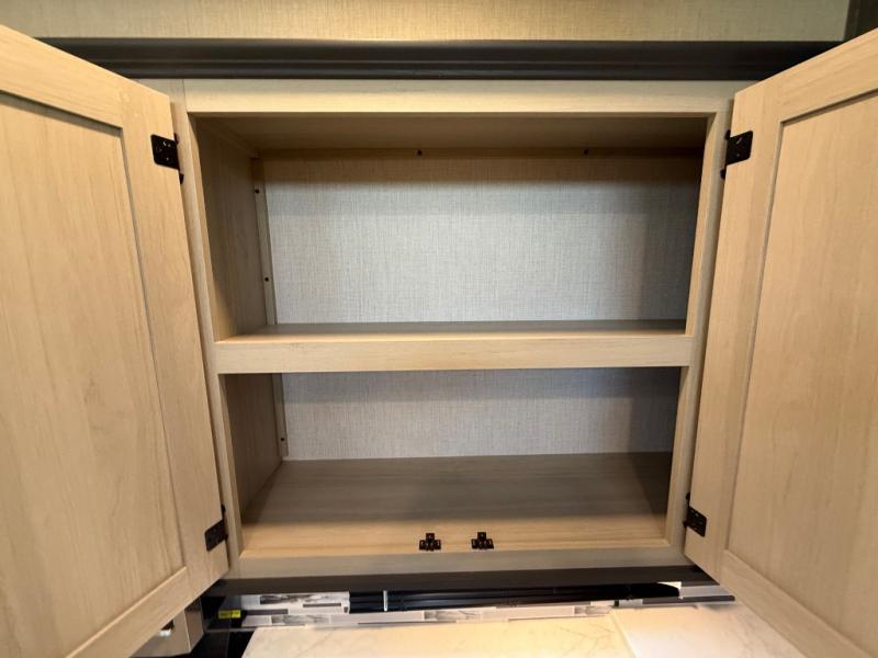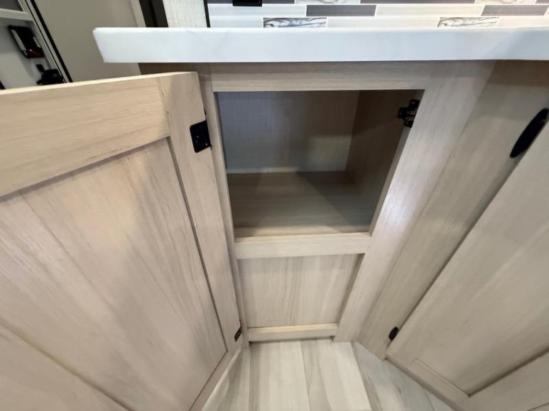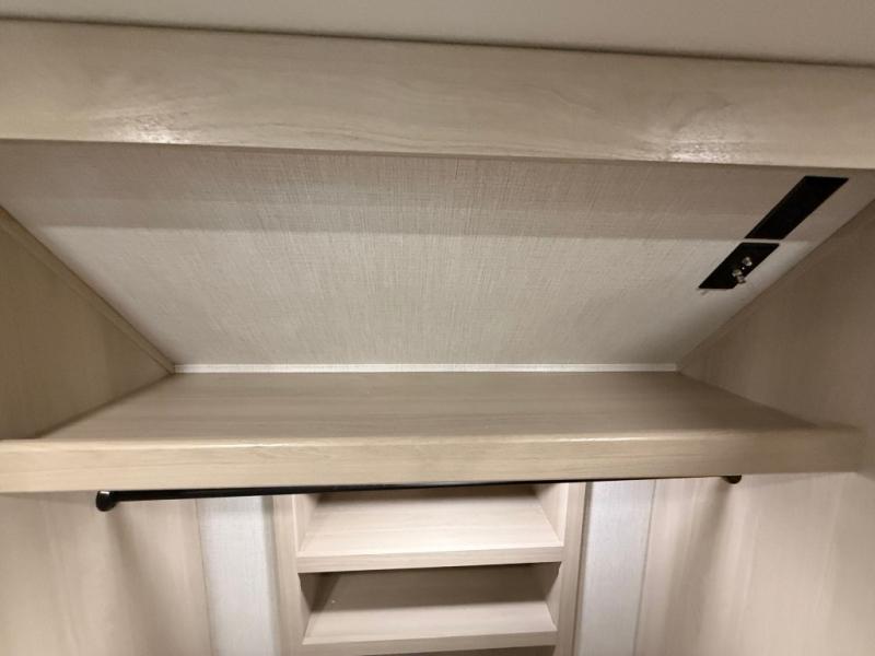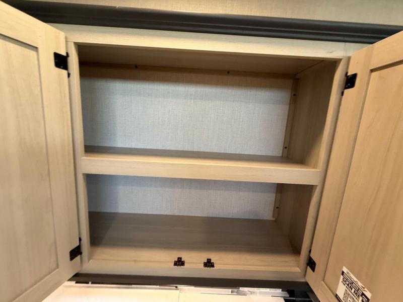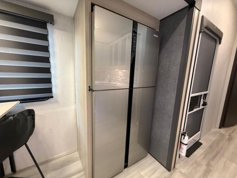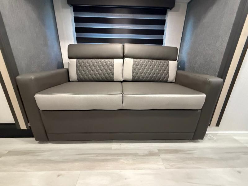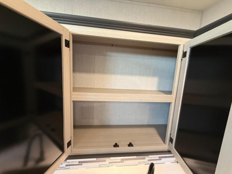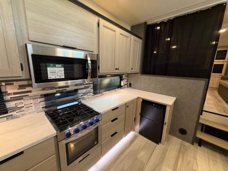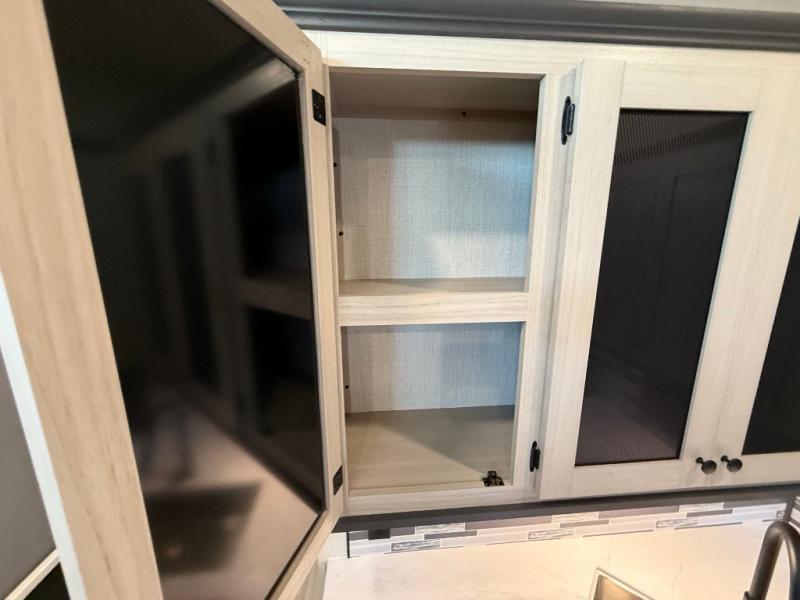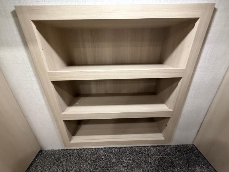This fifth wheel is packed with features to make each trip enjoyable! The middle kitchen might be your favorite room with wrap-around counter space, a pantry, and a 16 cu. ft. 12V refrigerator for food storage. You can dine at the hi-top table and chairs here, or sit in the front living area on the dual sofas and theater seating! This area can become your guests bedroom at night since there are dual opposing slides and wardrobe storage for their things. You will also find a full-length wardrobe in the rear private bedroom, along with a king bed slide out, plus washer and dryer prep! And of course there is a full bath so everyone can stay clean each day!