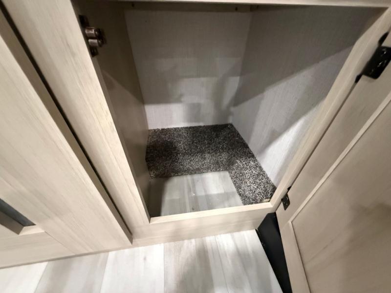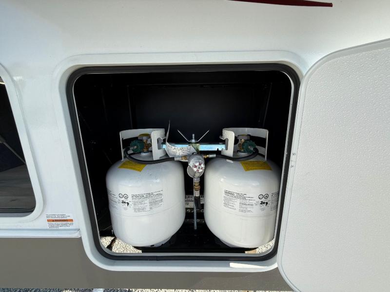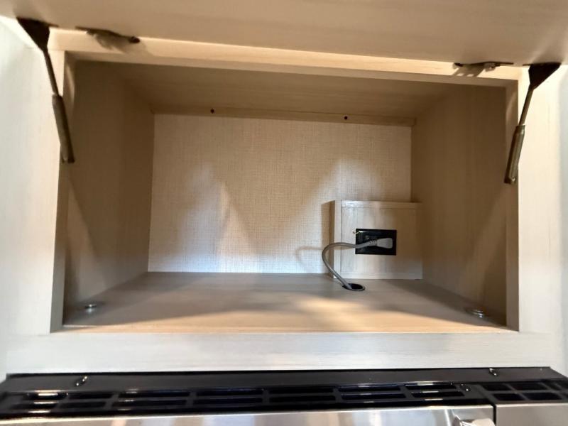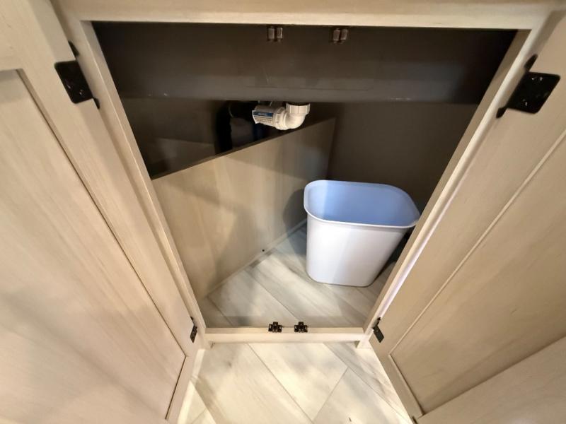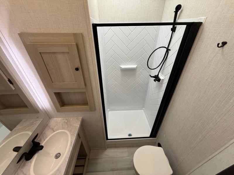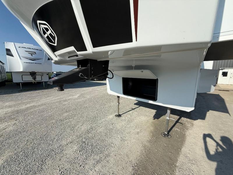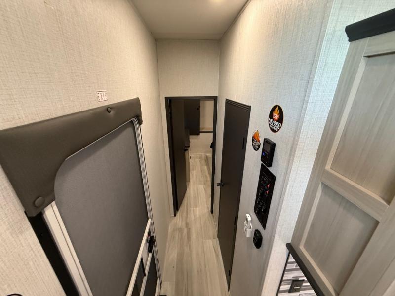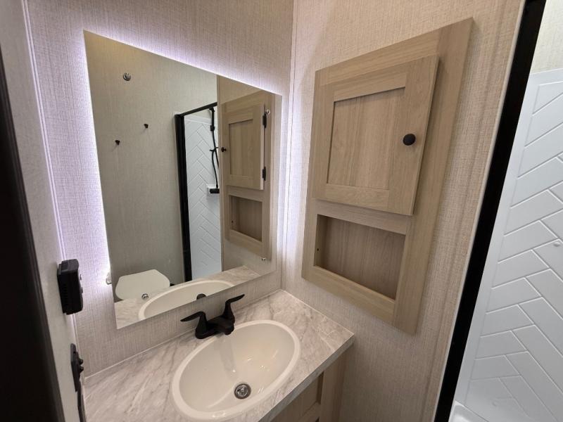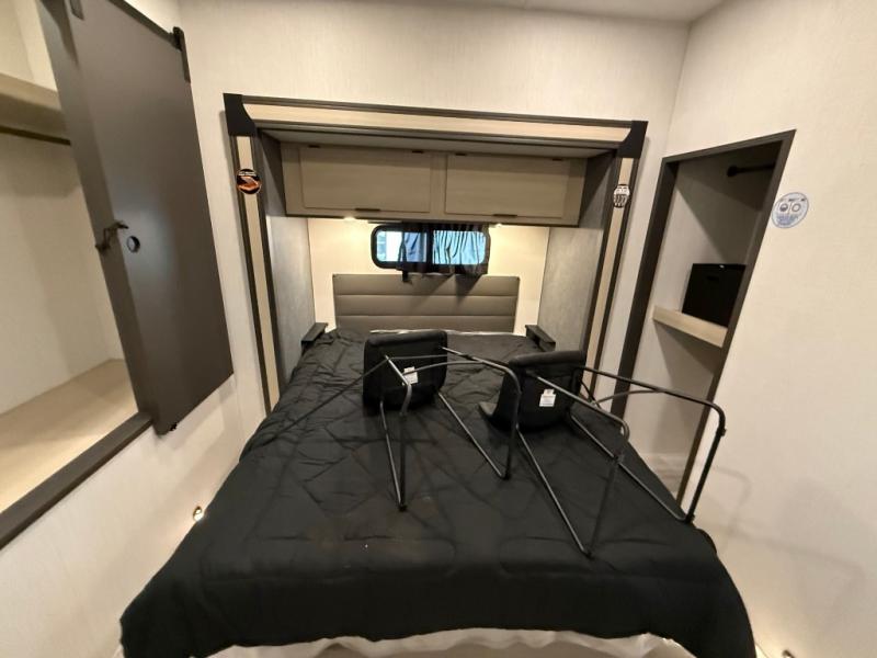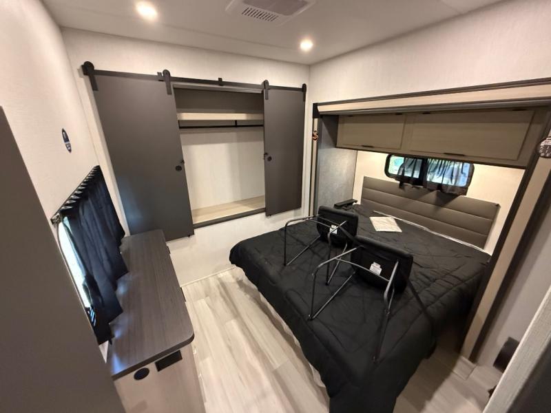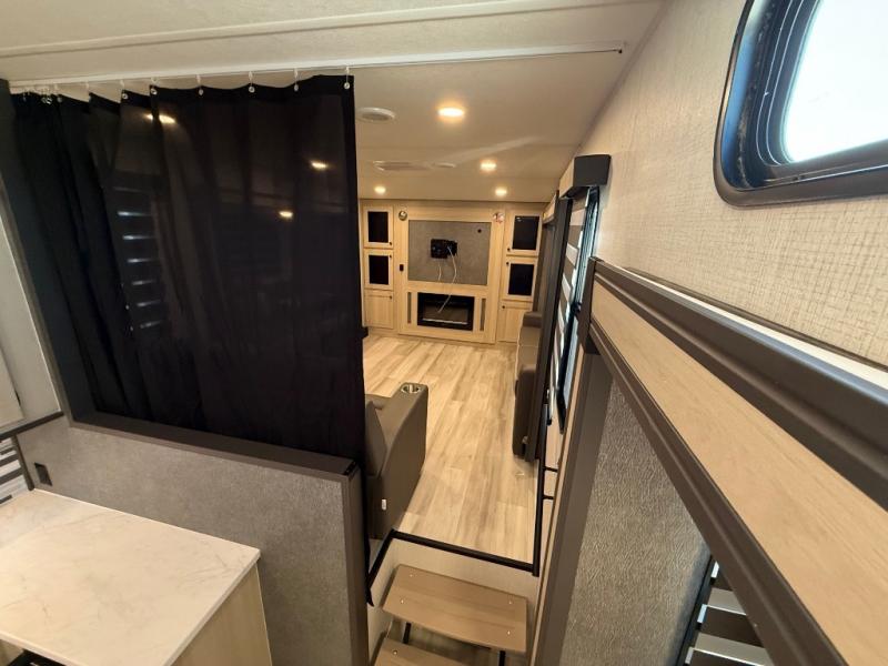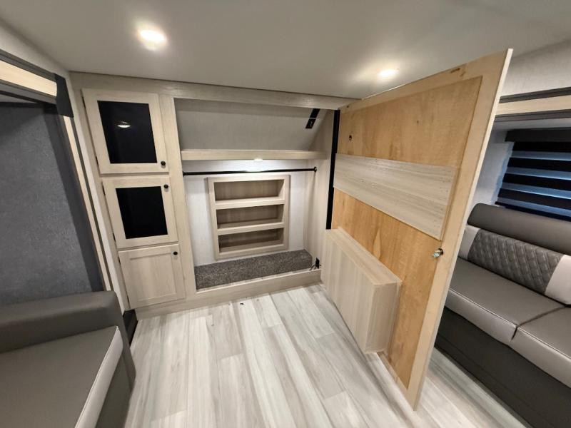 This fifth wheel is packed with features to make each trip enjoyable! The middle kitchen might be your favorite room with wrap-around counter space, a pantry, and a 16 cu. ft. 12V refrigerator for food storage. You can dine at the hi-top table and chairs here, or sit in the front living area on the dual sofas and theater seating! This area can become your guests bedroom at night since there are dual opposing slides and wardrobe storage for their things. You will also find a full-length wardrobe in the rear private bedroom, along with a king bed slide out, plus washer and dryer prep! And of course there is a full bath so everyone can stay clean each day!