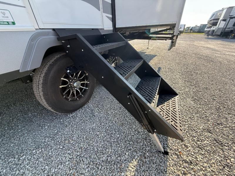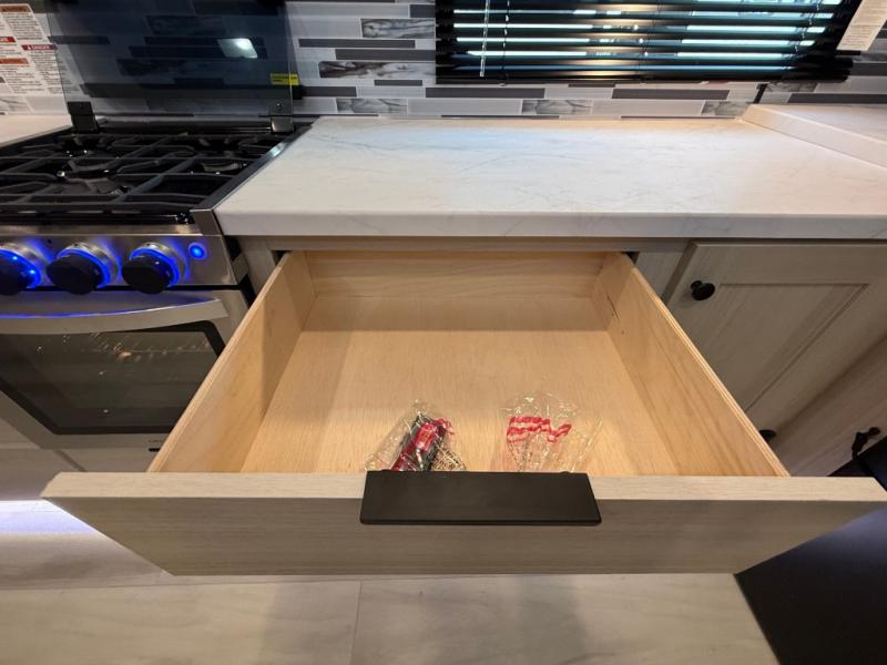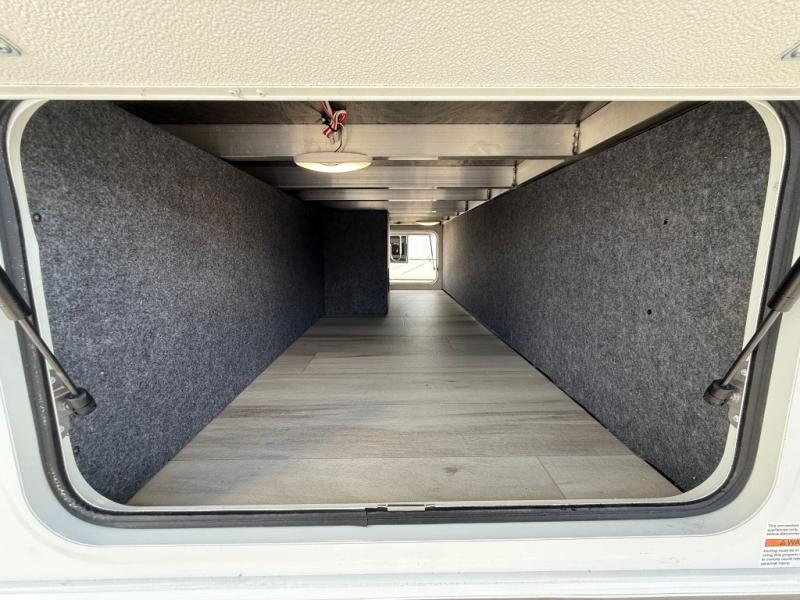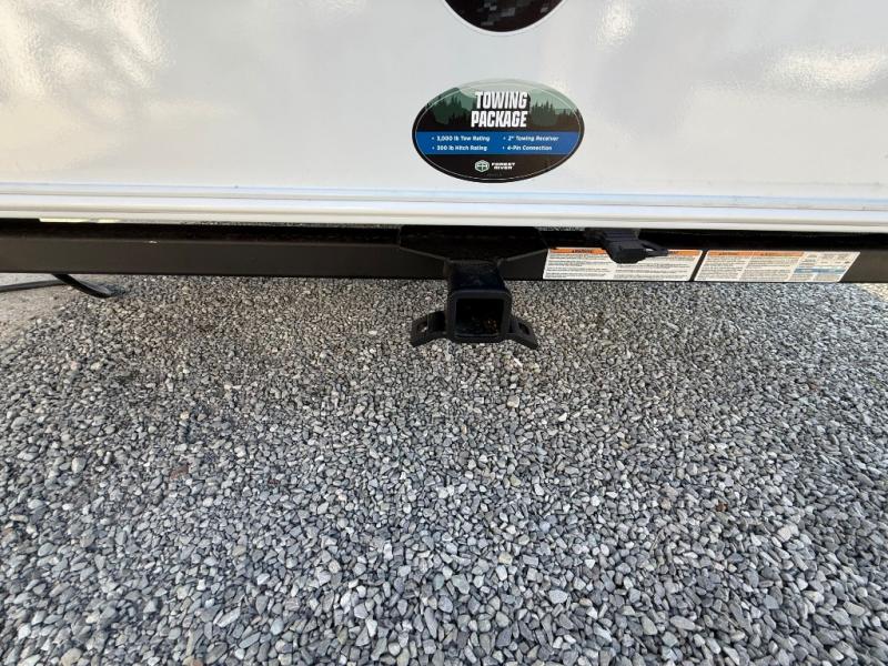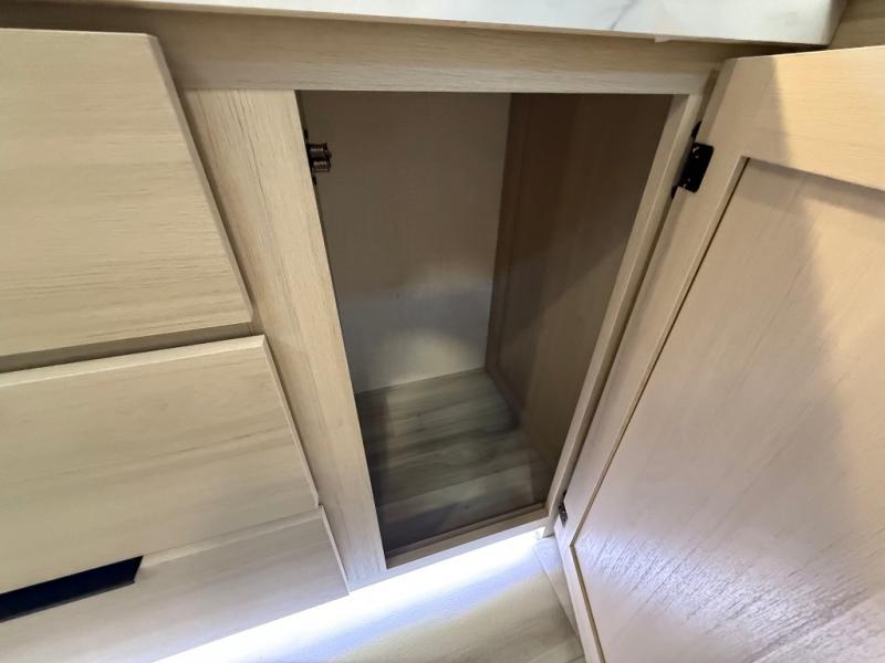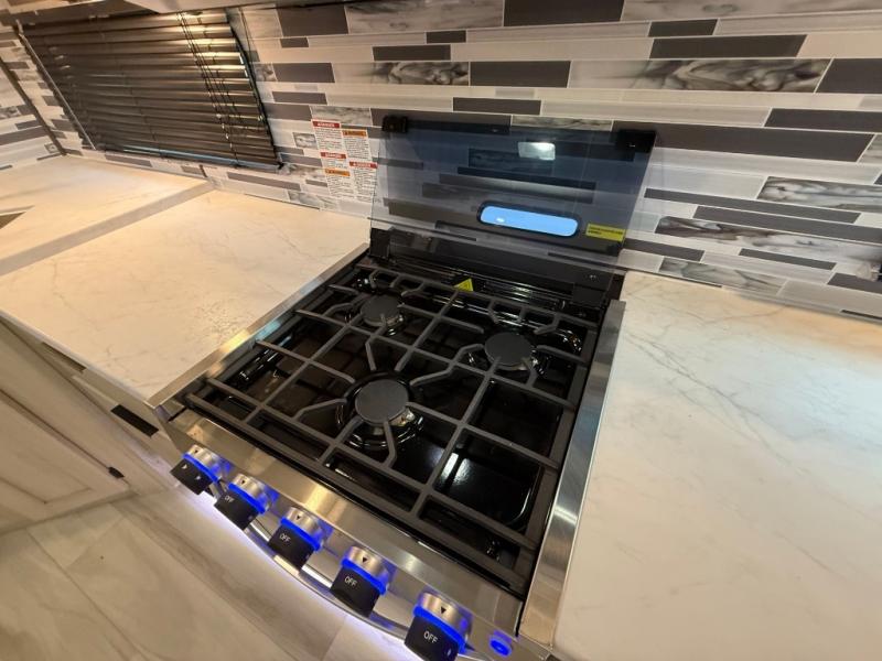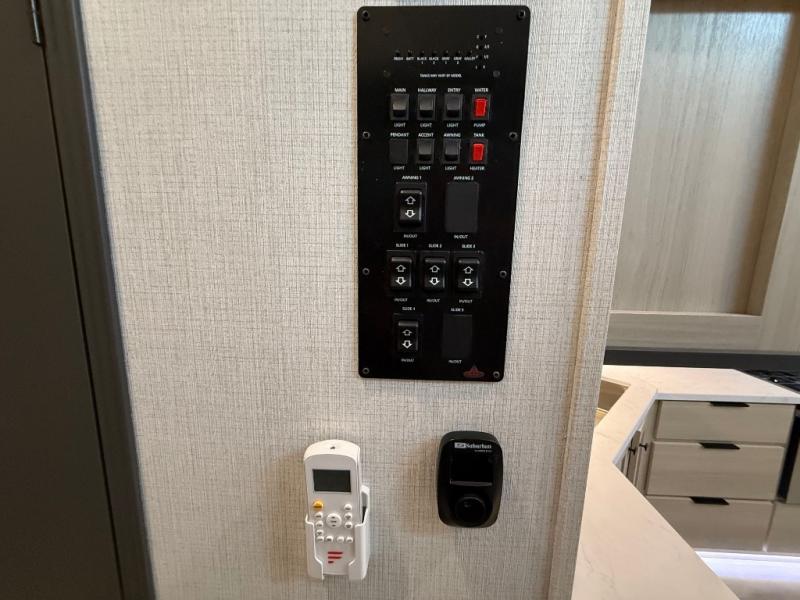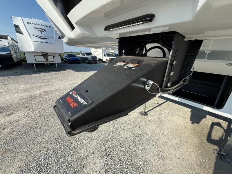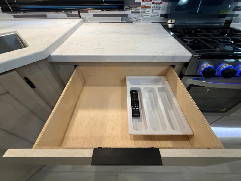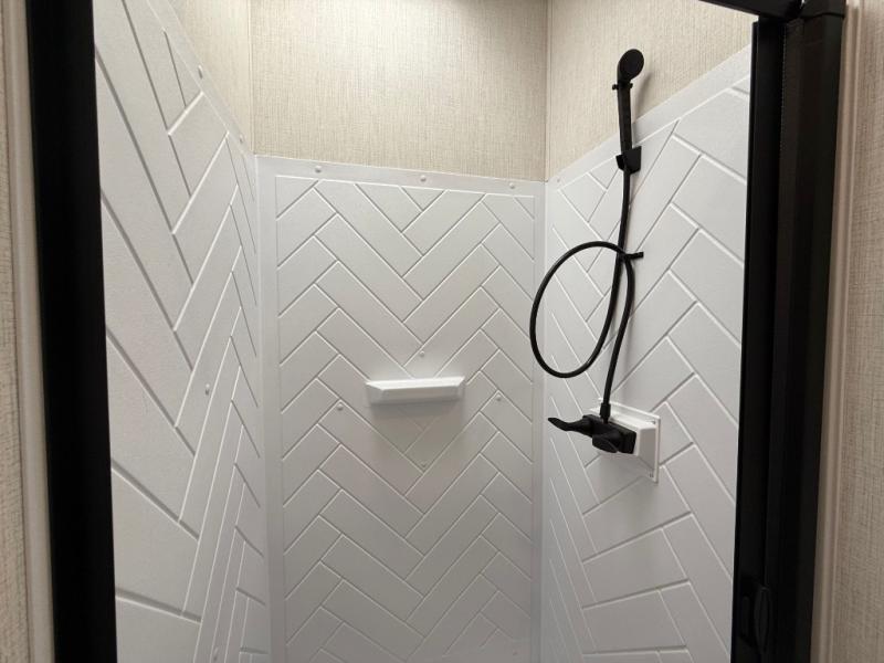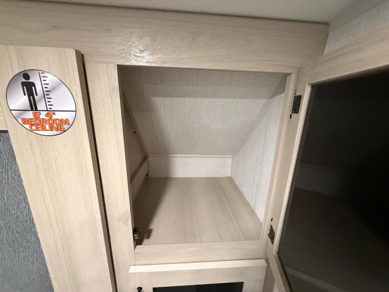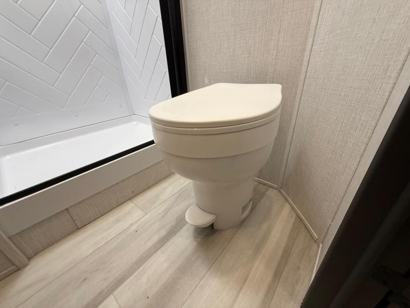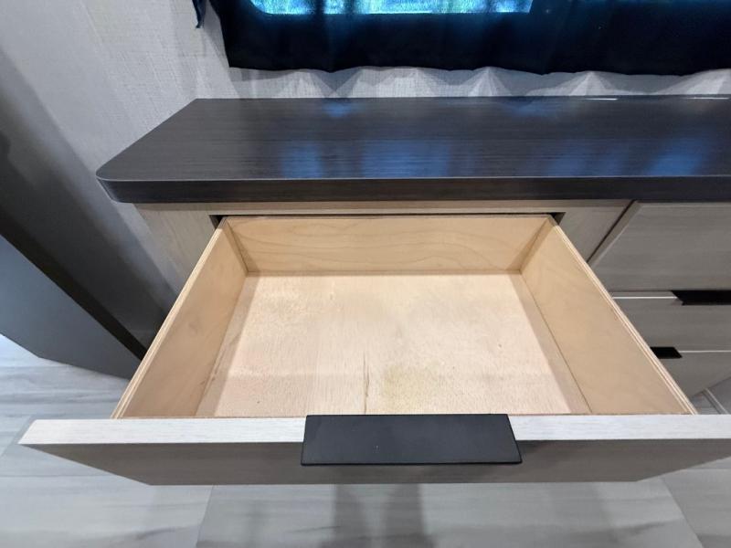 This fifth wheel is packed with features to make each trip enjoyable! The middle kitchen might be your favorite room with wrap-around counter space, a pantry, and a 16 cu. ft. 12V refrigerator for food storage. You can dine at the hi-top table and chairs here, or sit in the front living area on the dual sofas and theater seating! This area can become your guests bedroom at night since there are dual opposing slides and wardrobe storage for their things. You will also find a full-length wardrobe in the rear private bedroom, along with a king bed slide out, plus washer and dryer prep! And of course there is a full bath so everyone can stay clean each day!