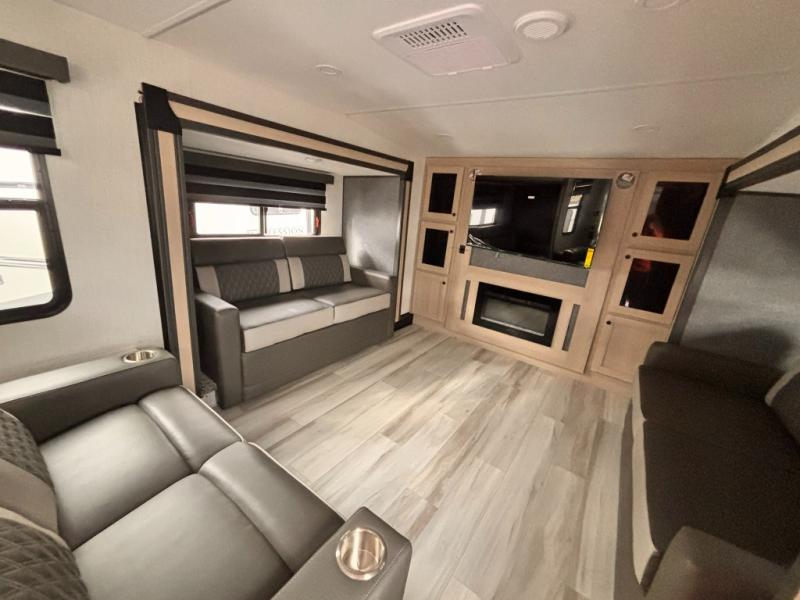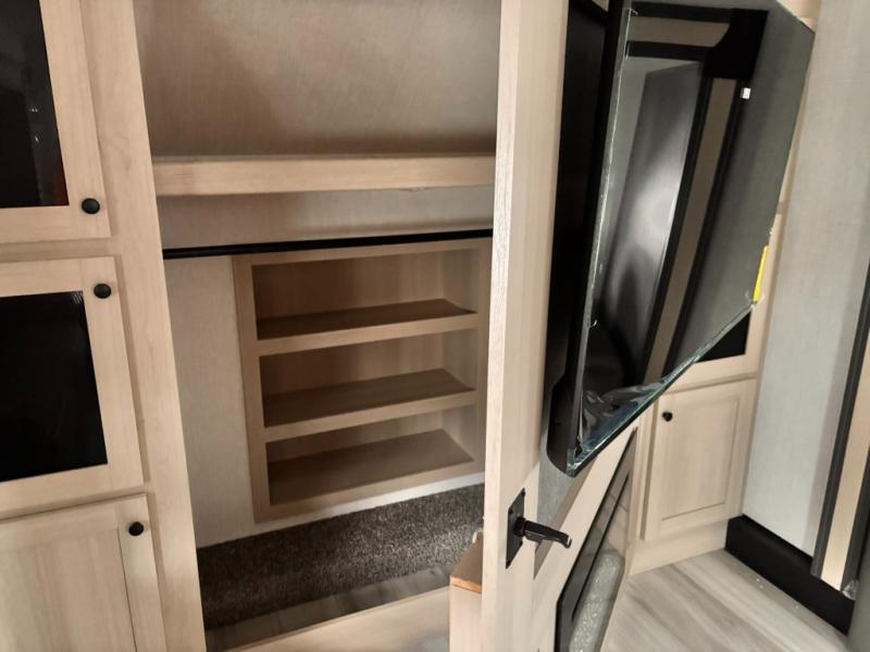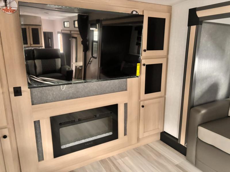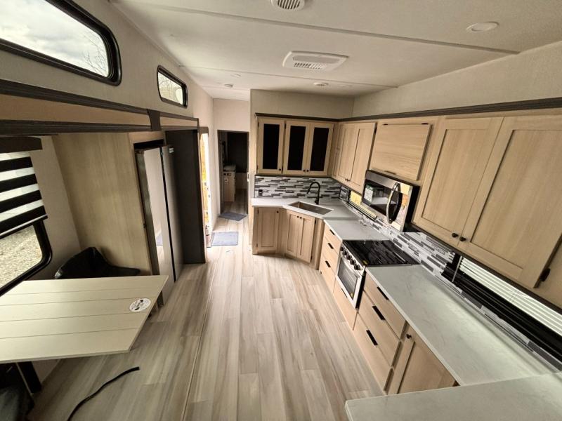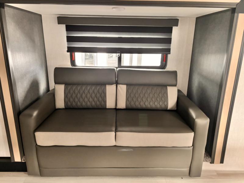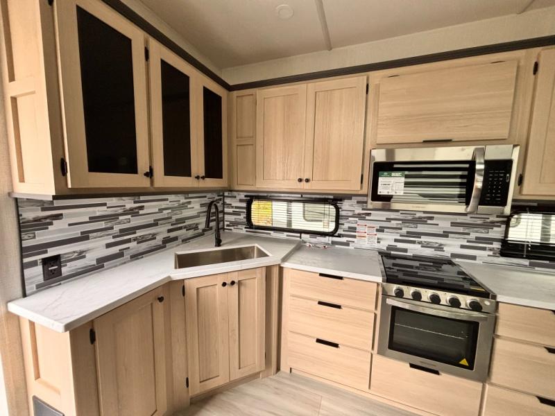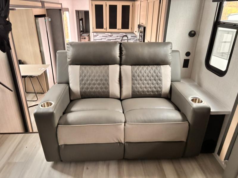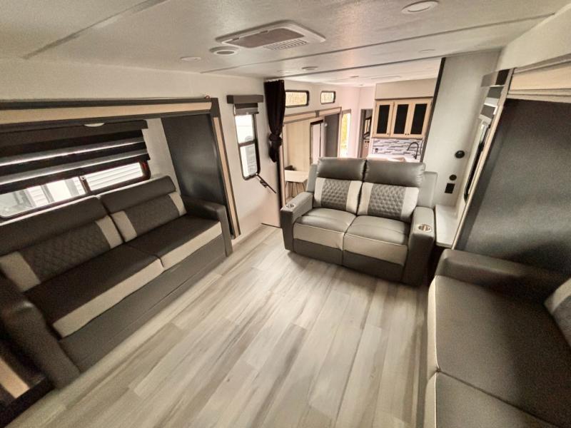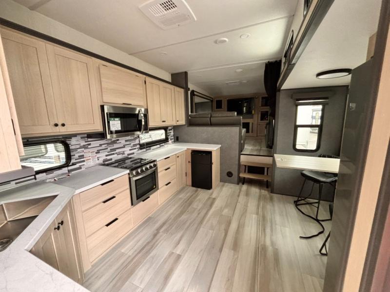 This fifth wheel is packed with features to make each trip enjoyable! The middle kitchen might be your favorite room with wrap-around counter space, a pantry, and a 16 cu. ft. 12V refrigerator for food storage. You can dine at the hi-top table and chairs here, or sit in the front living area on the dual sofas and theater seating! This area can become your guests bedroom at night since there are dual opposing slides and wardrobe storage for their things. You will also find a full-length wardrobe in the rear private bedroom, along with a king bed slide out, plus washer and dryer prep! And of course there is a full bath so everyone can stay clean each day!