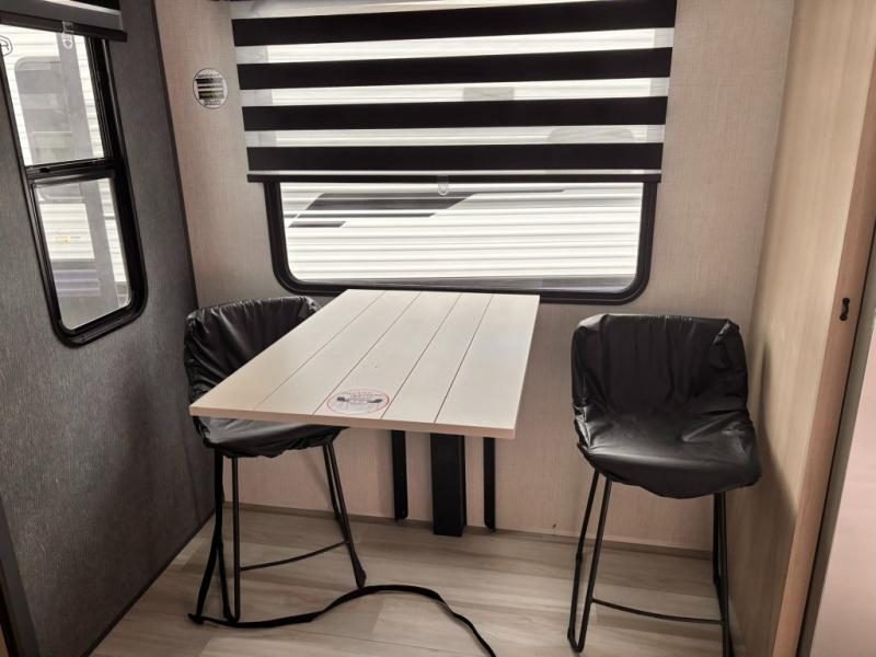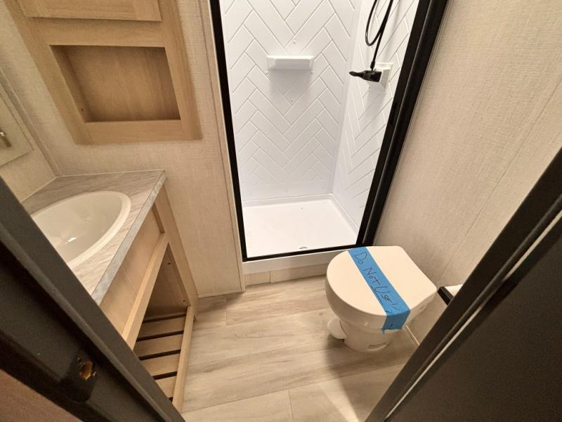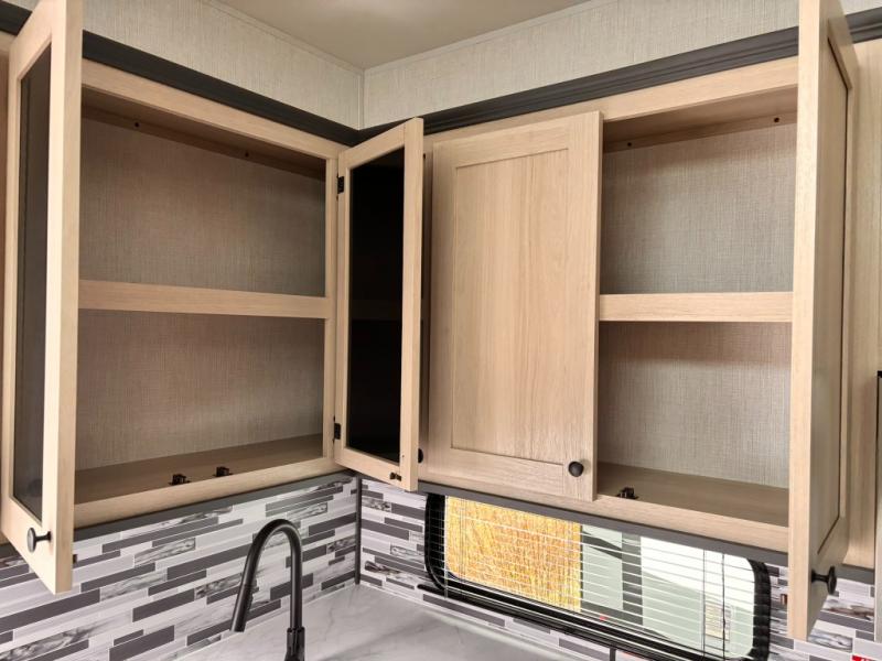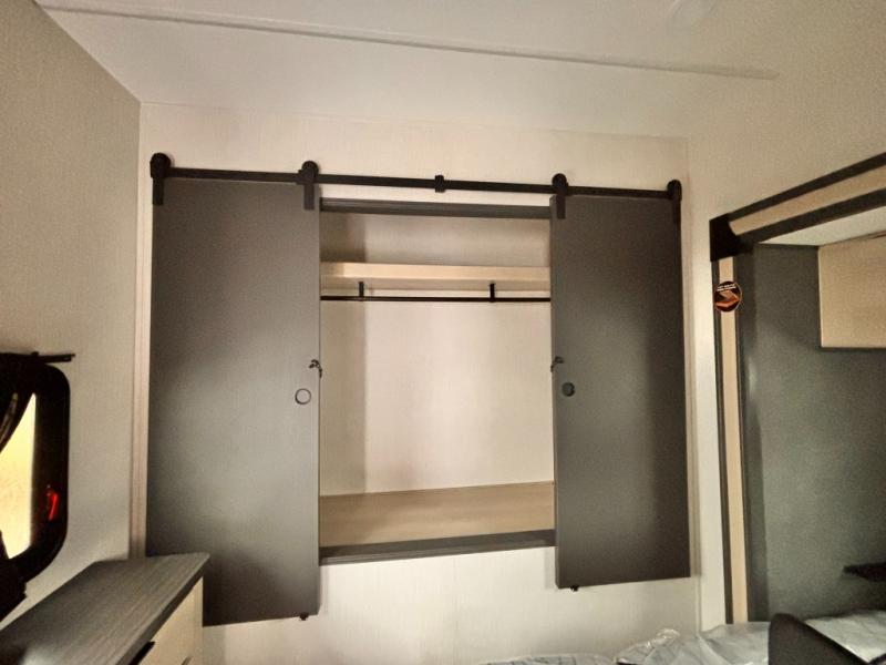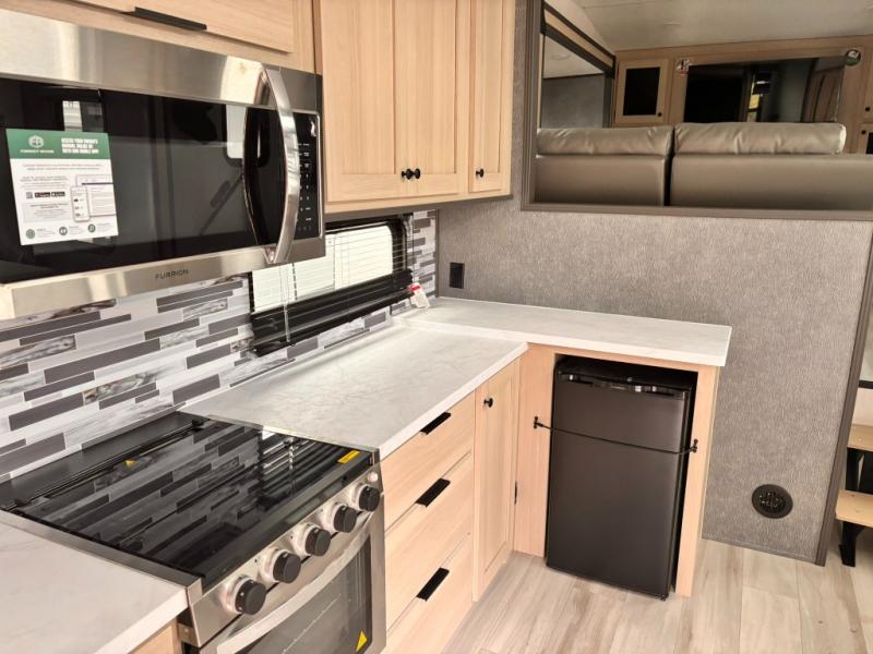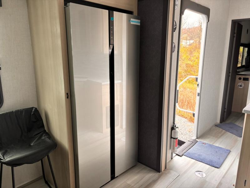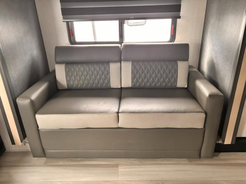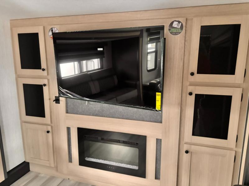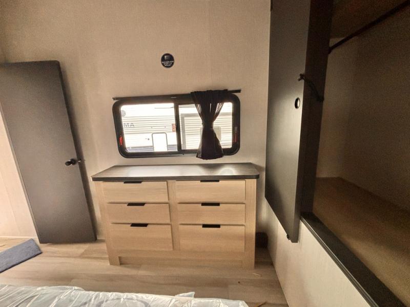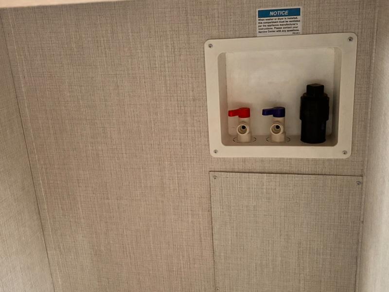This fifth wheel is packed with features to make each trip enjoyable! The middle kitchen might be your favorite room with wrap-around counter space, a pantry, and a 16 cu. ft. 12V refrigerator for food storage. You can dine at the hi-top table and chairs here, or sit in the front living area on the dual sofas and theater seating! This area can become your guests bedroom at night since there are dual opposing slides and wardrobe storage for their things. You will also find a full-length wardrobe in the rear private bedroom, along with a king bed slide out, plus washer and dryer prep! And of course there is a full bath so everyone can stay clean each day!