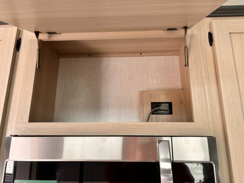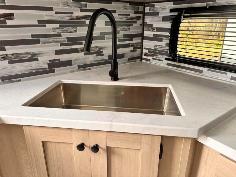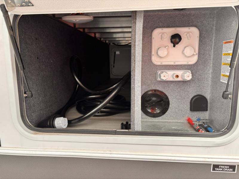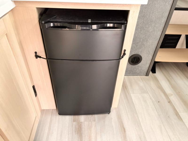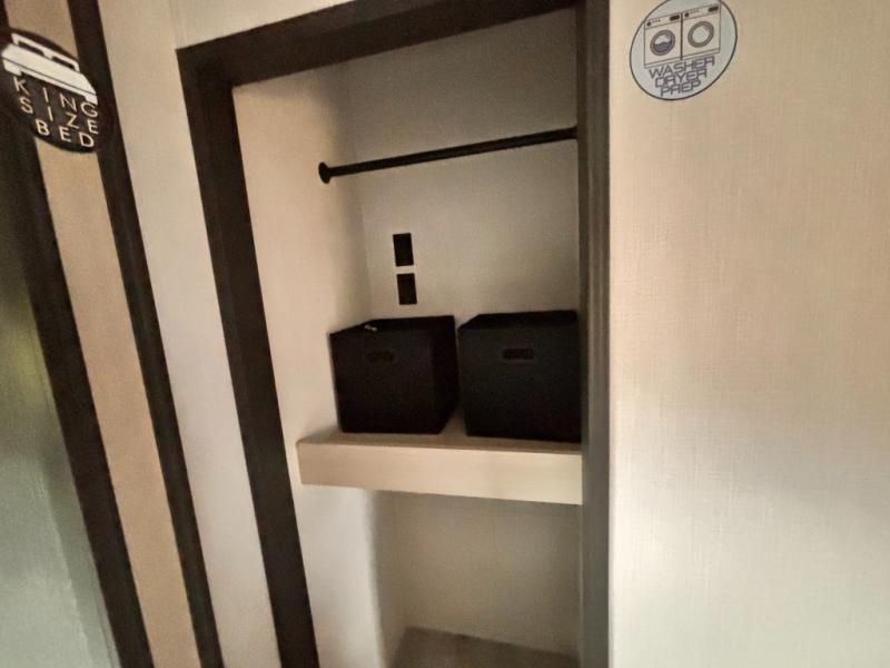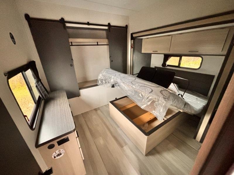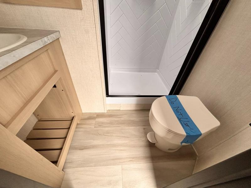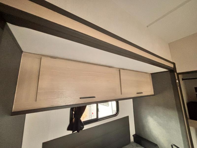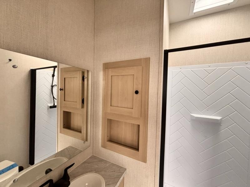 This fifth wheel is packed with features to make each trip enjoyable! The middle kitchen might be your favorite room with wrap-around counter space, a pantry, and a 16 cu. ft. 12V refrigerator for food storage. You can dine at the hi-top table and chairs here, or sit in the front living area on the dual sofas and theater seating! This area can become your guests bedroom at night since there are dual opposing slides and wardrobe storage for their things. You will also find a full-length wardrobe in the rear private bedroom, along with a king bed slide out, plus washer and dryer prep! And of course there is a full bath so everyone can stay clean each day!