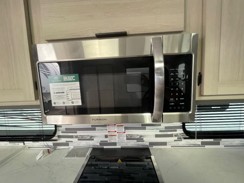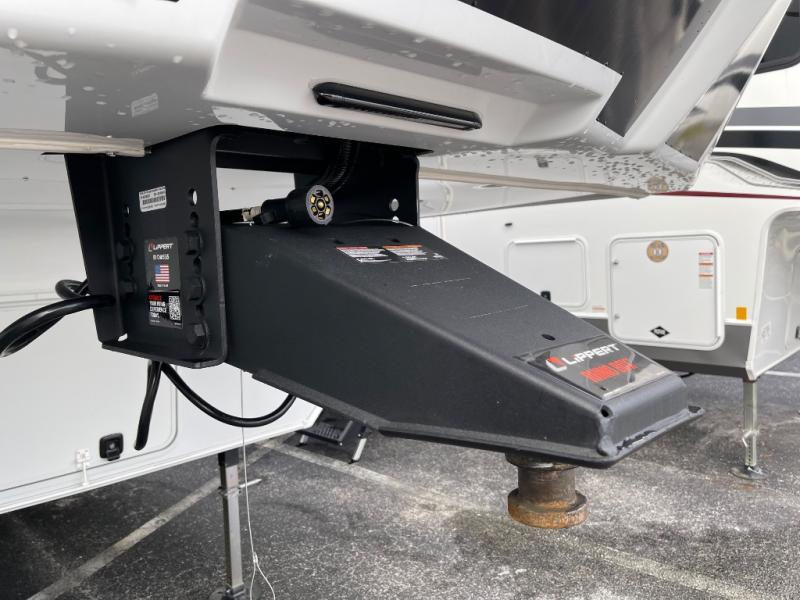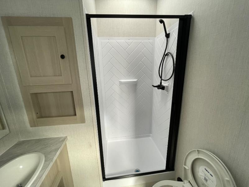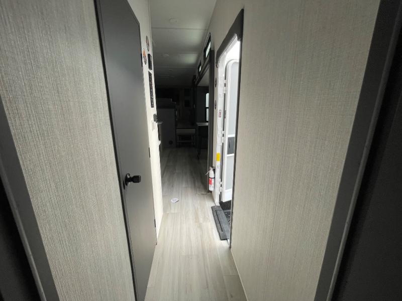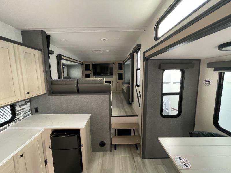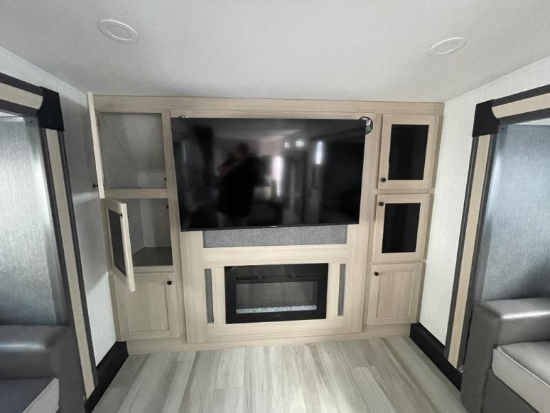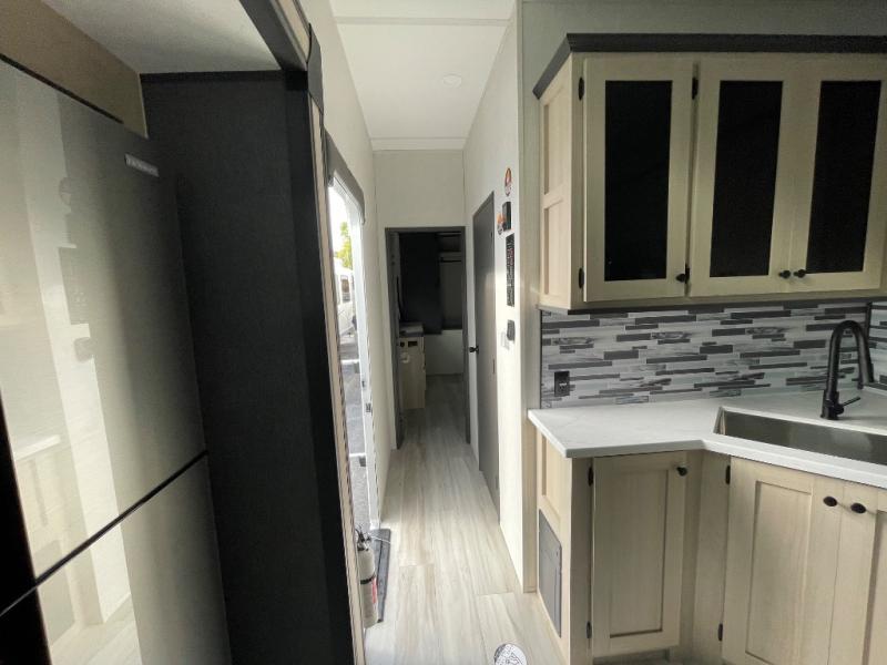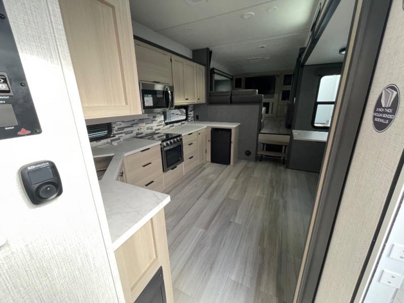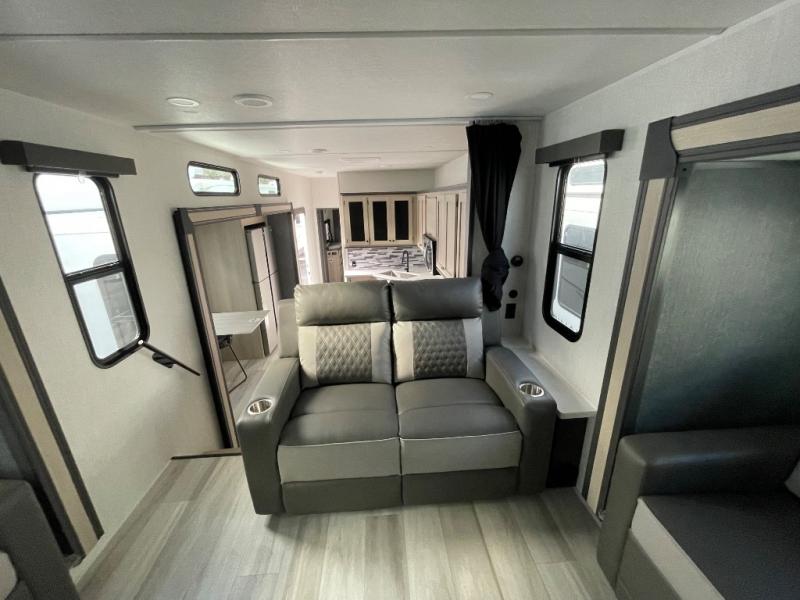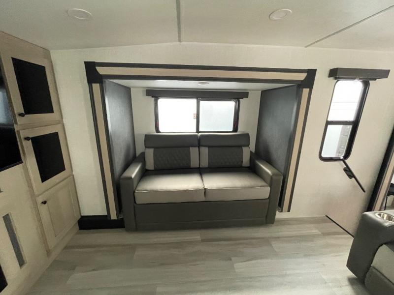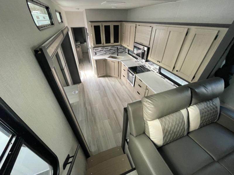 This fifth wheel is packed with features to make each trip enjoyable! The middle kitchen might be your favorite room with wrap-around counter space, a pantry, and a 16 cu. ft. 12V refrigerator for food storage. You can dine at the hi-top table and chairs here, or sit in the front living area on the dual sofas and theater seating! This area can become your guests bedroom at night since there are dual opposing slides and wardrobe storage for their things. You will also find a full-length wardrobe in the rear private bedroom, along with a king bed slide out, plus washer and dryer prep! And of course there is a full bath so everyone can stay clean each day!