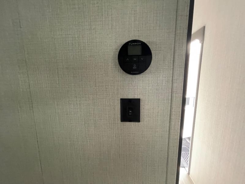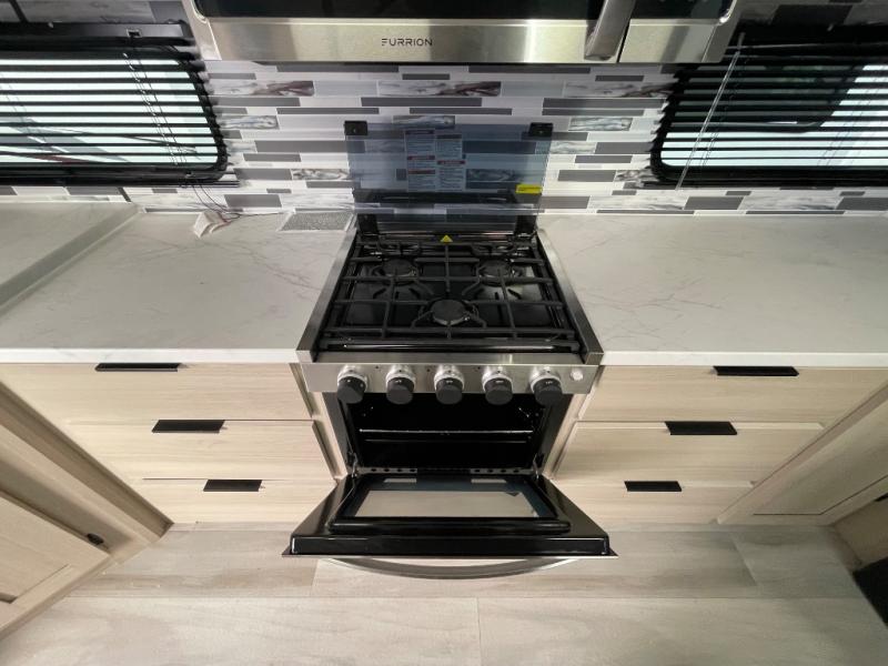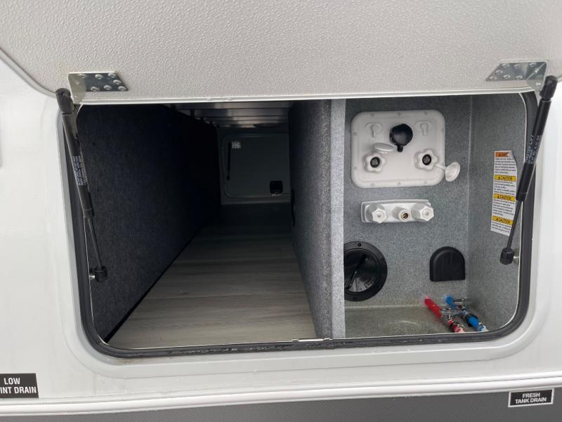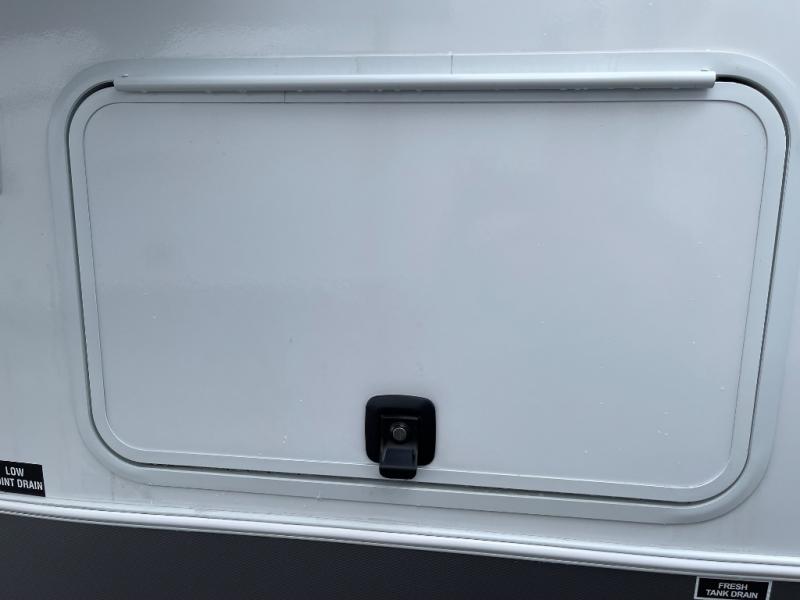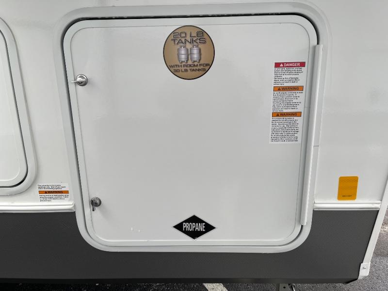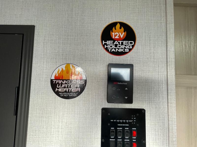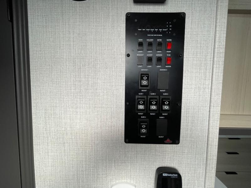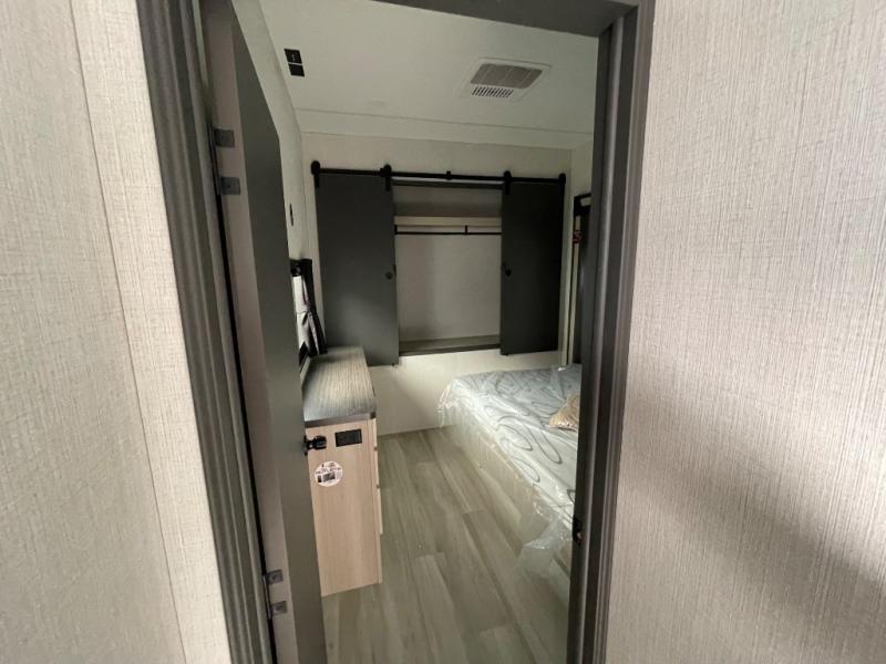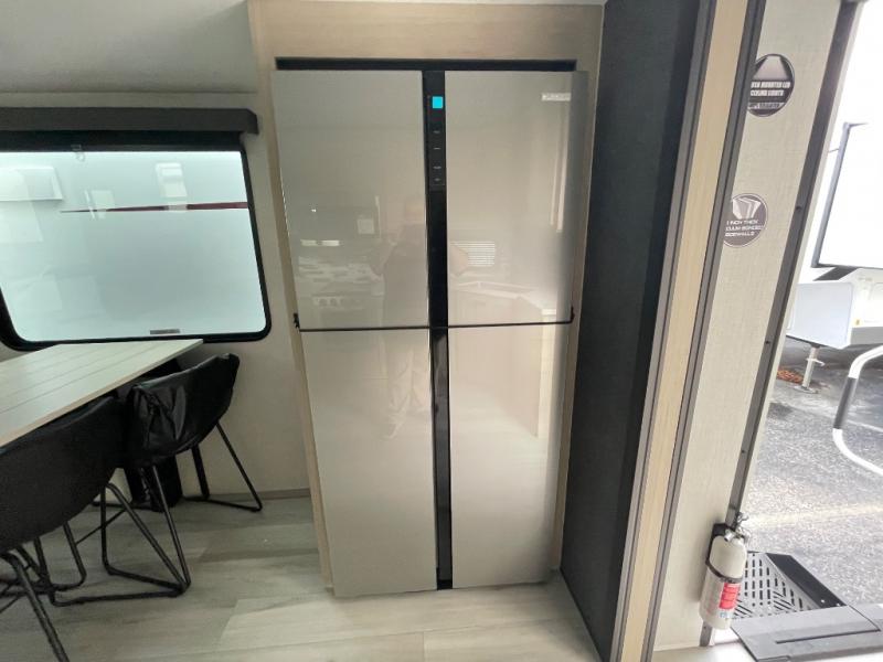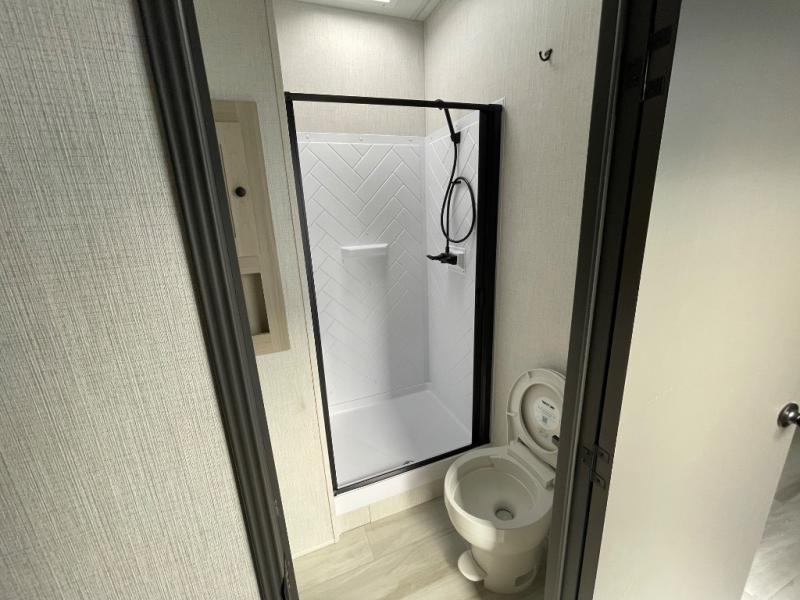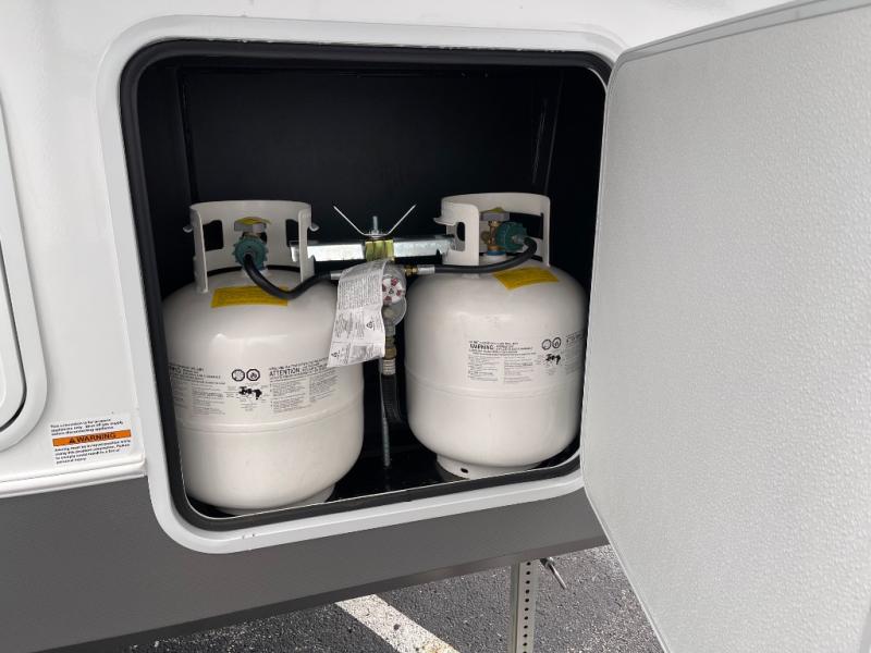 This fifth wheel is packed with features to make each trip enjoyable! The middle kitchen might be your favorite room with wrap-around counter space, a pantry, and a 16 cu. ft. 12V refrigerator for food storage. You can dine at the hi-top table and chairs here, or sit in the front living area on the dual sofas and theater seating! This area can become your guests bedroom at night since there are dual opposing slides and wardrobe storage for their things. You will also find a full-length wardrobe in the rear private bedroom, along with a king bed slide out, plus washer and dryer prep! And of course there is a full bath so everyone can stay clean each day!