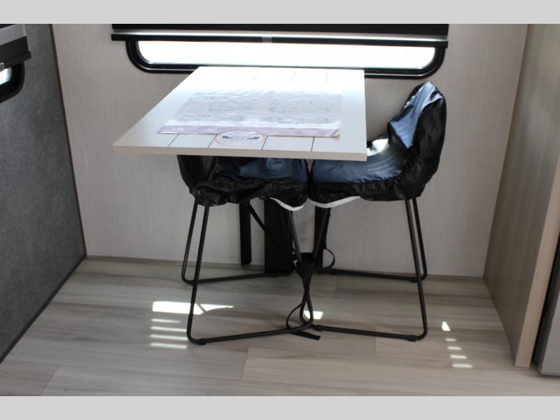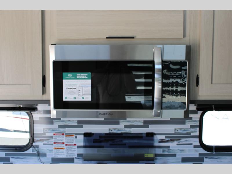 This fifth wheel is packed with features to make each trip enjoyable! The middle kitchen might be your favorite room with wrap-around counter space, a pantry, and a 16 cu. ft. 12V refrigerator for food storage. You can dine at the hi-top table and chairs here, or sit in the front living area on the dual sofas and theater seating! This area can become your guests bedroom at night since there are dual opposing slides and wardrobe storage for their things. You will also find a full-length wardrobe in the rear private bedroom, along with a king bed slide out, plus washer and dryer prep! And of course there is a full bath so everyone can stay clean each day!